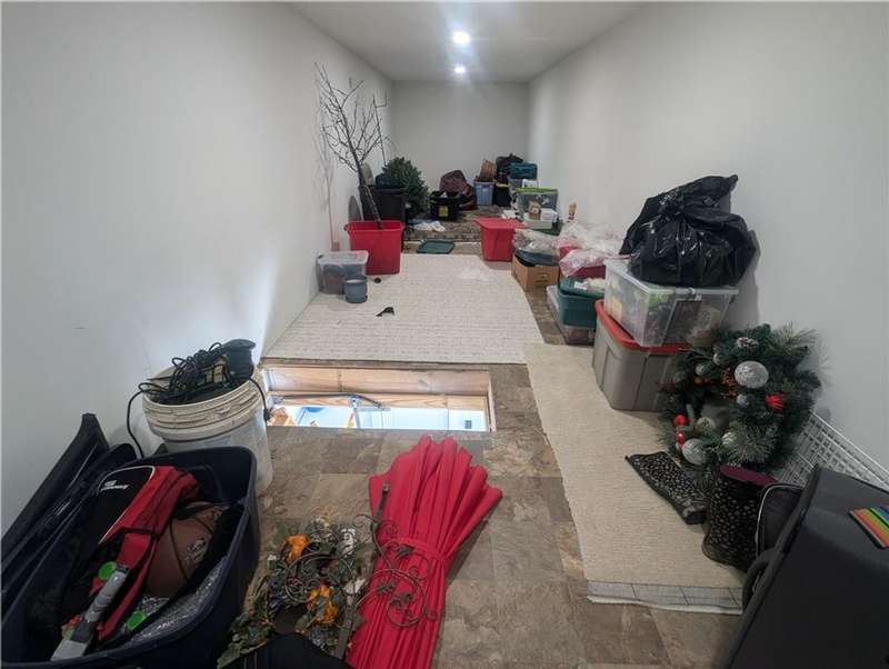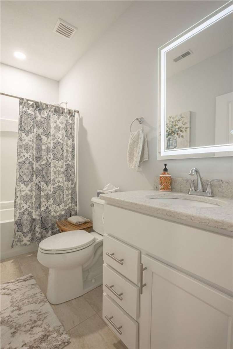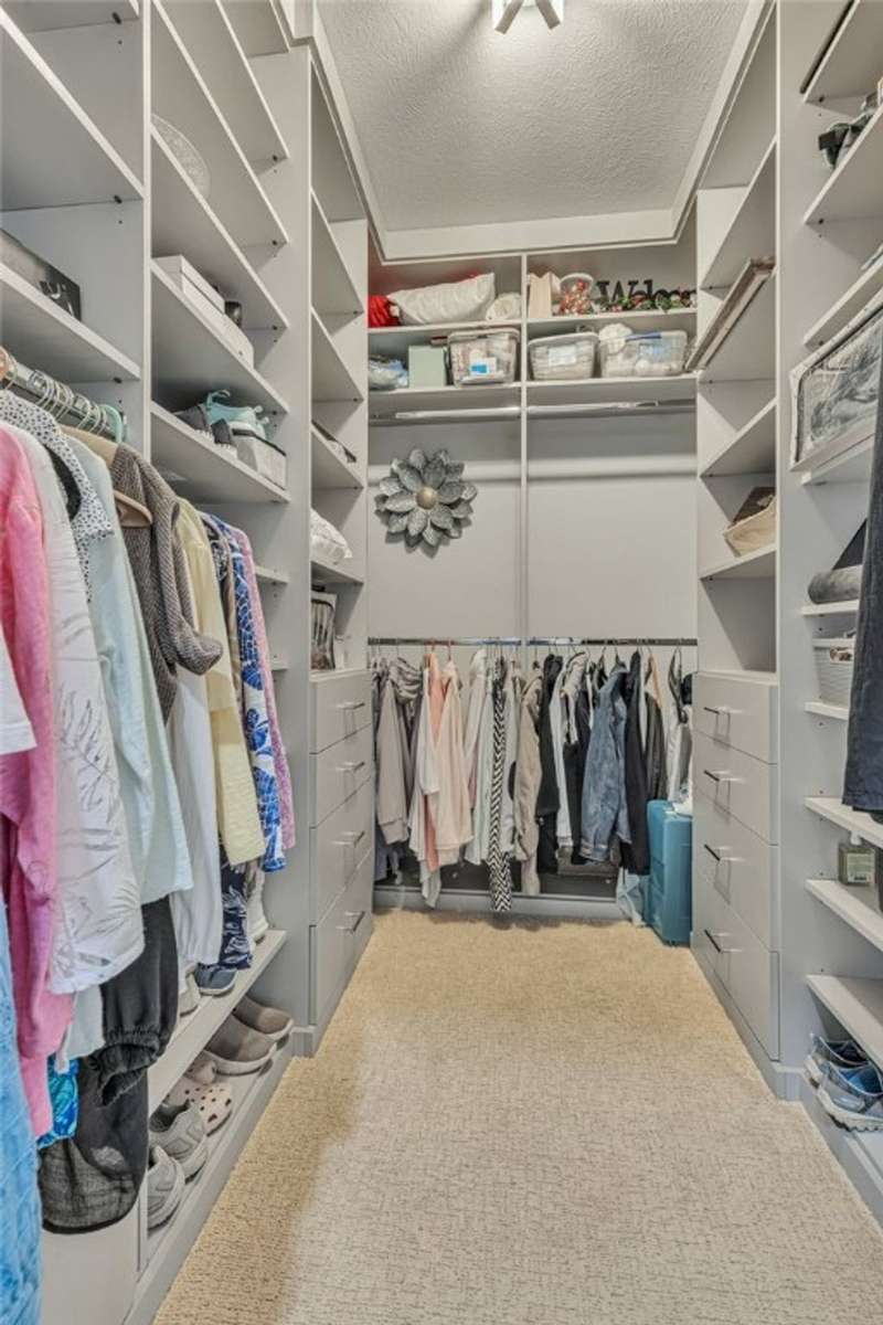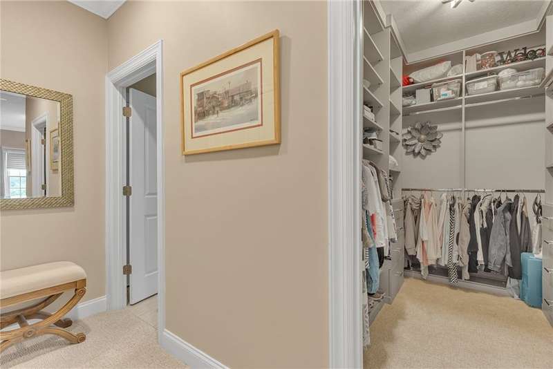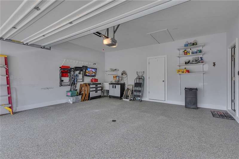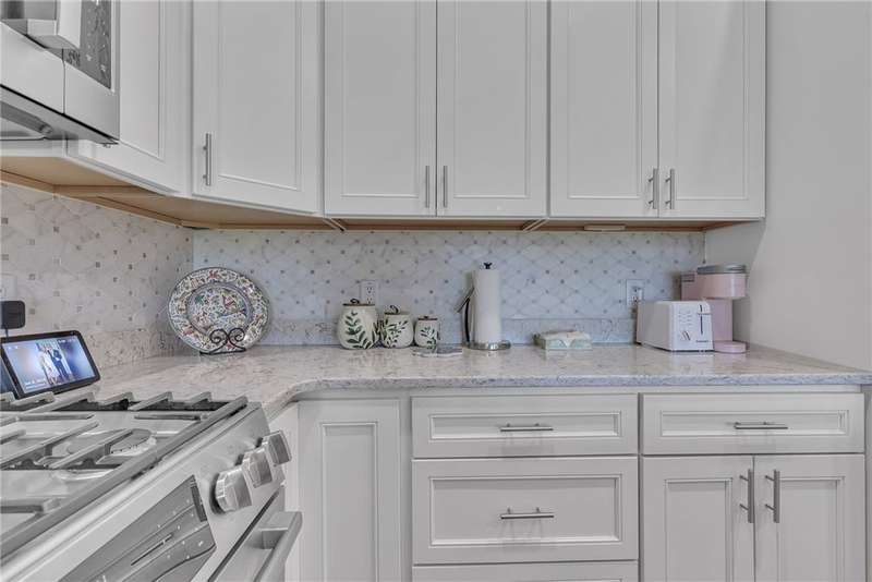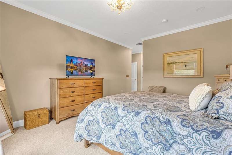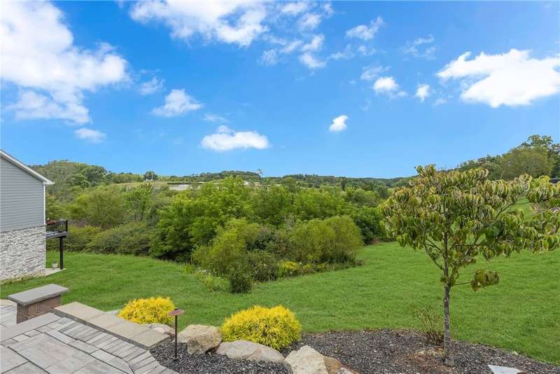 Welcome to this beautifully designed patio home in Pinehurst Village, neighboring the Seven Oaks Country Club. The exterior features a stone patio, thoughtfully placed lighting, plush landscaping, and an expansive composite deck. The interior features hand-scraped hardwood flooring with an open concept. The kitchen is complimented with pendant lighting, granite countertops, a tasteful ceramic backsplash and gas stove. Soft-close cabinetry and bar seating enhance both the function and beauty of this gourmet space. The adjoining dining area is wrapped in classic wainscoting. The spacious owner's suite is accented with crown molding and a custom walk-in closet, providing ample storage and functionality. The bathroom boasts a double bowl vanity, and high-end finishes throughout. The garage stands out with its stone pebble floor. This patio home combines low-maintenance living with upscale finishes.