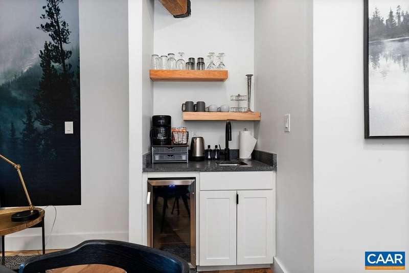 ""Capture the Essence of Wintergreen by securing one of the finest condos at WTG's Mountain Inn! Step into this cozy mtn condo and sink into your surroundings with the Gorgeous Wall Mtn Escape Mural, a cozy Kitchenette w/Soapstone Countertop & Vanity and Generous Living Space! Make your way up to the Loft on the Custom Designed STEEL STAIRCASE W/FLOATING ASH TREADS (v-$37.5k); and Embrace the tastefully decorated Spacious Loft Area which offers extra Closet Space, King Sized Bed, Eloquent Bathroom w/Subway Tile, Soapstone Countertop, Curb less Shower Entry. Relaxing w/your Favorite Beverage on your Deck overlooking the Courtyard anytime of day keeps you in tune w/fun activities! Recently Extensive Updated Features thruout include ASH Floors, Loft designed HVAC Ducting, LED Lighting, Chandelier & Ceiling Fan! This condo is a WTG Platinum rental and enjoys generous income! Don't forget your reserved ski locker for the """"ski in/ski out"""" experience! Starbucks Beverages in Lobby Cafe! AVG YRLY REV: $21-23k.""