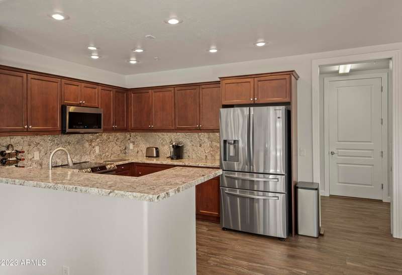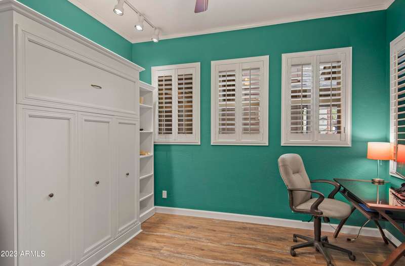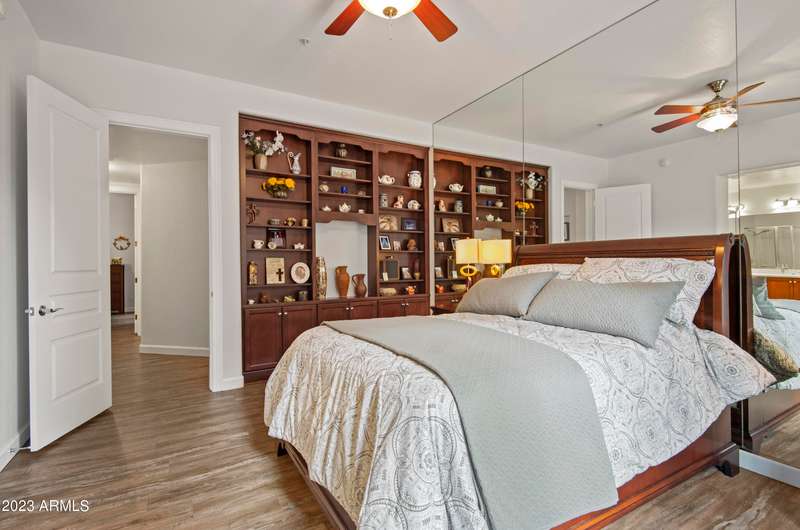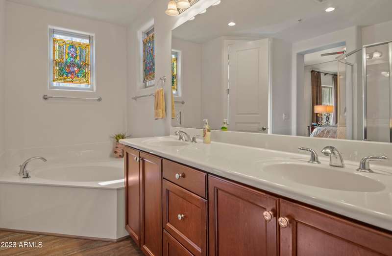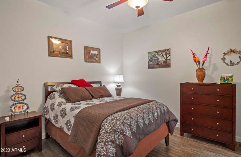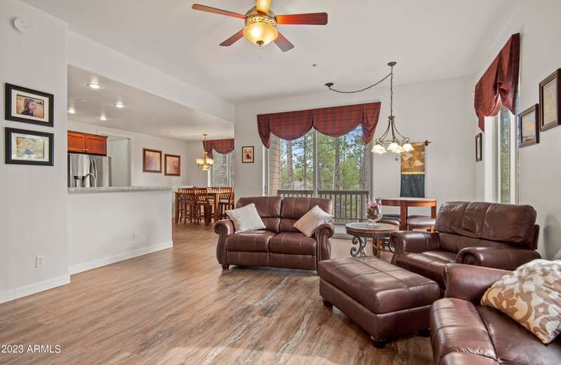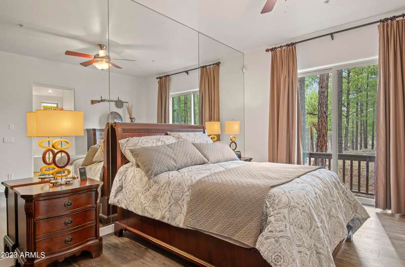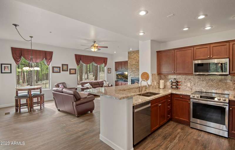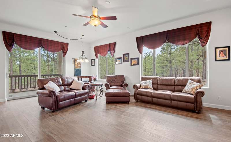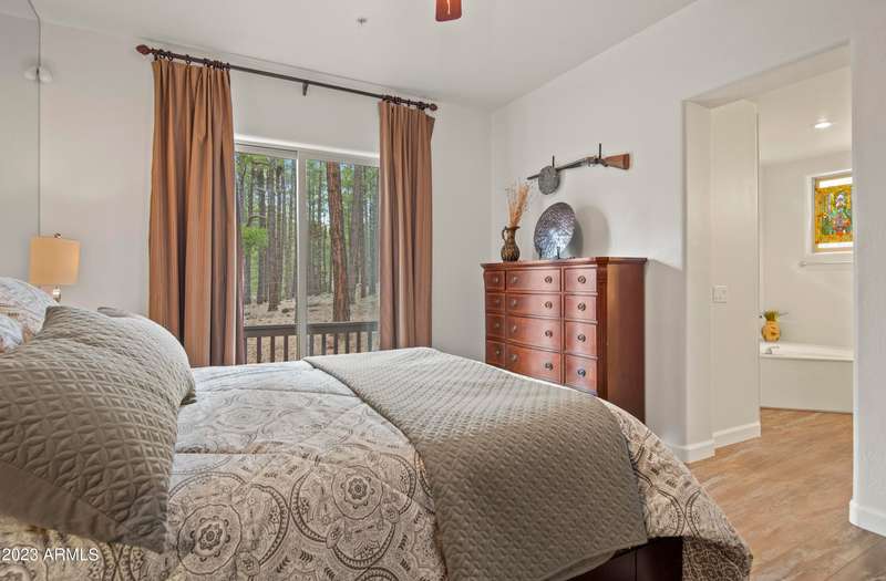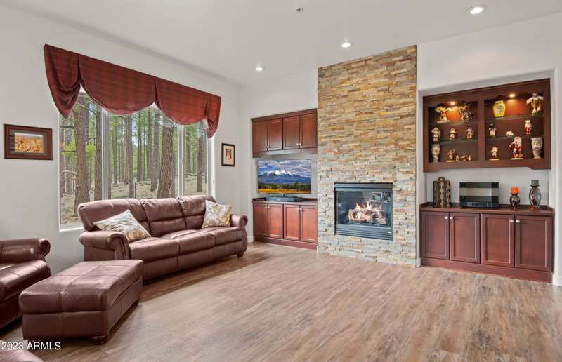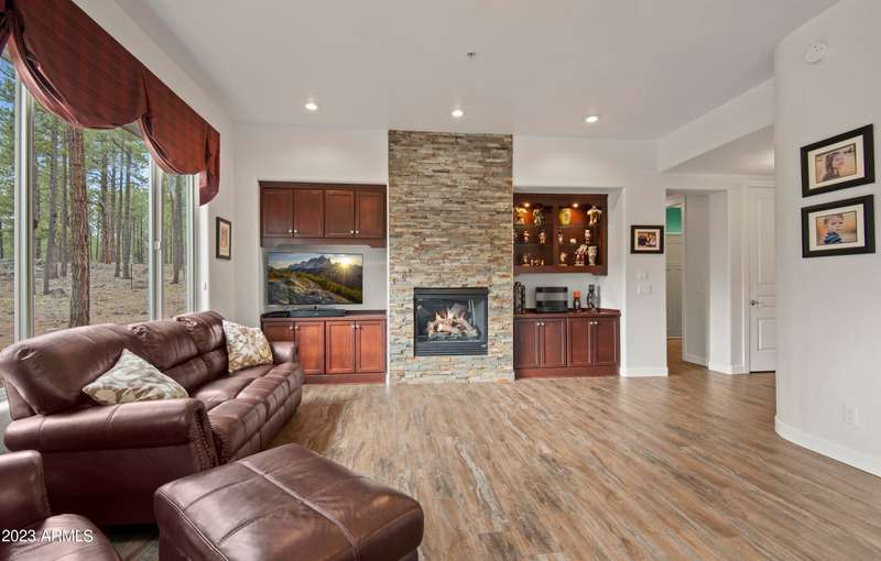 Beat the Phoenix Heat! Exquisite Flagstaff Ranch single level home; it not only boasts the best floor plan in the neighborhood, it's also in the best location in the neighborhood - on a quiet, private cul-de-sac yet steps away from the golf course & all the fun that is Flagstaff Ranch. Open, light and bright with 10' ceilings and 8' doors, huge windows and sliding glass doors showcase your secluded Ponderosa Forest view the moment you walk-in. Surrounded by nature, the Trex deck off the family room leads out to your own, private Aspen Grove! Cuddle up to your romantic, floor-to-ceiling, 10' stacked rock gas fireplace. Newly remodeled home has been carefully designed for luxurious comfort and entertaining, with gorgeous, engineered hardwood floors throughout.
