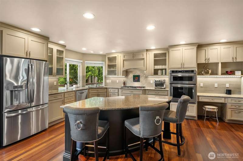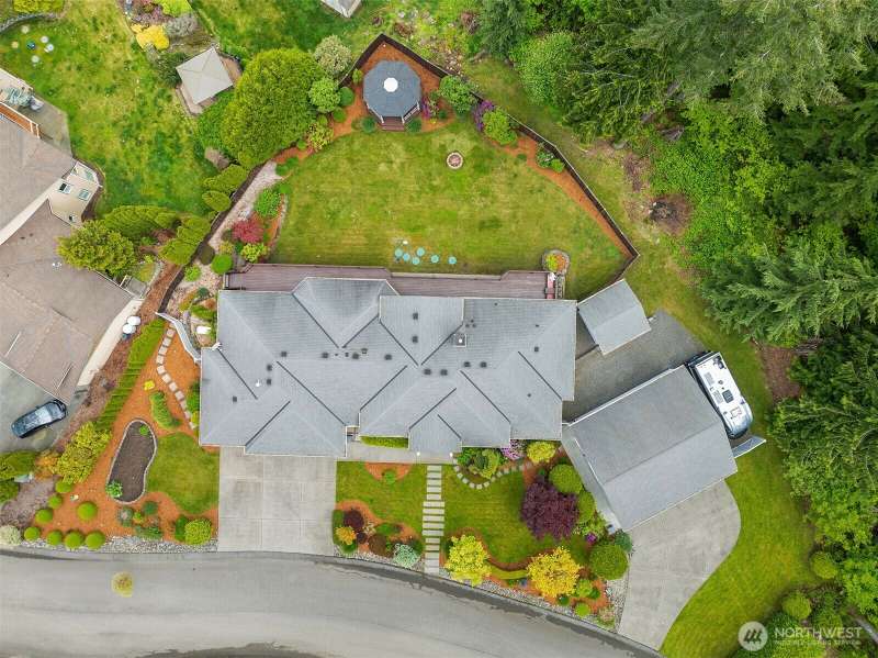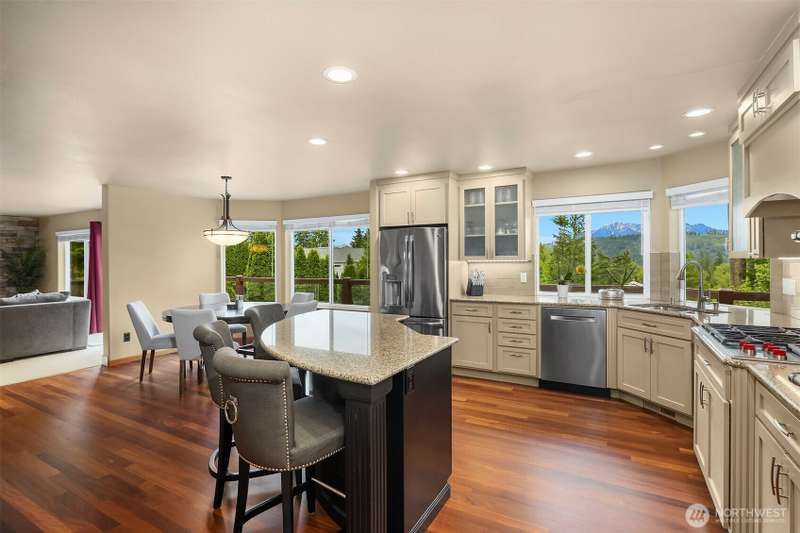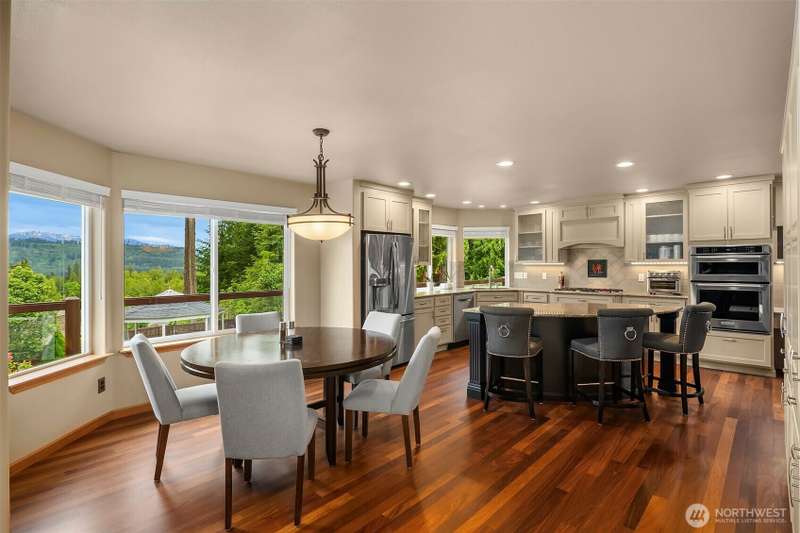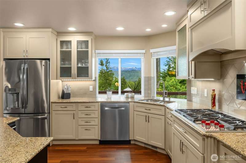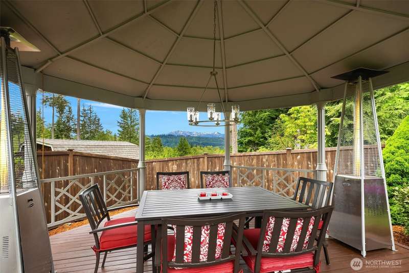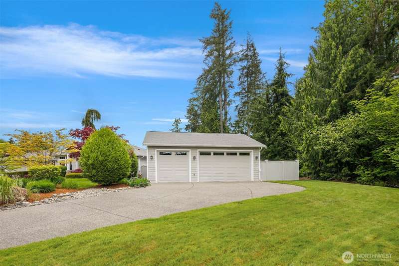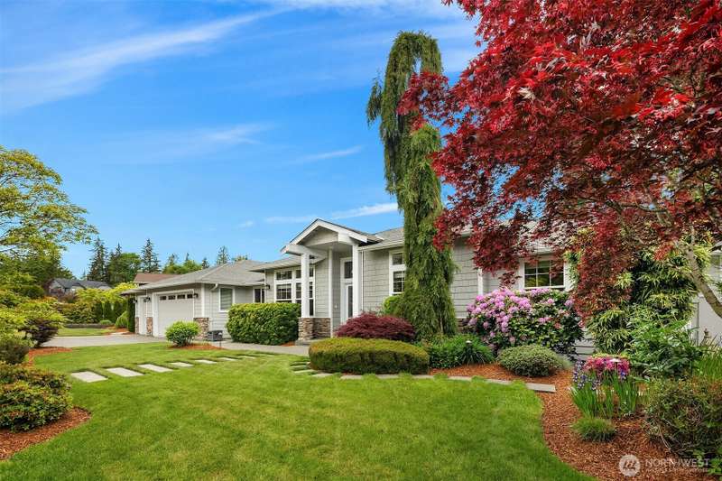 A beautiful and grand home w/ unobstructed and protected views of the Cascade mountains! This hard-to-find rambler w/ a daylight basement is perfectly designed for comfort and entertaining. The main level features a beautifully updated kitchen w/ granite counters, stainless appliances, island, and casual dining space. French doors open to a vast view deck overlooking manicured yard, gazebo and green belt. The light-filled daylight basement with 10-foot ceilings is ideal for guests or MIL, with 2 beds, office/den/game room, wet bar, rec room, and dining area. Smart lighting, generator, heat pump/AC. Attached 3-car garage plus a detached 30x30 shop/garage and 10x12 shed. Total of 6 car garage. RV parking w/ all hookups completes the package!