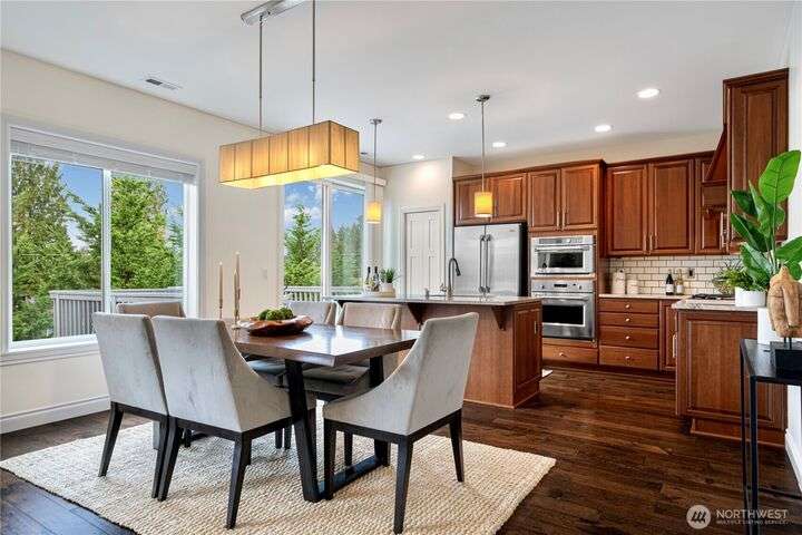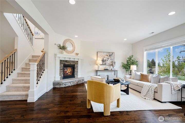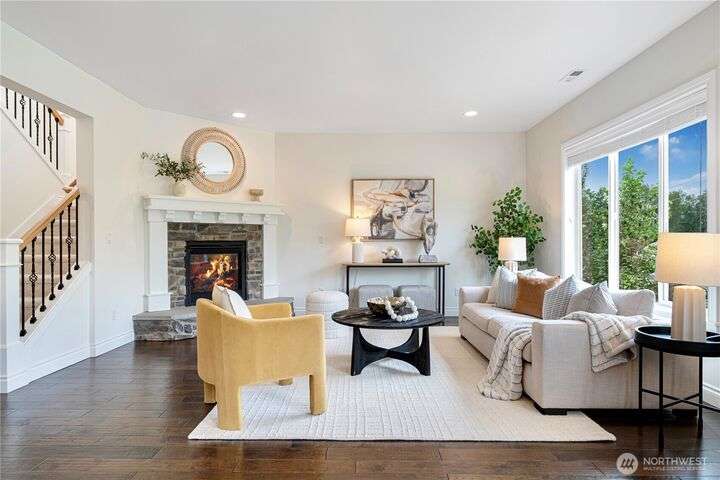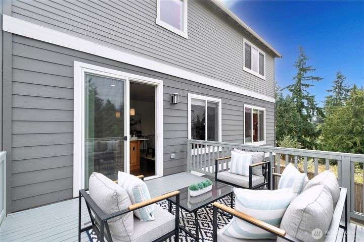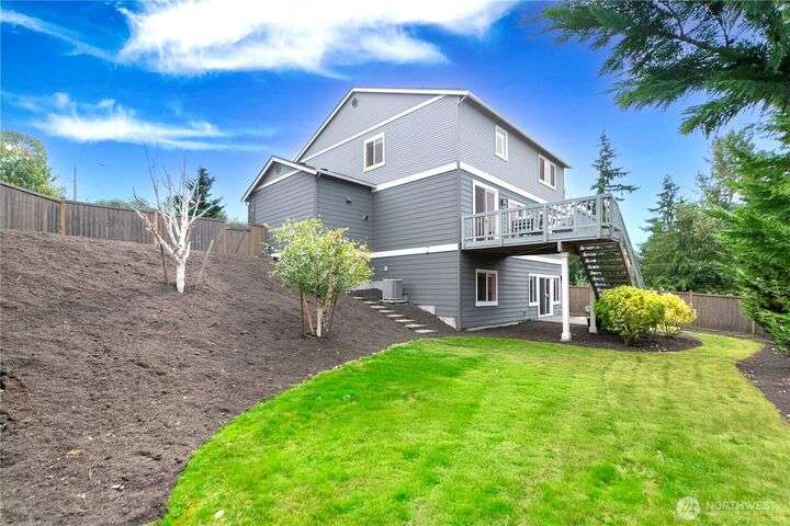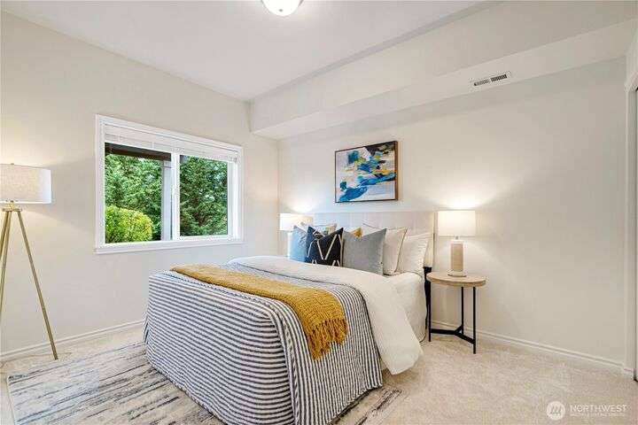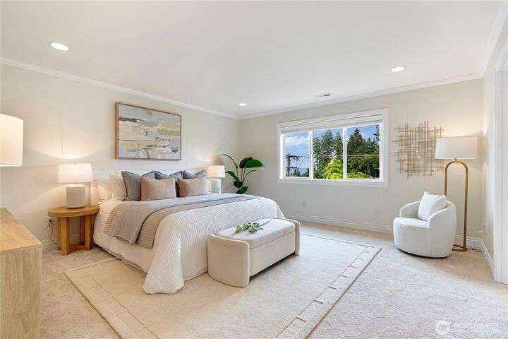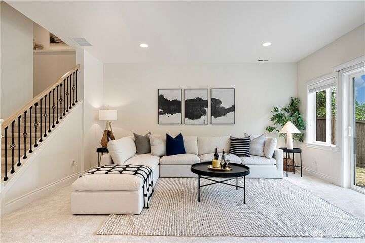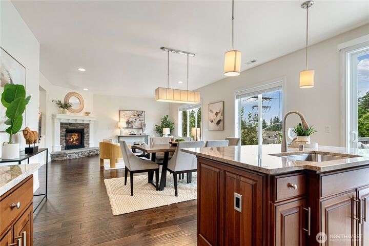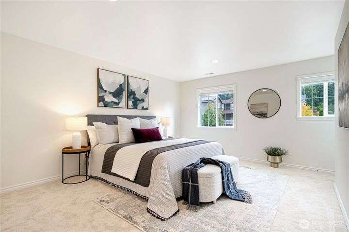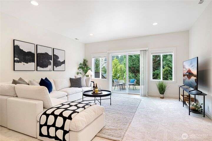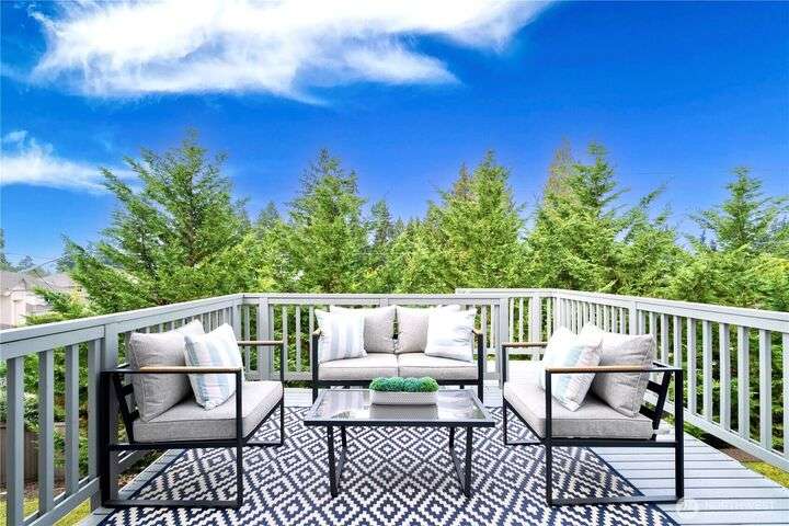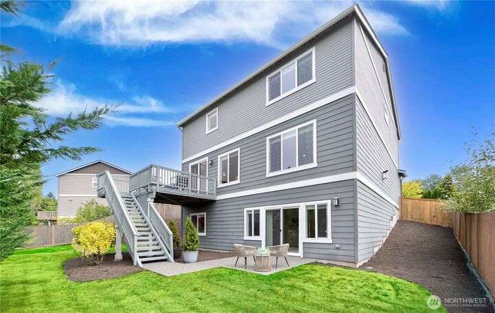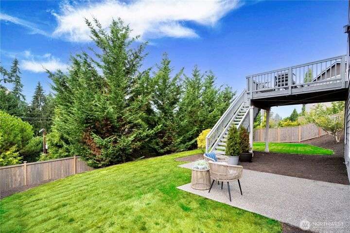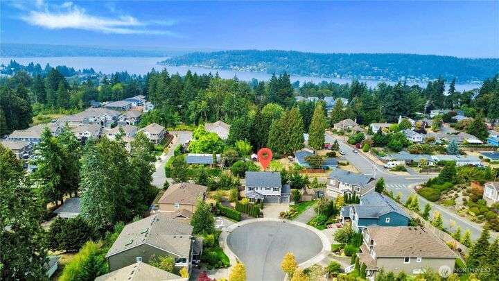 Step into this high-end Emerald home with fresh paint and new carpet. Sunlight pours through large windows, filling the expansive great room where the kitchen with gas stove, dining, and living areas flow seamlessly together. Sliding doors open to a deck and patio for outdoor enjoyment. Upstairs, four bedrooms include a spacious primary suite with a luxurious bath, laundry nearby, and even a window view that hints at Mercer Island. On the main floor, a versatile guest bedroom/office with adjacent 3/4 bath adds flexibility. The daylight basement offers its own bedroom, bath, and living area—an ideal private retreat. With central A/C, a rare 3-car garage, and a quiet cul-de-sac location, this home balances comfort, privacy, and convenience.