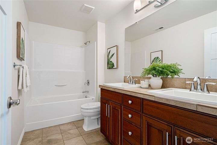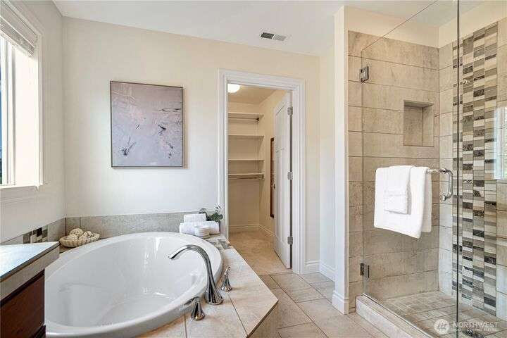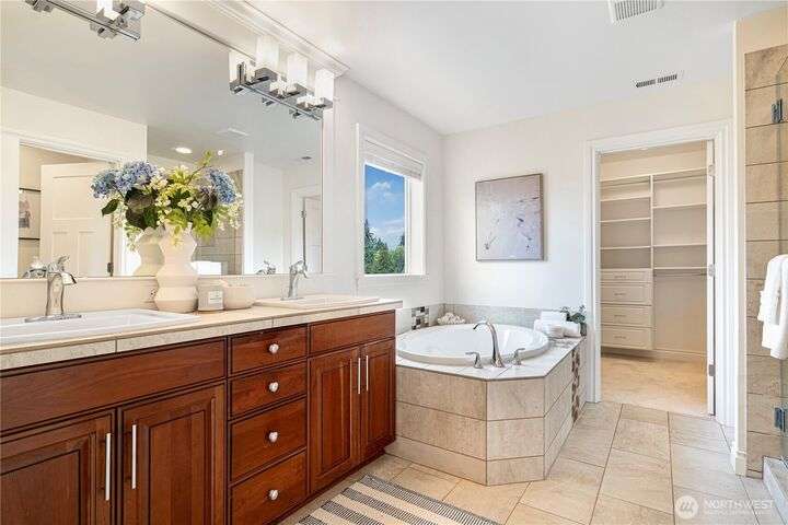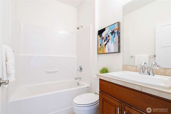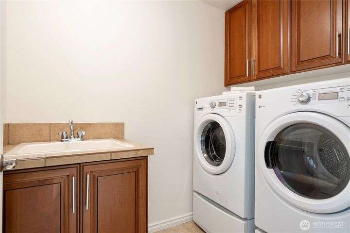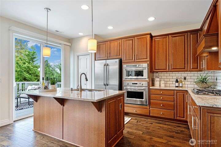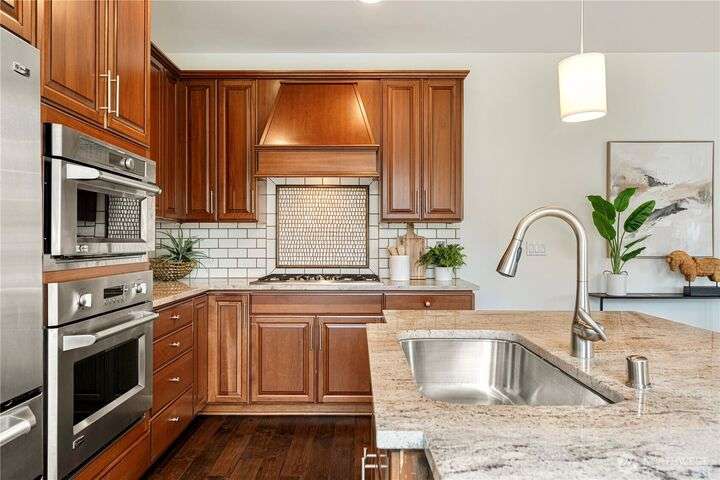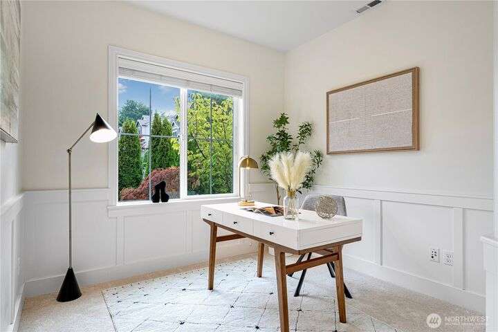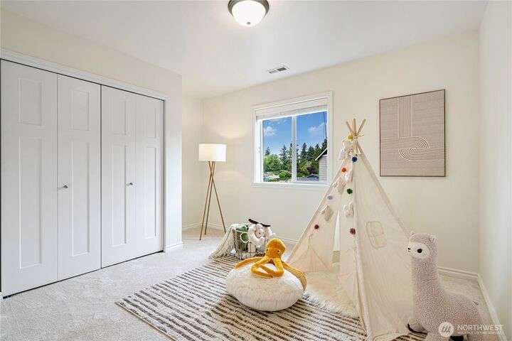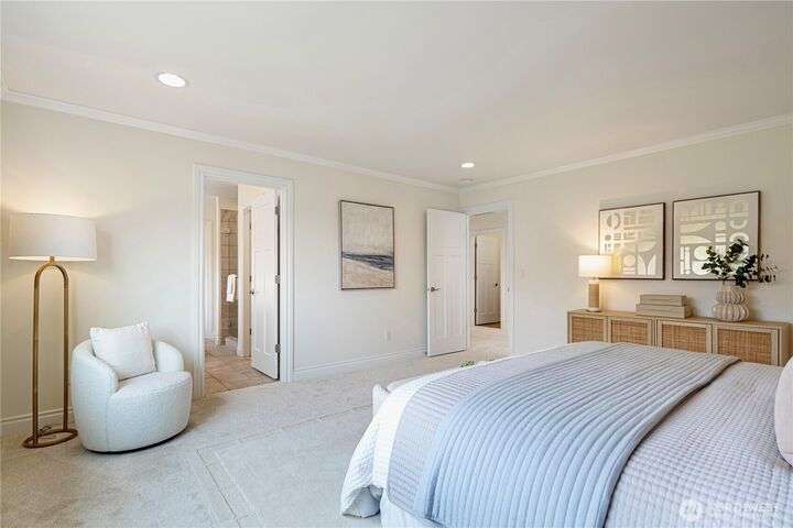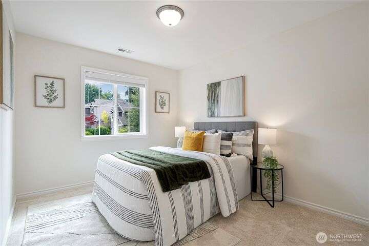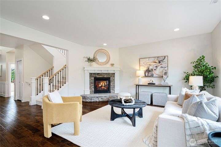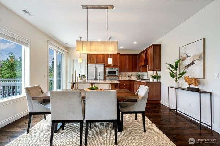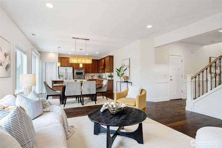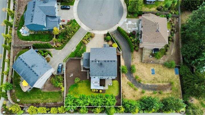 Step into this high-end Emerald home with fresh paint and new carpet. Sunlight pours through large windows, filling the expansive great room where the kitchen with gas stove, dining, and living areas flow seamlessly together. Sliding doors open to a deck and patio for outdoor enjoyment. Upstairs, four bedrooms include a spacious primary suite with a luxurious bath, laundry nearby, and even a window view that hints at Mercer Island. On the main floor, a versatile guest bedroom/office with adjacent 3/4 bath adds flexibility. The daylight basement offers its own bedroom, bath, and living area—an ideal private retreat. With central A/C, a rare 3-car garage, and a quiet cul-de-sac location, this home balances comfort, privacy, and convenience.