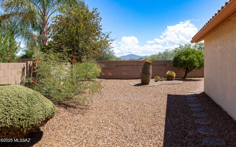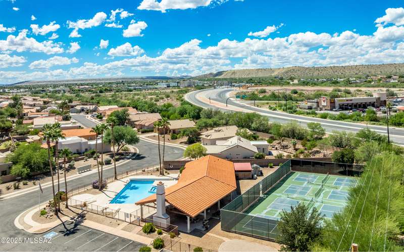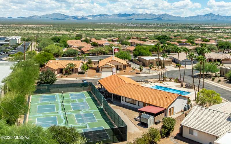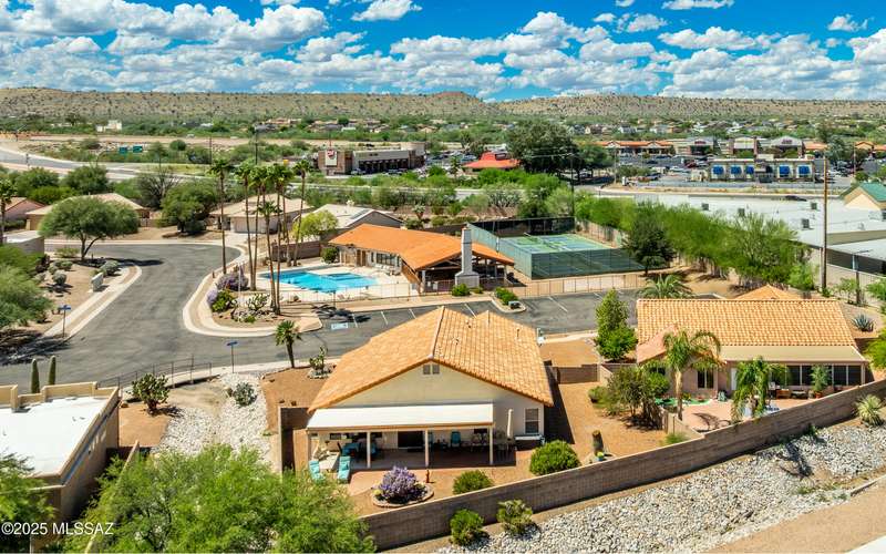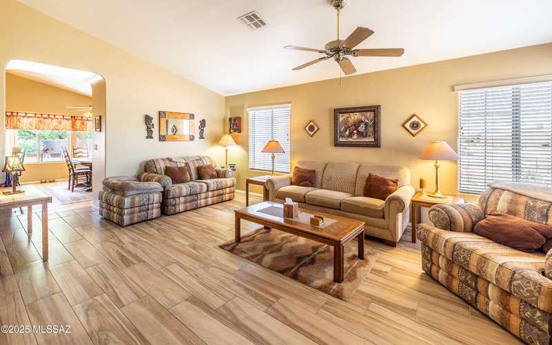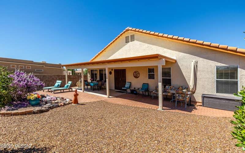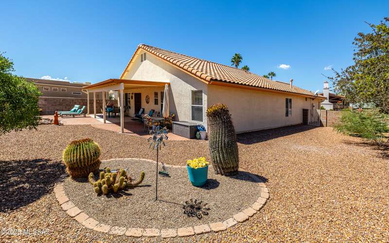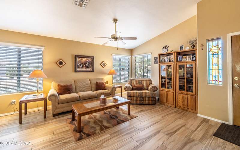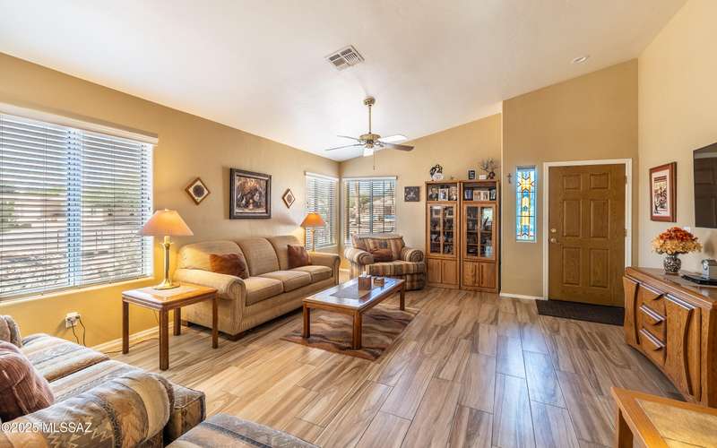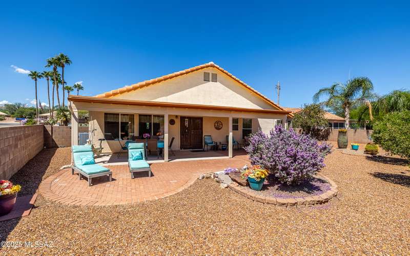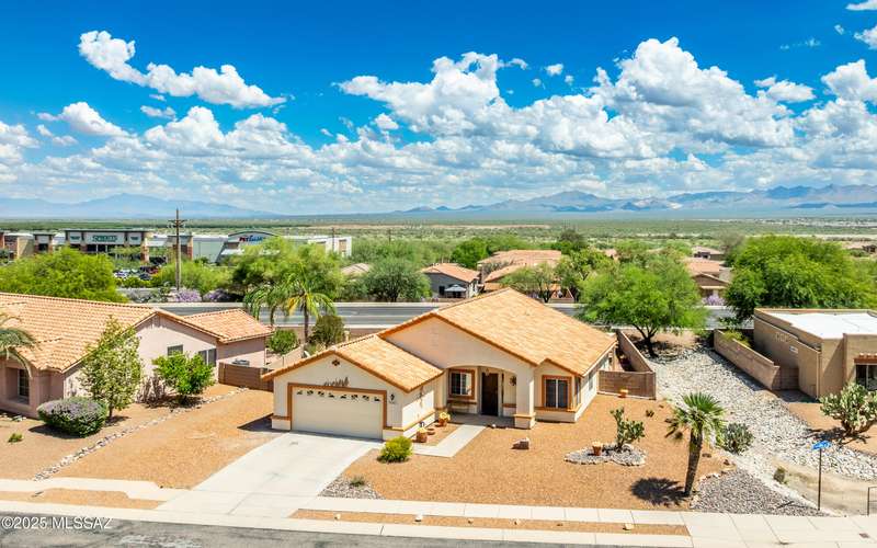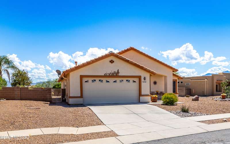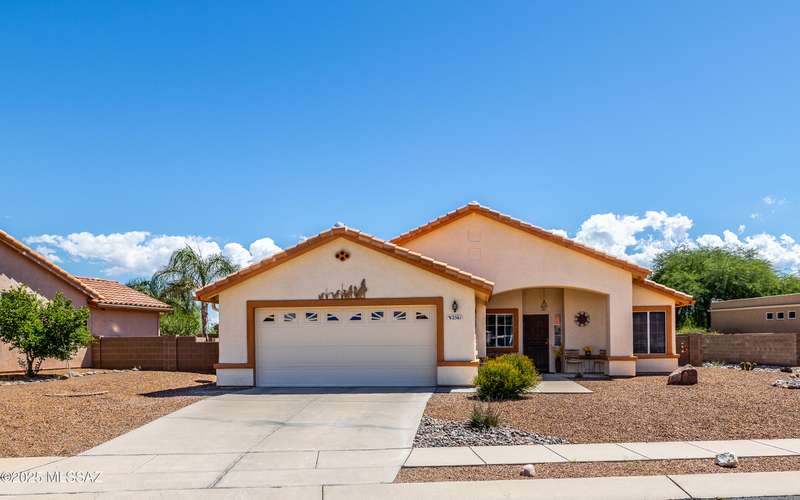 Desirable La Joya Verde subdivision! unbeatable location with no GVR. This Immaculate single family home offers two bedrooms, two baths and the versatile office/den that doubles as a third bedroom to suit your needs, Large windows fill the open layout with natural light, highlighting elegant wood plank tile, classic Saltillo tile, and stain glass window in entry way. The kitchen flows warmly into casual and formal dining spaces, while French doors lead outside to a private oasis. The home sits on .22-acre lot and offers exceptional privacy and distance from neighbors. Home offers remarkable convenience-just a short stroll to recreation center, pool, pickleball courts, shopping, restaurants and I-19 only minutes away. This home blends comfort and convenience-creating lasting memories.