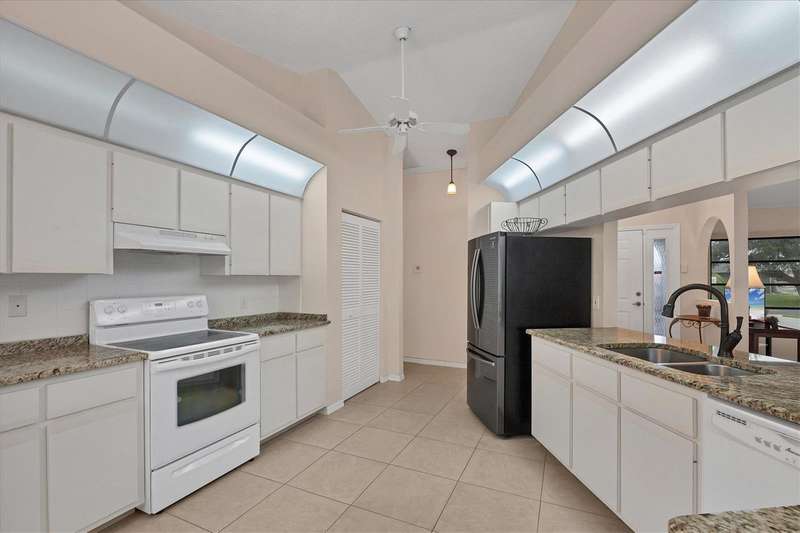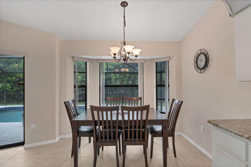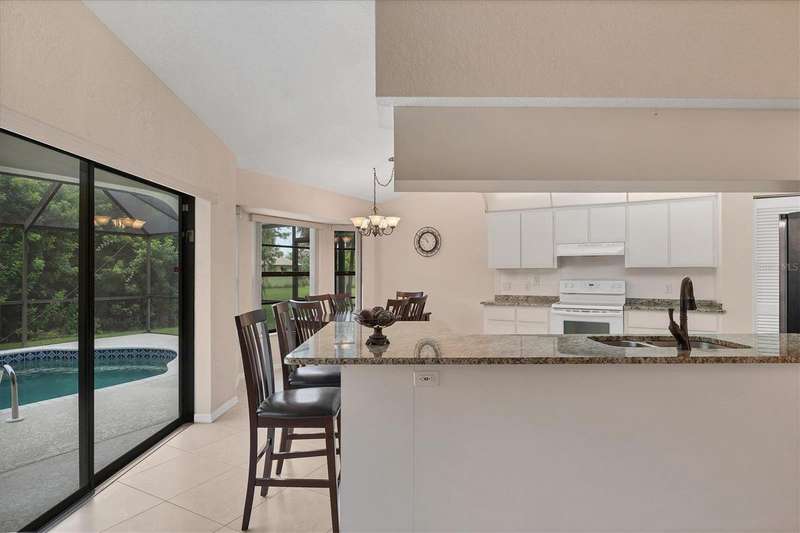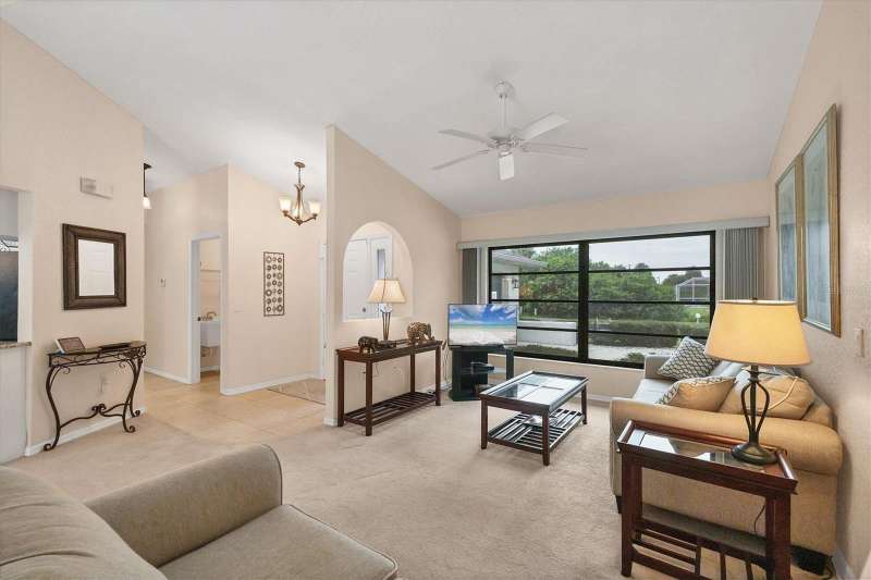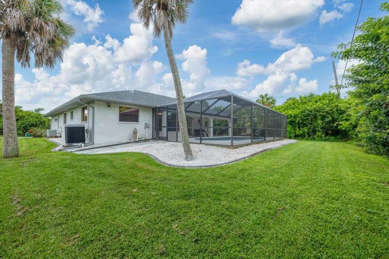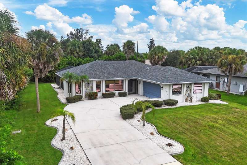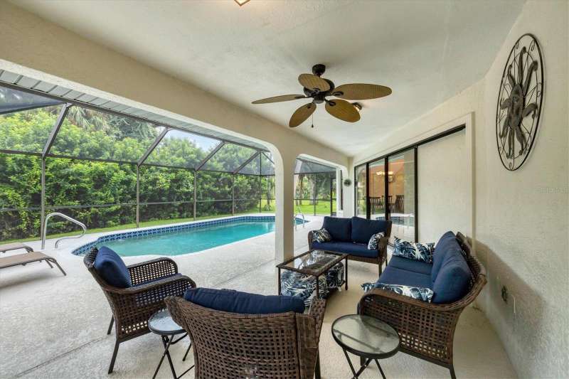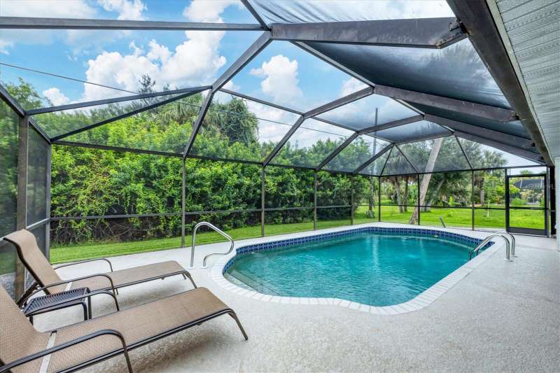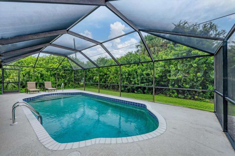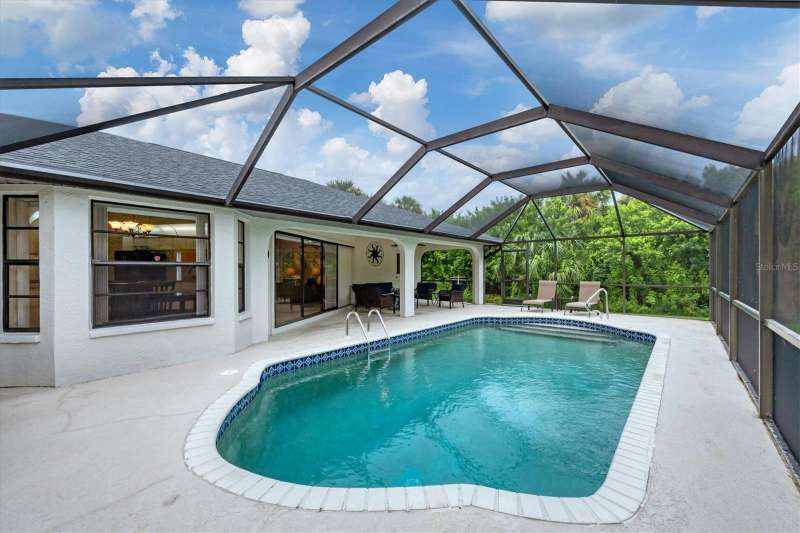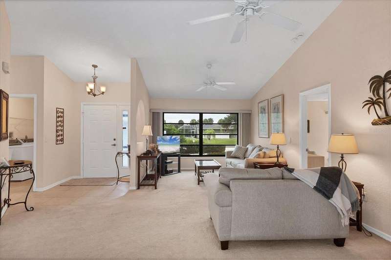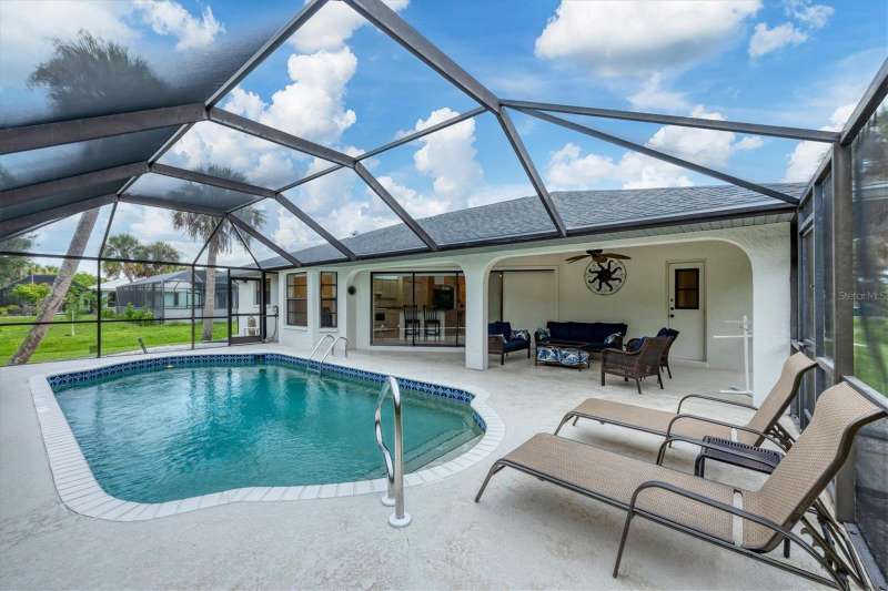 Welcome to this beautifully maintained 3-bedroom, 2-bath home offering the perfect combination of comfort and Florida lifestyle living. From the moment you arrive, you’ll notice the oversized side-entry garage with gutters, providing both functionality and curb appeal. Step inside to a spacious split-bedroom floor plan with soaring ceilings and a bright, open feel. Ceramic tile and carpet flooring flow throughout, while large sliding glass doors invite you out to the sparkling heated pool and screened lanai, ideal for relaxing or entertaining friends and family. The kitchen and living areas are designed for convenience and comfort, with plenty of natural light and easy access to the poolside patio. An inside laundry room adds practicality, while blinds on every window ensure privacy and shade. This home is being offered turnkey furnished, allowing you to move right in and start enjoying everything it has to offer. Outdoor features include security lighting, a newer roof for peace of mind, and a private backyard retreat centered around the pool. Whether you’re looking for a seasonal getaway or a full-time residence, this home has everything you need to enjoy the best of Florida living.
