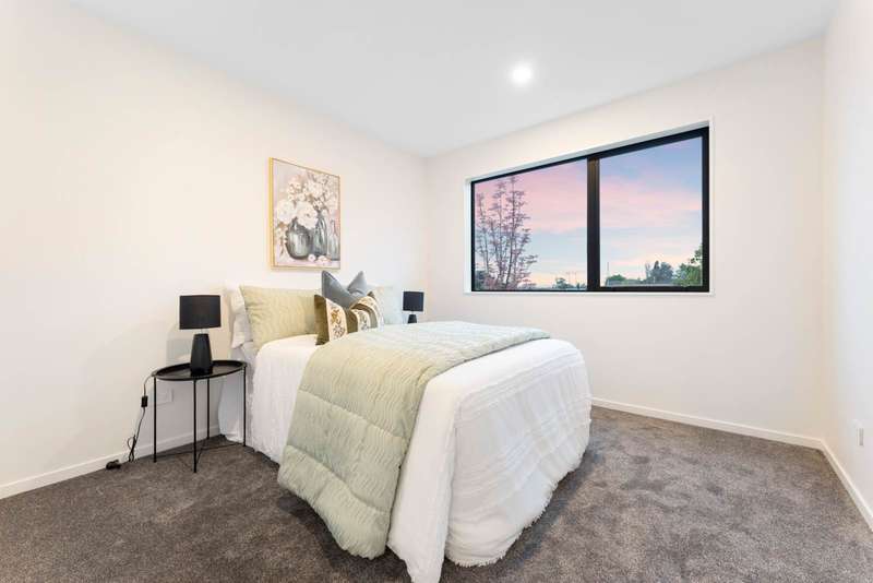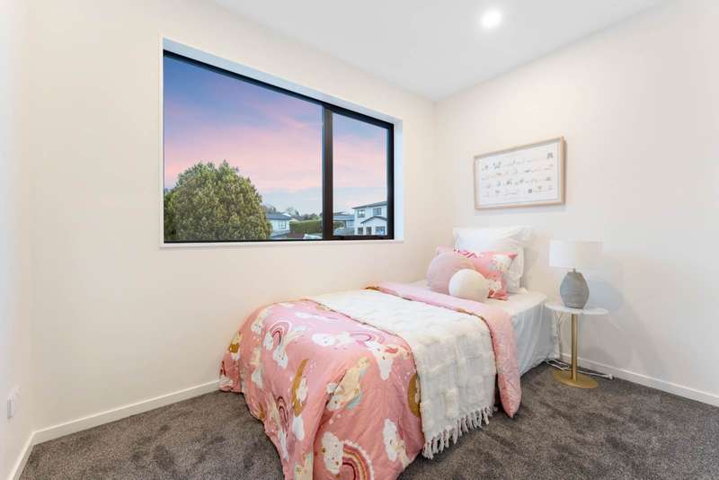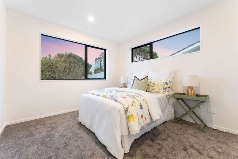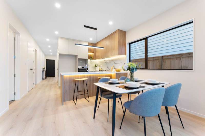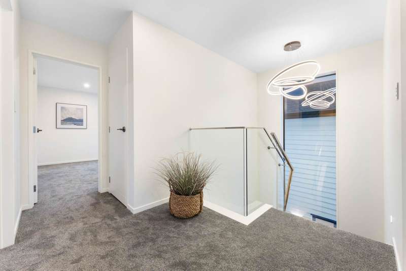 Situated in a quiet and family-friendly neighbourhood, Lot 1 offers the perfect blend of comfort and functionality across its approx. 158m² floor area on a 225m² freehold section. Step inside to find a separate living room, a bedroom with its own bathroom downstairs – ideal for extended family, guests, or teenagers – plus a single internal-access garage with cleverly designed laundry area, bench space, and extra storage. The heart of the home is the open-plan dining area that flows seamlessly onto a sunny deck and a generous backyard, making it perfect for summer BBQs and family gatherings. Upstairs, you’ll find spacious bedrooms, including a luxurious master suite with its own ensuite and wardrobe. All bedrooms have been thoughtfully designed to ensure comfort, light, and space. Finished with Bosch appliances, Daikin heat pump, video intercom, alarm system, and double-glazed windows, this home is both stylish and secure. With motorway access and Westgate & Northwest Shopping just minutes away, and Moire Park within walking distance, this is a home that truly ticks all the boxes.