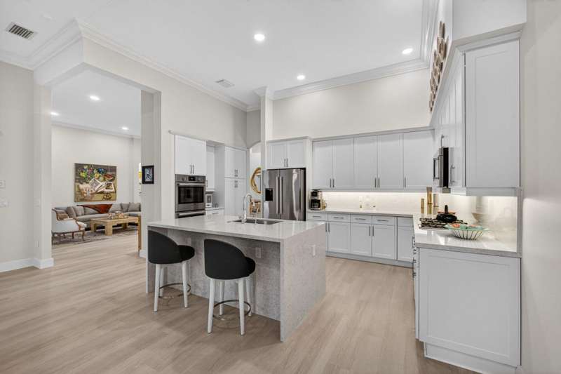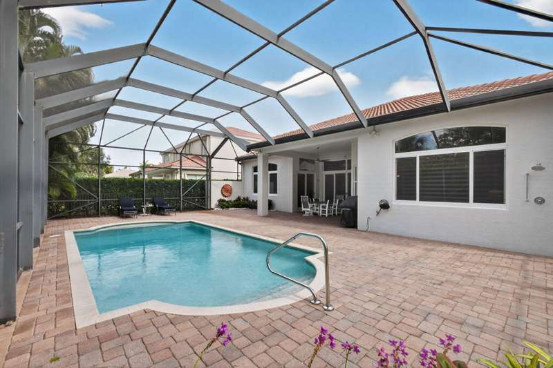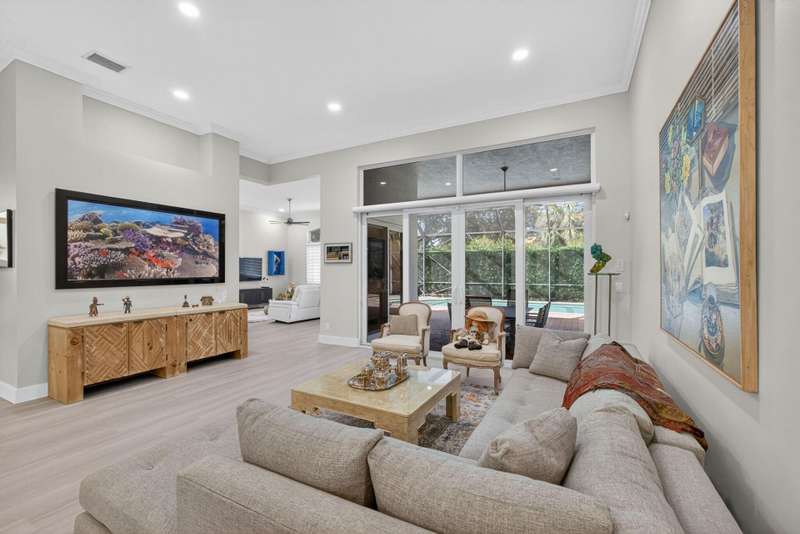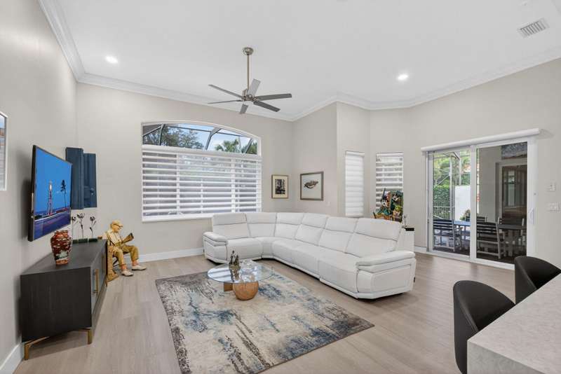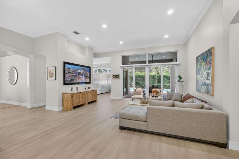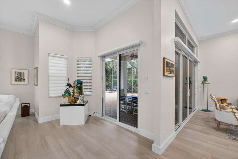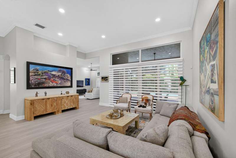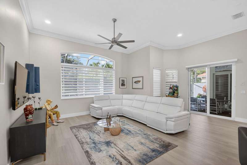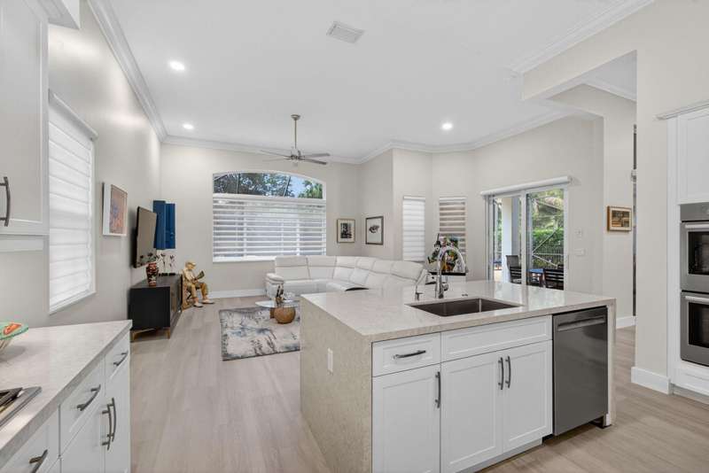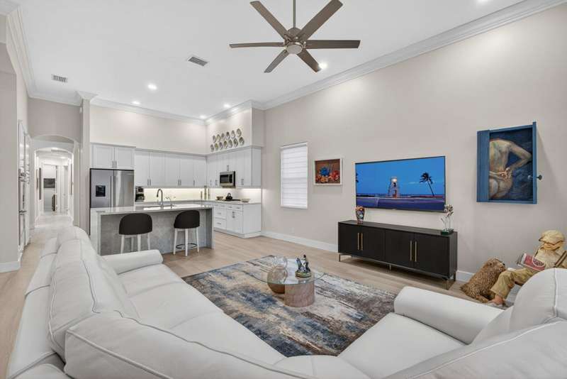 Must see this Beautifully remodeled one-level pool home in one of best gated communities in PBG. This 4-bedroom, 3 full bath ranch home has one of the nicest and most open floor plans in all of Mirabella. Renovated gourmet kitchen open to the family room features quartz countertops with a waterfall edge center island and matching quartz backsplash. High-end Bosch appliances & refinished wood cabinetry. All new light fixtures & LED recessed lighting throughout the home. Upgraded plank composite wood flooring throughout the entire home with upgraded wood base & crown molding. Large saltwater pool with screened enclosure, outdoor shower & large covered lanai area. Full impact glass windows & doors, whole house backup generator, custom automated Hunter Douglas window treatments + much more!