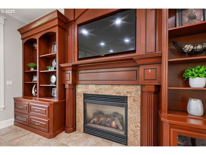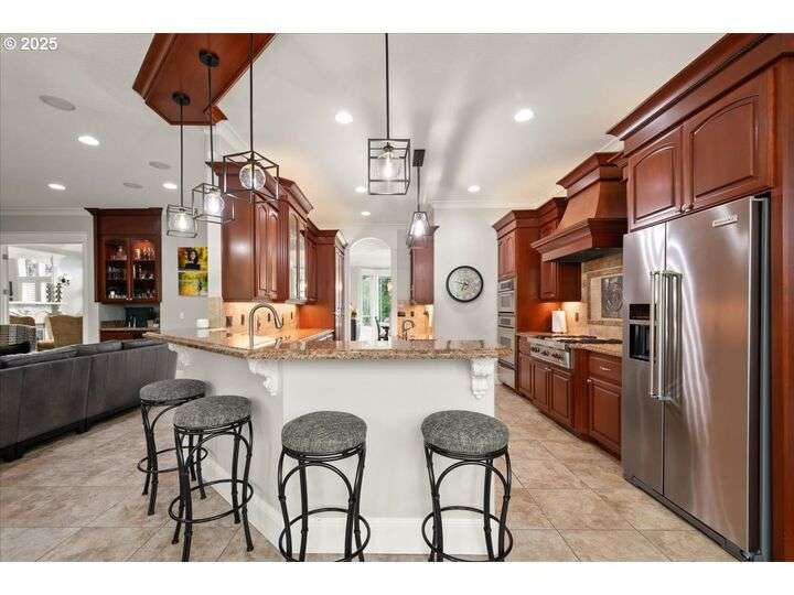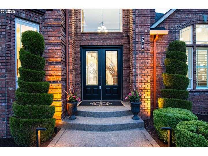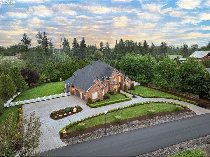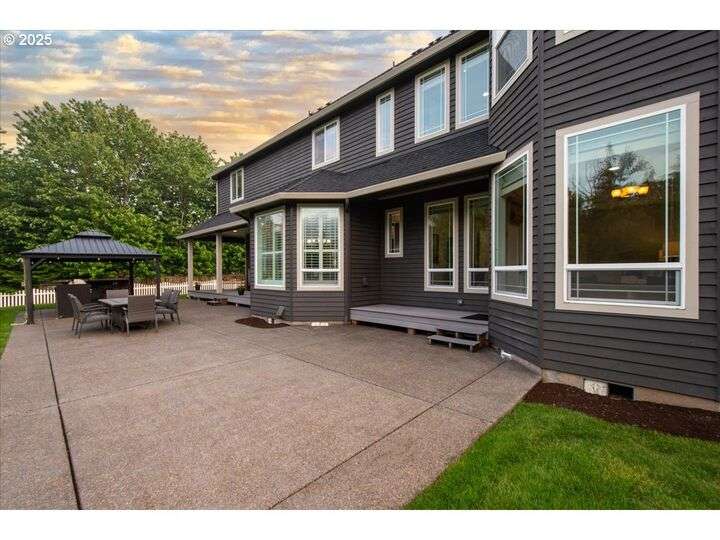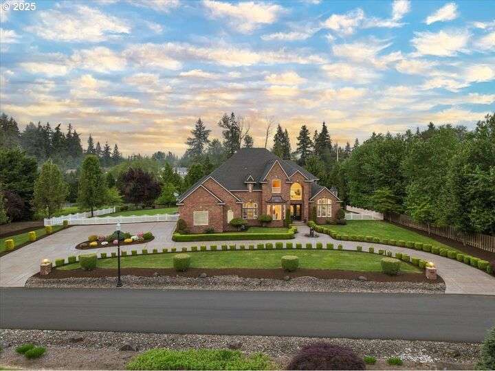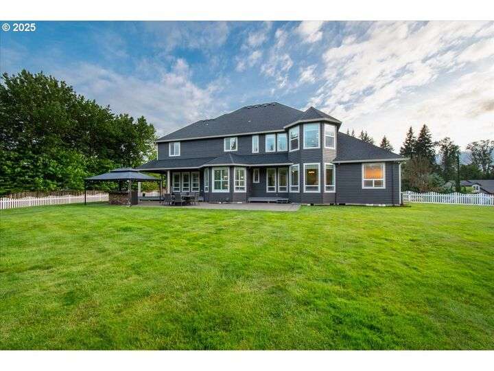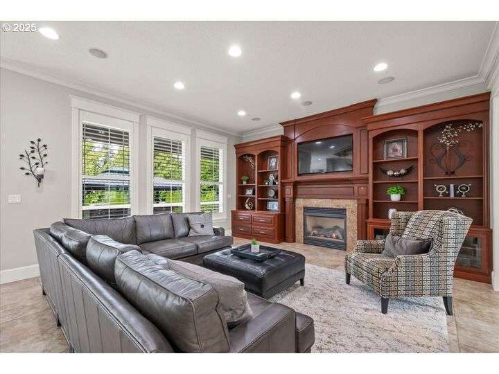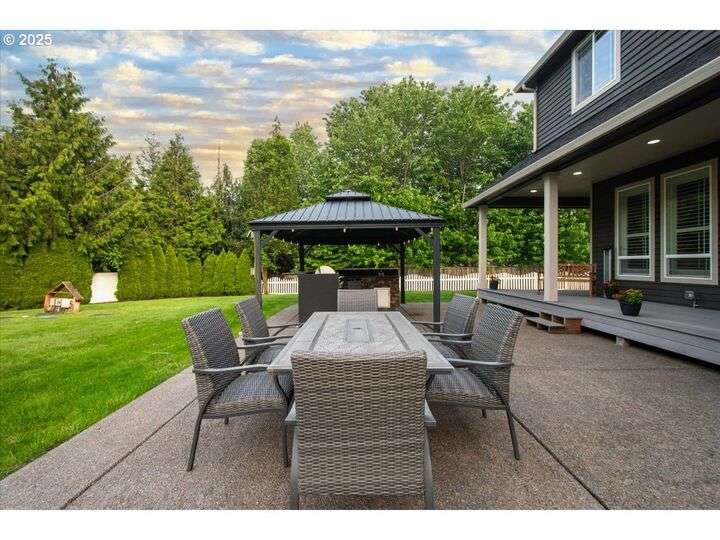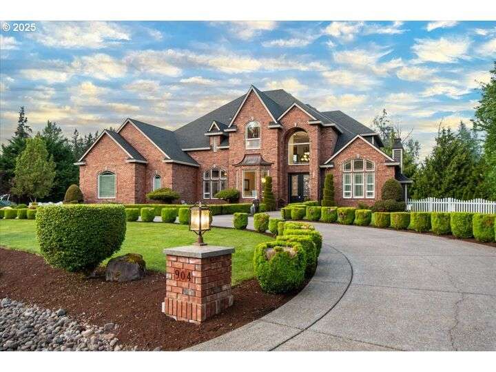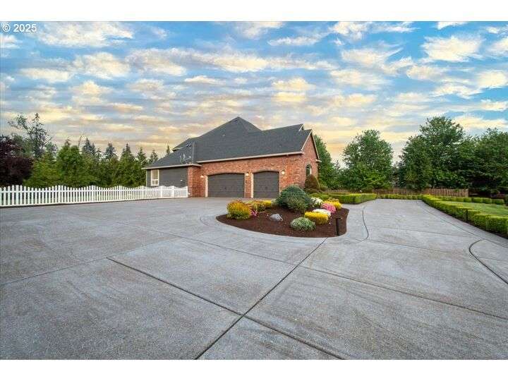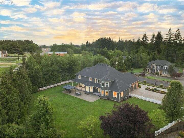 HUGE PRICE ADJUSTMENT! 1 Acre Estate in Ridgefield is Priced to Sell! This stunning 4-bedroom estate home spans an impressive 4,706 square feet! The grand high-ceiling entry welcomes you with tile floors, a wrought iron staircase featuring hardwood steps, elegant wainscotting, accent lighting, and a decorative landing. The formal dining room exudes sophistication with tile floors, coved ceilings, detailed wainscotting, and graceful pillars framing arched walkways. A cozy propane fireplace anchors the formal living room, complemented by a decorative mantel, tile surround, and mirror, with French glass doors leading to the spacious great room. Here, you’ll find 10-foot ceilings, a second fireplace with granite surround, custom built-ins, and a full wet bar with wine rack and glass cabinetry. The gourmet kitchen features custom cabinets, slab granite counters, an island with sink, full tile backsplash, top-tier Wolf propane range with griddle, built-in oven and warming drawer. The breakfast nook, bathed in natural light, opens to a covered Trex wraparound deck. Additional highlights include a den/office with built-ins, a spacious laundry room with folding station, and a secondary staircase for convenience. The luxurious primary suite offers a bayed sitting area, private deck access, and an expansive ensuite bath with jetted tub, double vanity, makeup counter, large walk-in shower, bidet, and custom closet with built-ins. Upstairs, find a hardwood landing with built-in desk, three generously sized bedrooms—two with built-ins and a Jack & Jill bath—and a vaulted guest suite with private bath. A media room features a 133 movie screen, projector, custom built-ins, and a wet bar. The oversized 3-car garage includes built-ins, a sink, and Tesla charger. Enjoy year-round entertaining with a built-in BBQ, gazebo, and wraparound covered deck in the fully fenced backyard.