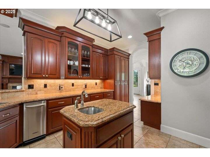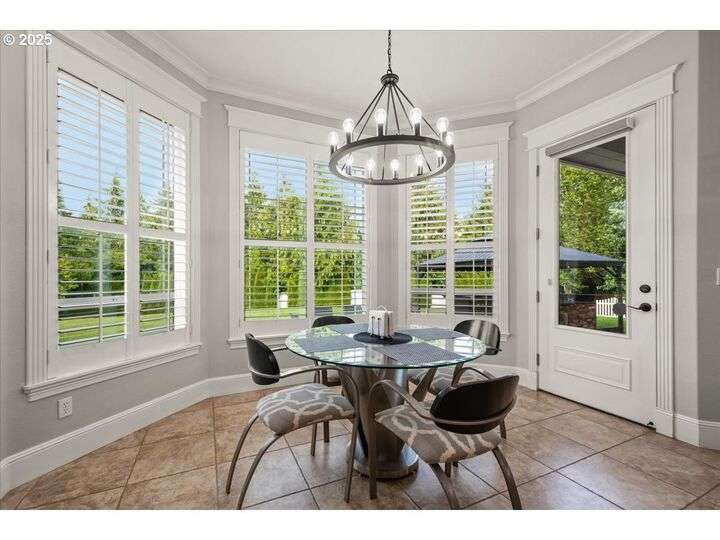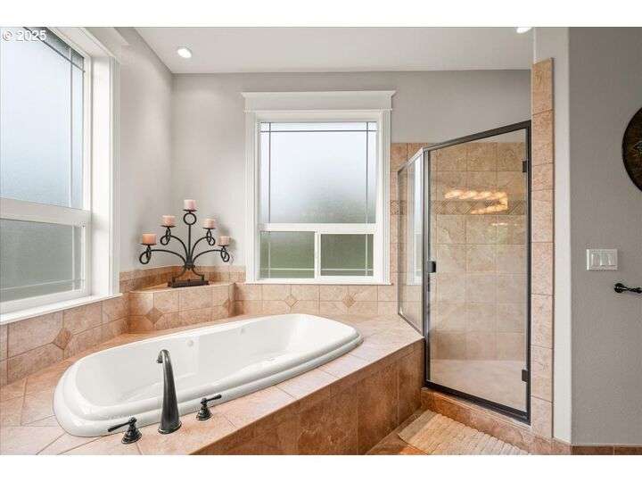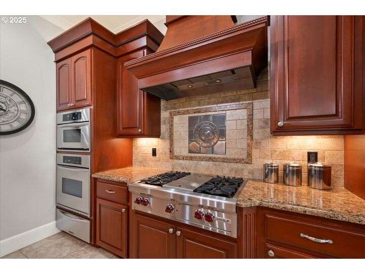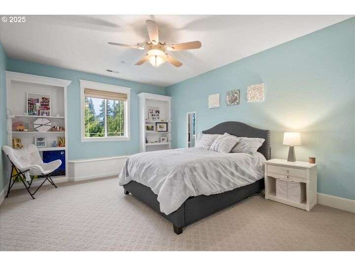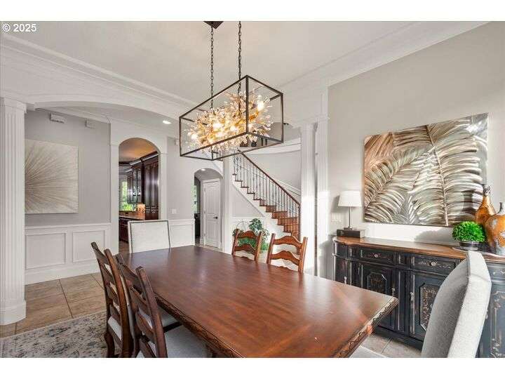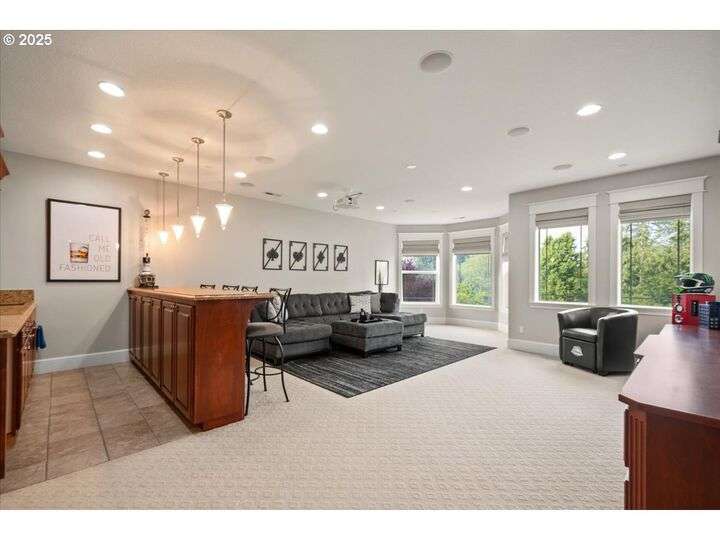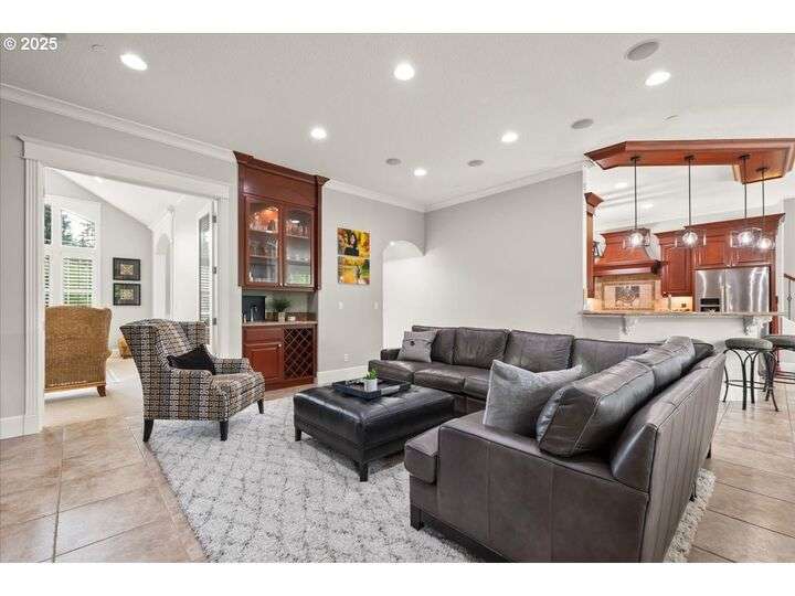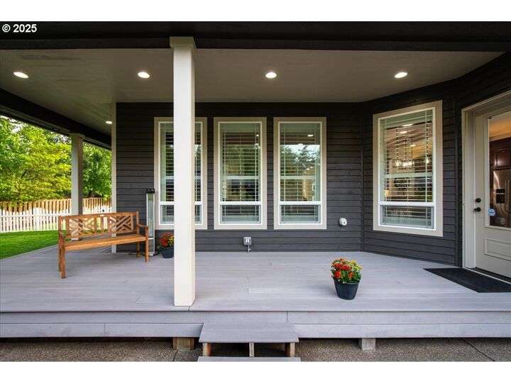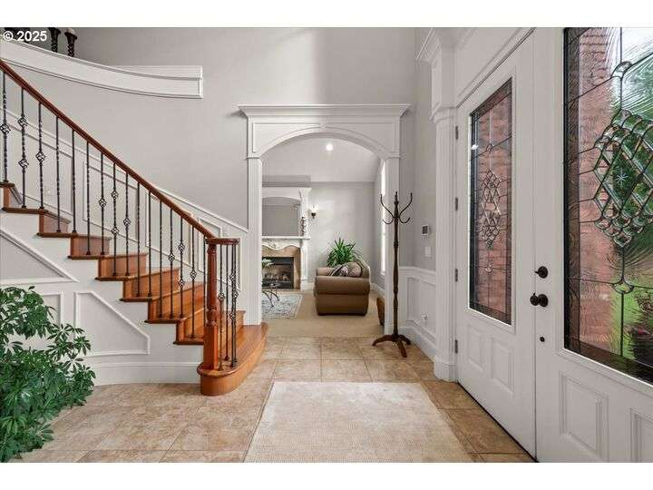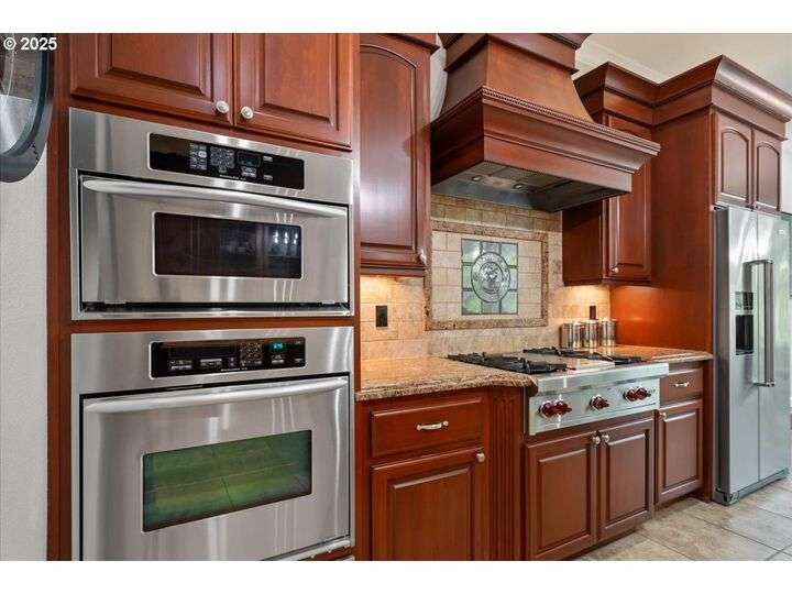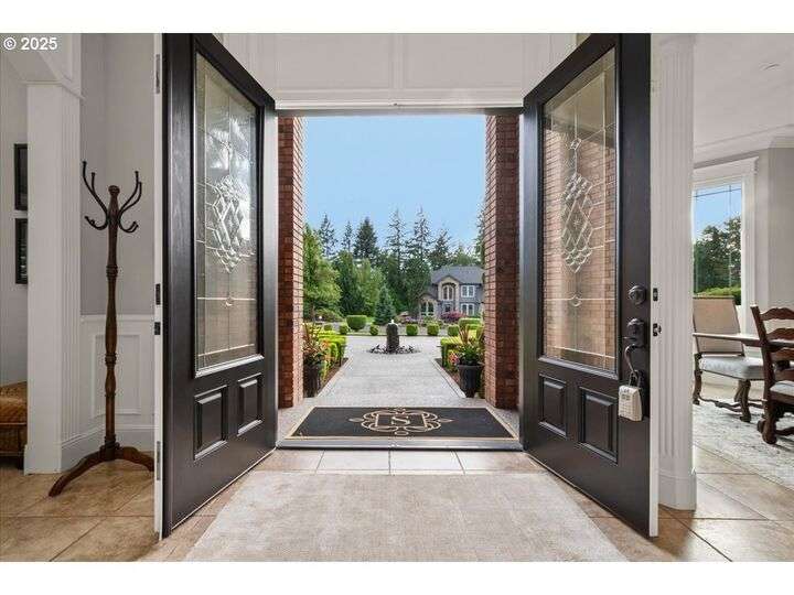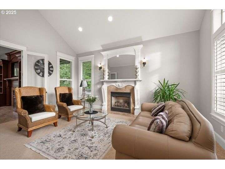 HUGE PRICE ADJUSTMENT! 1 Acre Estate in Ridgefield is Priced to Sell! This stunning 4-bedroom estate home spans an impressive 4,706 square feet! The grand high-ceiling entry welcomes you with tile floors, a wrought iron staircase featuring hardwood steps, elegant wainscotting, accent lighting, and a decorative landing. The formal dining room exudes sophistication with tile floors, coved ceilings, detailed wainscotting, and graceful pillars framing arched walkways. A cozy propane fireplace anchors the formal living room, complemented by a decorative mantel, tile surround, and mirror, with French glass doors leading to the spacious great room. Here, you’ll find 10-foot ceilings, a second fireplace with granite surround, custom built-ins, and a full wet bar with wine rack and glass cabinetry. The gourmet kitchen features custom cabinets, slab granite counters, an island with sink, full tile backsplash, top-tier Wolf propane range with griddle, built-in oven and warming drawer. The breakfast nook, bathed in natural light, opens to a covered Trex wraparound deck. Additional highlights include a den/office with built-ins, a spacious laundry room with folding station, and a secondary staircase for convenience. The luxurious primary suite offers a bayed sitting area, private deck access, and an expansive ensuite bath with jetted tub, double vanity, makeup counter, large walk-in shower, bidet, and custom closet with built-ins. Upstairs, find a hardwood landing with built-in desk, three generously sized bedrooms—two with built-ins and a Jack & Jill bath—and a vaulted guest suite with private bath. A media room features a 133 movie screen, projector, custom built-ins, and a wet bar. The oversized 3-car garage includes built-ins, a sink, and Tesla charger. Enjoy year-round entertaining with a built-in BBQ, gazebo, and wraparound covered deck in the fully fenced backyard.
