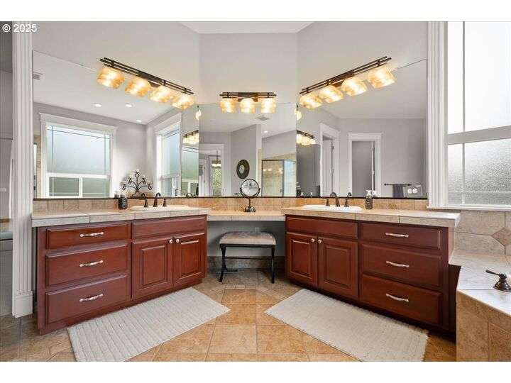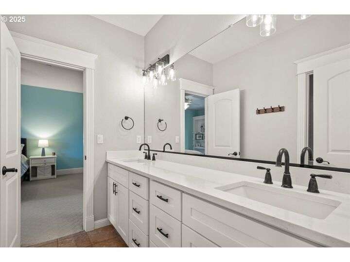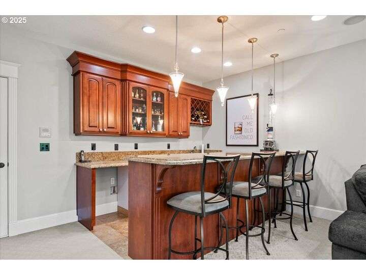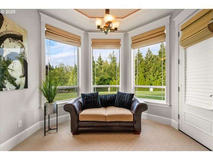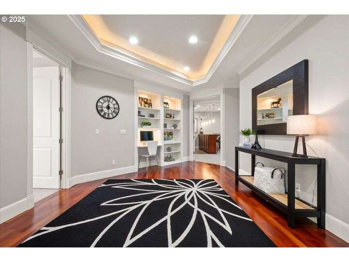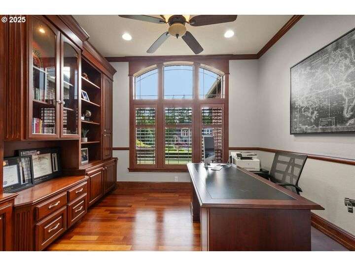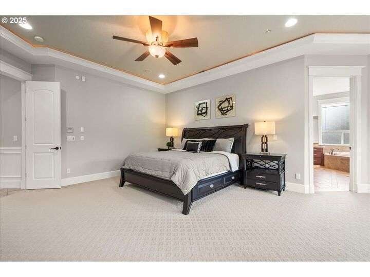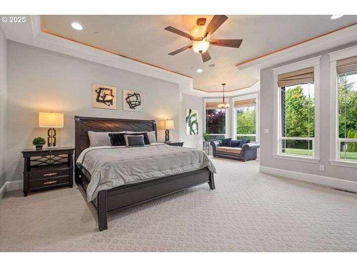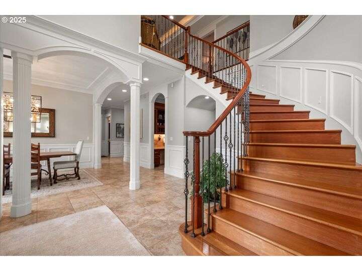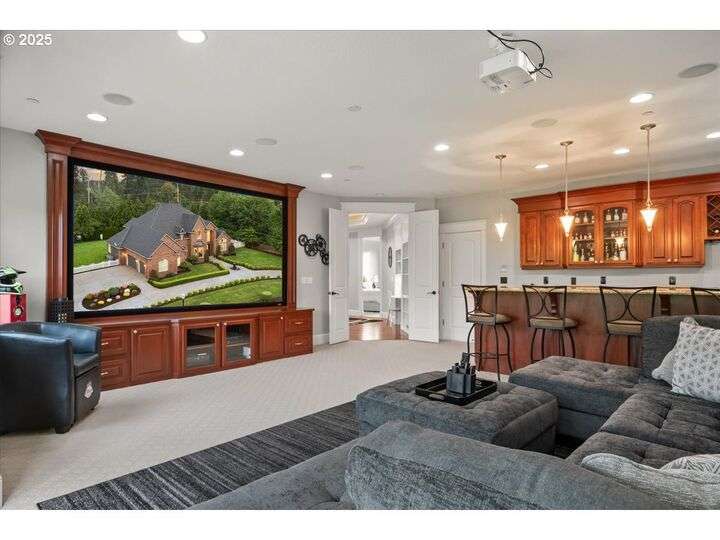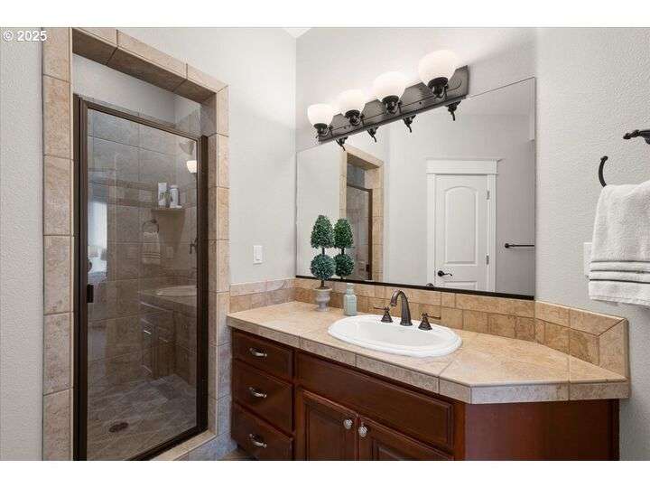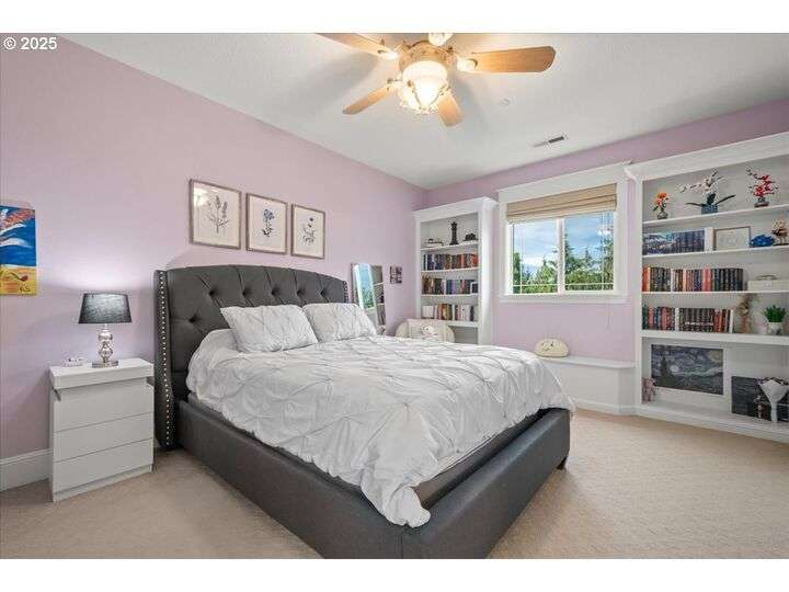 HUGE PRICE ADJUSTMENT! 1 Acre Estate in Ridgefield is Priced to Sell! This stunning 4-bedroom estate home spans an impressive 4,706 square feet! The grand high-ceiling entry welcomes you with tile floors, a wrought iron staircase featuring hardwood steps, elegant wainscotting, accent lighting, and a decorative landing. The formal dining room exudes sophistication with tile floors, coved ceilings, detailed wainscotting, and graceful pillars framing arched walkways. A cozy propane fireplace anchors the formal living room, complemented by a decorative mantel, tile surround, and mirror, with French glass doors leading to the spacious great room. Here, you’ll find 10-foot ceilings, a second fireplace with granite surround, custom built-ins, and a full wet bar with wine rack and glass cabinetry. The gourmet kitchen features custom cabinets, slab granite counters, an island with sink, full tile backsplash, top-tier Wolf propane range with griddle, built-in oven and warming drawer. The breakfast nook, bathed in natural light, opens to a covered Trex wraparound deck. Additional highlights include a den/office with built-ins, a spacious laundry room with folding station, and a secondary staircase for convenience. The luxurious primary suite offers a bayed sitting area, private deck access, and an expansive ensuite bath with jetted tub, double vanity, makeup counter, large walk-in shower, bidet, and custom closet with built-ins. Upstairs, find a hardwood landing with built-in desk, three generously sized bedrooms—two with built-ins and a Jack & Jill bath—and a vaulted guest suite with private bath. A media room features a 133 movie screen, projector, custom built-ins, and a wet bar. The oversized 3-car garage includes built-ins, a sink, and Tesla charger. Enjoy year-round entertaining with a built-in BBQ, gazebo, and wraparound covered deck in the fully fenced backyard.