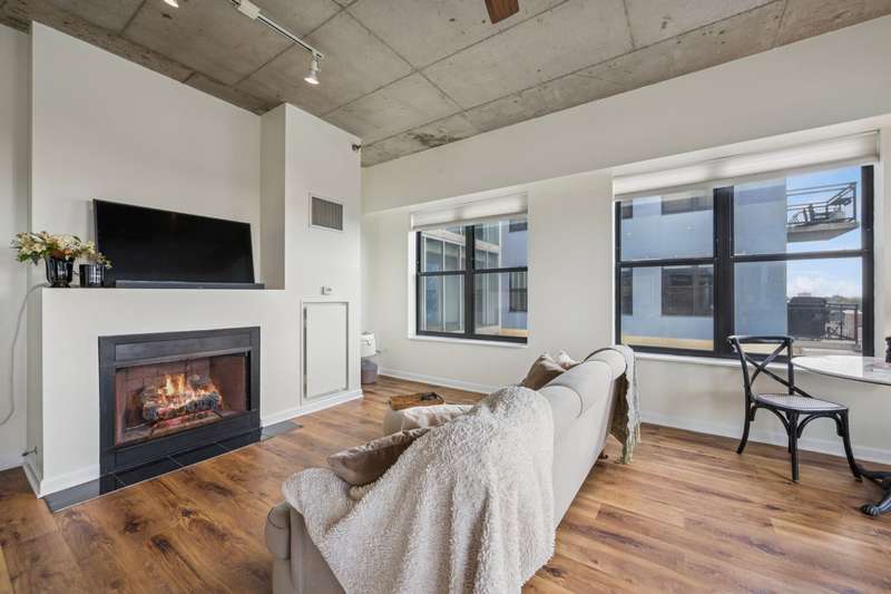 Edgewater modern loft living with sweeping west-facing views and incredible natural light! This corner unit boasts an open floor plan with 10' ceilings, oversized windows, and a cozy gas fireplace that anchors the living space. Step out to your private balcony for sunset views or entertain around the updated kitchen featuring tall custom cabinets, stainless steel appliances with a 5-burner stove, granite breakfast bar, and plenty of storage. The spacious primary suite includes a walk-in Elfa closet and a refreshed spa bath with new vanities, mirrors, and lighting, plus a soaking tub/shower. Brand-new luxury wide-plank vinyl floors run throughout, adding warmth and style. Additional highlights include in-unit laundry, a proper foyer, and a storage unit. The building offers a fitness center with lake views, a huge common rooftop deck, party room, dog run, on-site management, and a receiving room. Heated garage parking with private bike rack included. Conveniently located near Andersonville, Whole Foods, Jewel, Bryn Mawr restaurants, and just one block from the newly renovated Red Line.