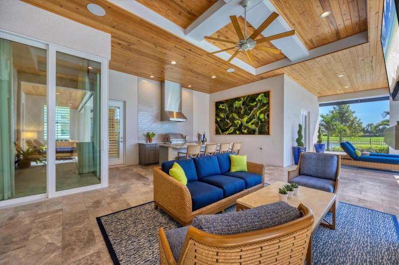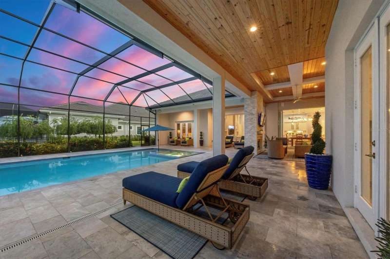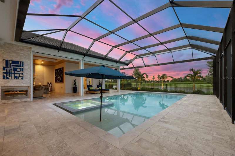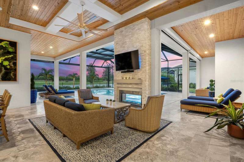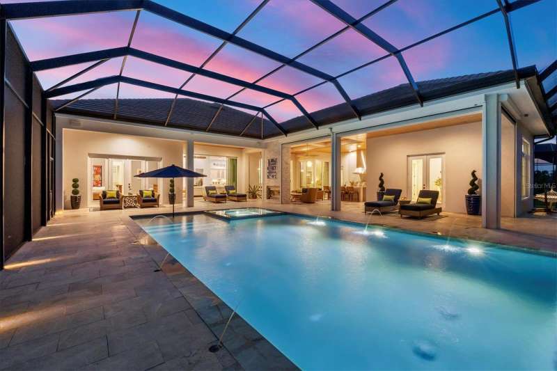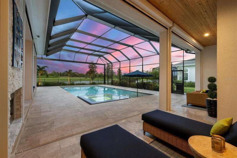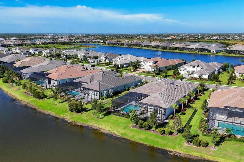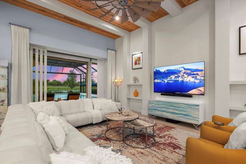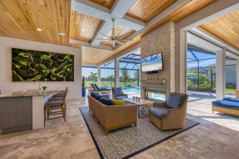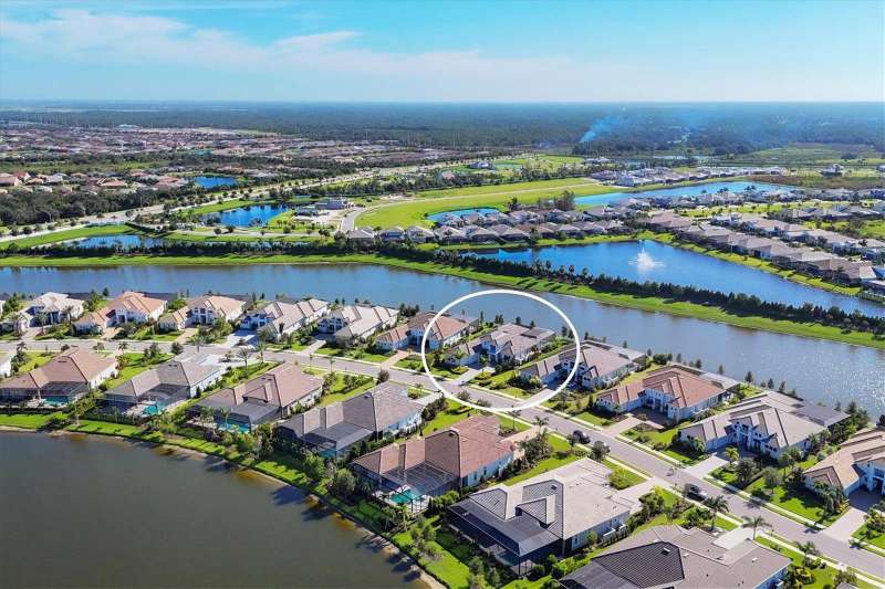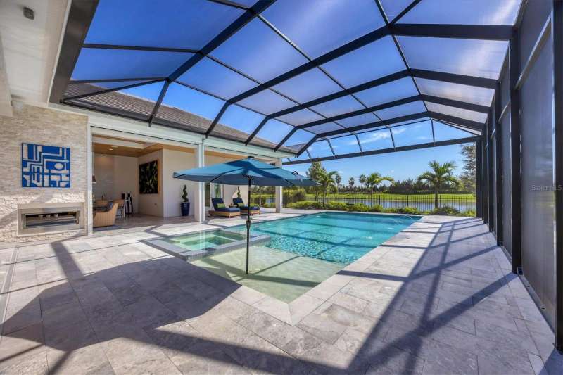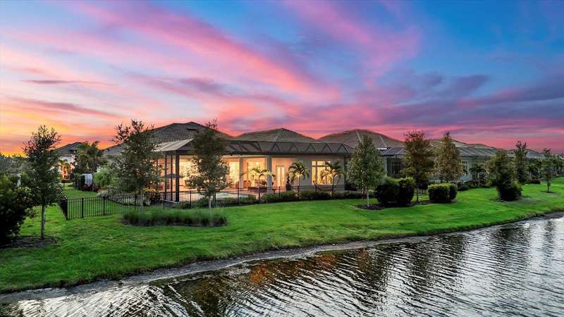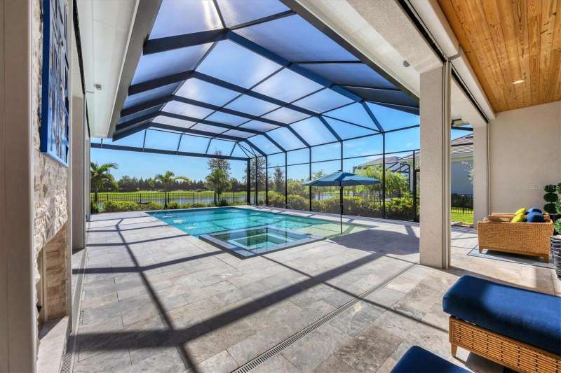 Under contract-accepting backup offers. Within the prestigious gates of The Lake Club, this stunning 4-bedroom, 5.5-bathroom estate with a private casita/bonus room and dedicated office embodies the pinnacle of elegance and resort-style living. Positioned on a serene lake with no neighbors behind, the home offers privacy and sophistication. From the moment you arrive, the paver driveway, mature landscaping with accent lighting, and a 3-car side-load garage set the tone for the refined lifestyle within. Step through the double-door entrance into a thoughtfully designed open floor plan with soaring ceilings, IMPACT GLASS windows and doors, and seamless indoor-outdoor living. The great room boasts 14-foot custom wood ceilings, 12-foot sliding doors, tile plank flooring, and custom built-ins, while the chef’s kitchen dazzles with stainless steel appliances, wall oven with convection, microwave, oversized island, dry bar, quartz countertops, and a walk-in pantry with wood shelving. The primary suite is a private retreat with double glass doors opening to the lanai, remote-controlled shades, custom closets and a spa-like bathroom featuring a walk-in shower, soaking tub, split vanities, and quartz countertops. Each additional bedroom includes an en-suite bathroom, ensuring comfort and privacy for family and guests. A highlight of the home, the casita/bonus room offers a private double-door entrance, en-suite bath with walk-in shower, quartz counters, wet bar with wine refrigerator, and remote-controlled shades—ideal as a guest suite, media room, gym or retreat. The den/study impresses with double glass doors and custom built-ins. The outdoor living area is designed for entertaining and relaxation. A panoramic screen frames sweeping water views, while the expansive lanai features a custom wood ceiling, tile deck, gas fireplace, outdoor kitchen with gas grill, wet bar, and refrigerator. The heated saltwater pool with sun shelf, infinity-edge spa, and water feature creates the perfect backdrop for resort-style living, enhanced by hurricane-rated remote-controlled screens for year-round comfort. Additional highlights include a bedroom with zero-edge sliding doors to the lanai and pool bath access, fenced yard, whole house generator, Sonos Smart Home system with Wi-Fi extenders, dimmer switches throughout and a separate laundry room with Whirlpool washer/dryer, sink, cabinets, quartz counters, and a whole house water treatment system. This home is the perfect combination of timeless design, luxurious finishes, and modern conveniences, all within Lakewood Ranch’s most coveted community renowned for its exclusive amenities, clubhouse, and lifestyle. Residents of The Lake Club enjoy a world-class array of amenities, including two resort-style heated pools, a newly renovated clubhouse with fine dining and bar, state-of-the-art fitness center, spa, tennis and pickleball courts, playground, and two dog parks—all enhanced by the services of a full-time concierge and activities director. Beyond the gates, you’re not far from award winning beaches and just minutes from The Mall at University Town Center, Lakewood Ranch Main Street, Waterside Place, downtown Sarasota and an abundance of shopping, dining and cultural destinations.