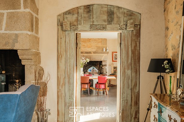 The main accommodation of approximately 420sqm exudes rustic elegance, with exposed stone walls, whitewashed beams and floors in polished concrete or authentic parquet. Bathed in light, it houses a kitchen that is both rustic and contemporary, a living room that reveals a warm atmosphere with its majestic stone fireplace, a dining room ideal for large meals with family or friends, as well as five spacious bedrooms each with its dressing room and bathroom or shower room.