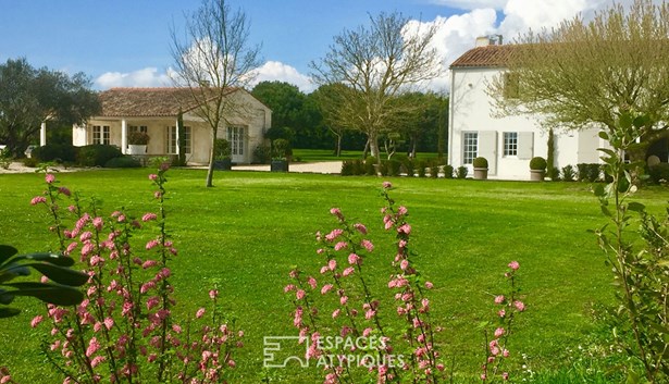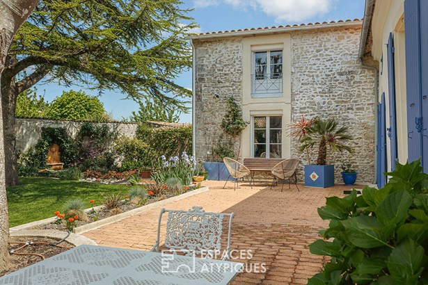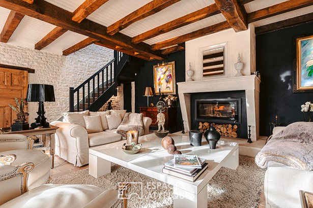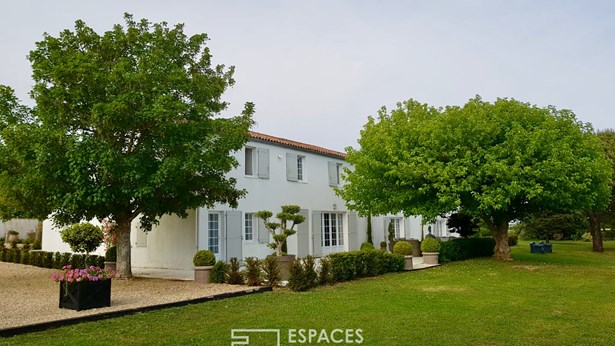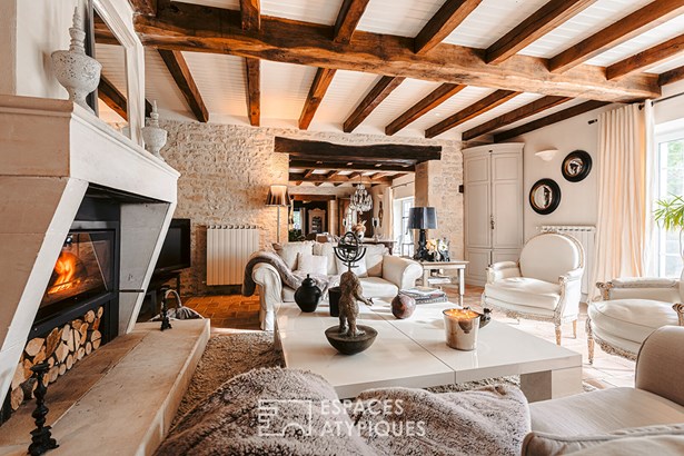 Nestled in lush countryside, this large farmhouse of approximately 400 m2 benefits from a privileged and peaceful environment, just 10 minutes from La Rochelle. The renovated old farmhouse is enhanced by the beauty of its vast park, which charms its guests with the tranquility and conviviality of the place. The main room, as a testament to the style of the property, sets the elegant tone between the stones, the exposed beams, the period terracotta tiles and the warm presence of the fireplace.