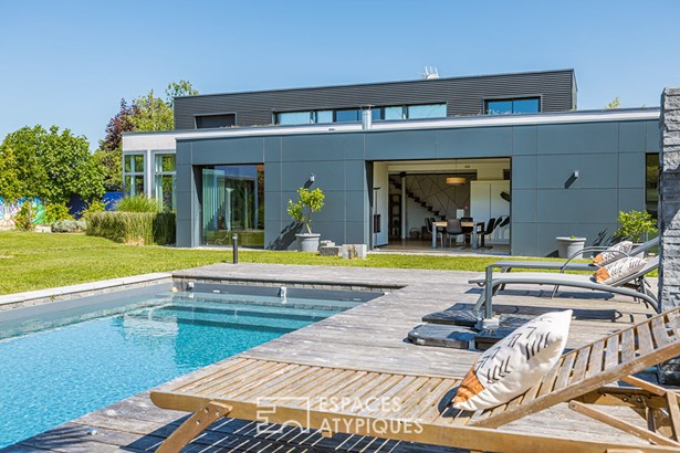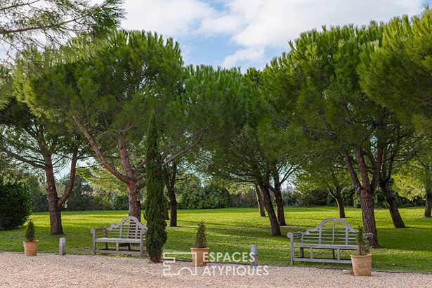 Outside, the garden of nearly one hectare has been designed to entertain and fully enjoy the calm of the place. The spaces are landscaped, green, and flourishing, between pine forest, park, terrace, and pool house courtyard.