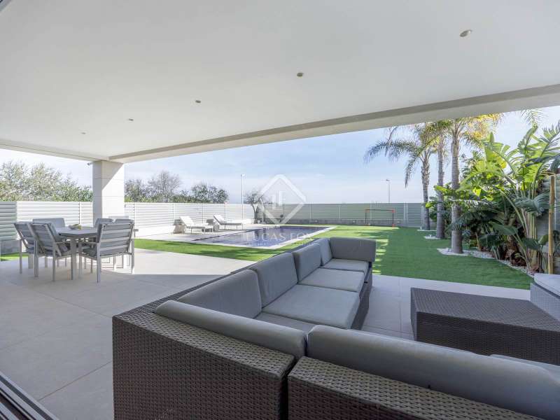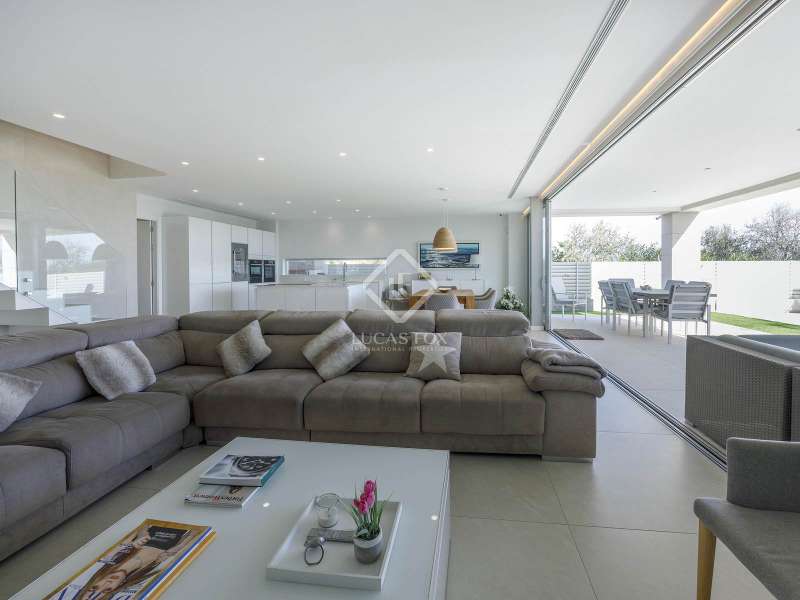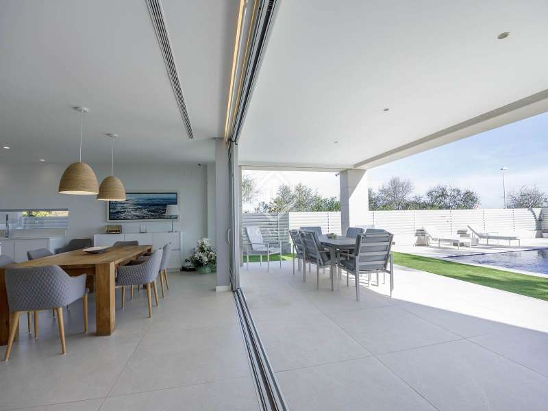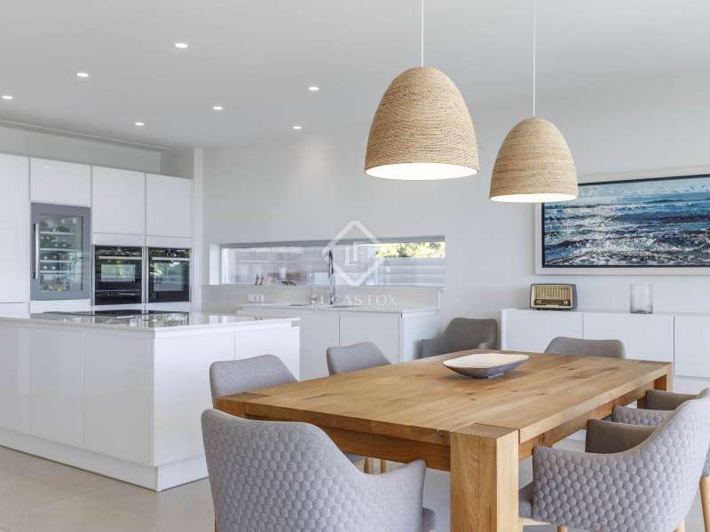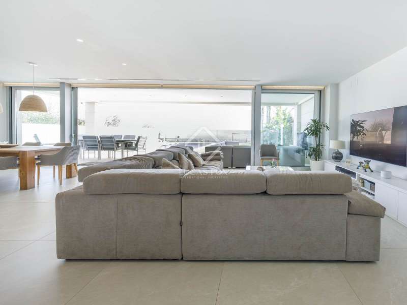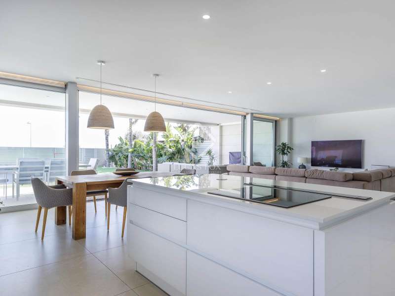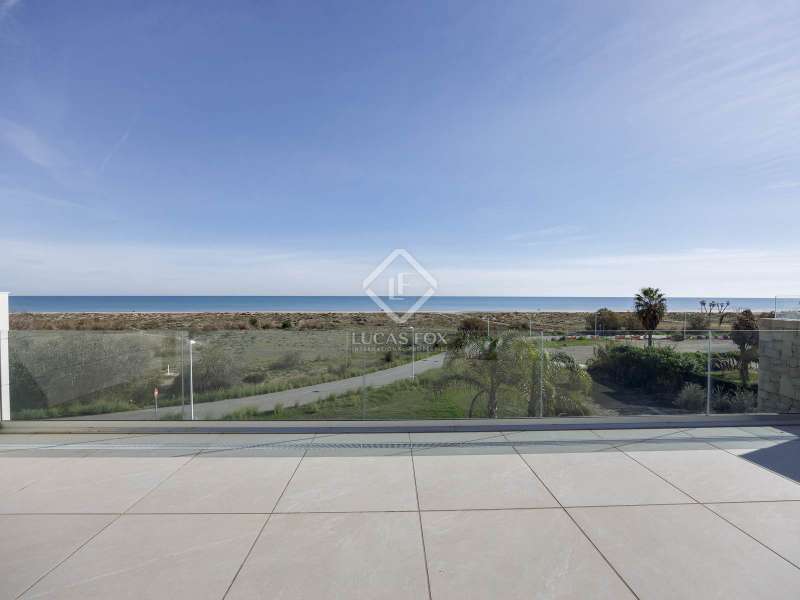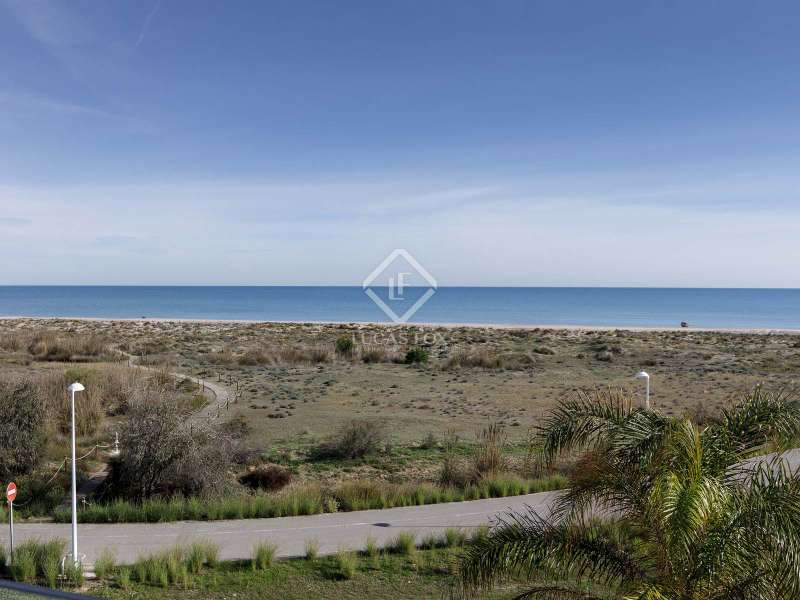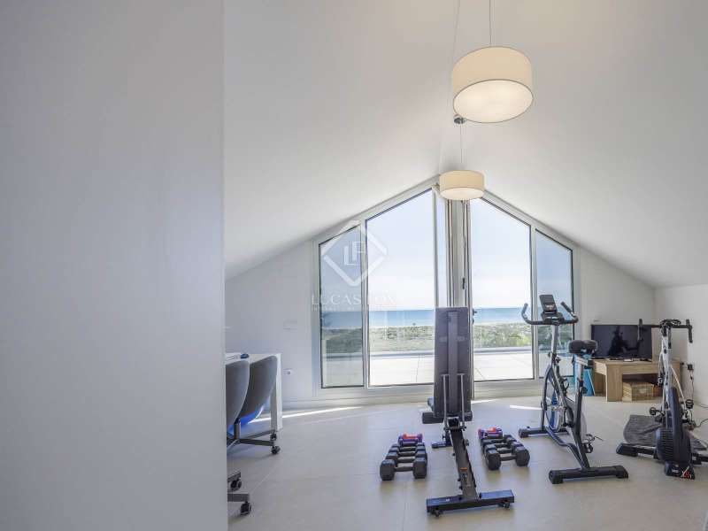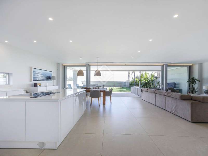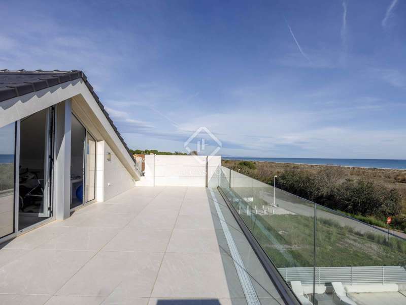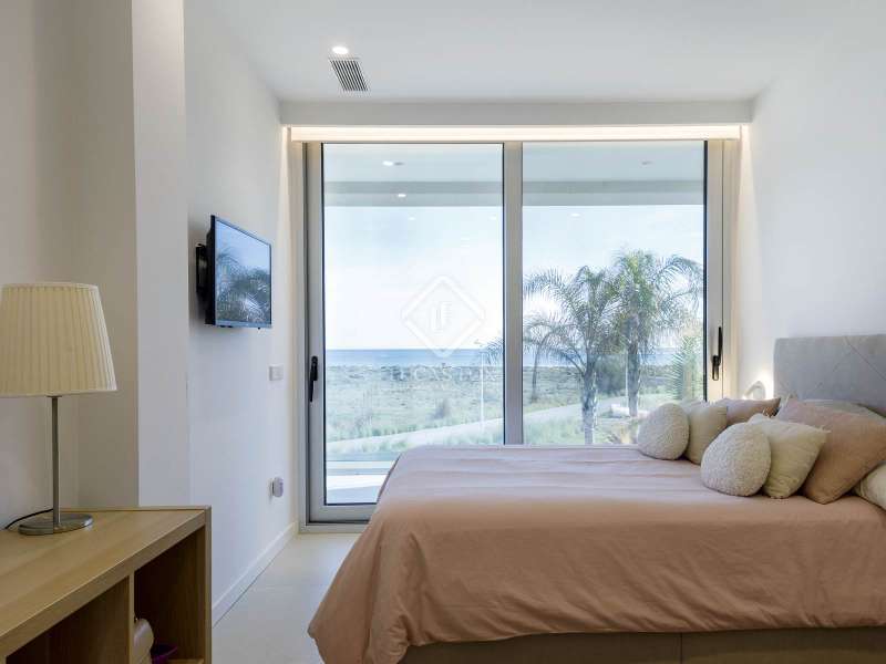 This villa in excellent condition on the beachfront of Almardá is a unique opportunity due to its features and, above all, its exclusive location, given that beachfront villas rarely come onto the market. We enter the property through a large entrance hall that opens onto the living-dining room. The spacious and bright living-dining room with its open and integrated kitchen with an island creates a large space that in turn gives us direct access to the covered terrace with a lounge area, a dining area and the garden with its swimming pool equipped with a salt-chlorinator system. On this same floor we also find a laundry room, a small bedroom and a full bathroom with a shower. We go up the stairs to the first floor. As soon as we go up to this night area we find on the right the first double bedroom with en-suite bathroom . Turning to the left we find two other large bedrooms with panoramic views of the sea and a full bathroom to share, but with direct access from both bedrooms. Following the corridor we arrive at the large main bedroom with an integrated dressing room and a large en-suite bathroom equipped with a shower as well as a bathtub. If we go up one more floor , we find a large and bright space currently used as an study and gym and which also has access to a large terrace with unobstructed and panoramic views of the beach with its dunes and the sea. The exterior of the property has a practical, low-maintenance garden with a rectangular 10m x 4m pool equipped with a salt-chlorinator system, several terraces, an exterior kitchen, two storage rooms and, as a highlight, direct access to the beach that we find right in front. It is also worth knowing and highlighting that this villa is equipped with an aerothermics system, underfloor heating, ducted air conditioning (hot/cold), a water softening system, security windows and has a great security system with an alarm and a wired camera circuit. If you are interested in receiving more information or in making a visit, do not hesitate to contact us.