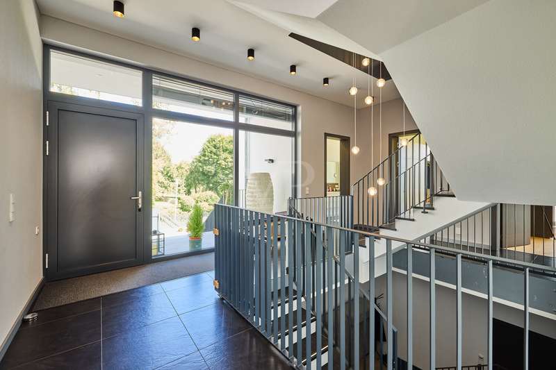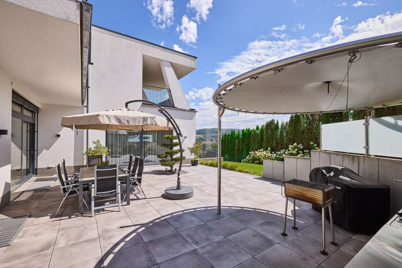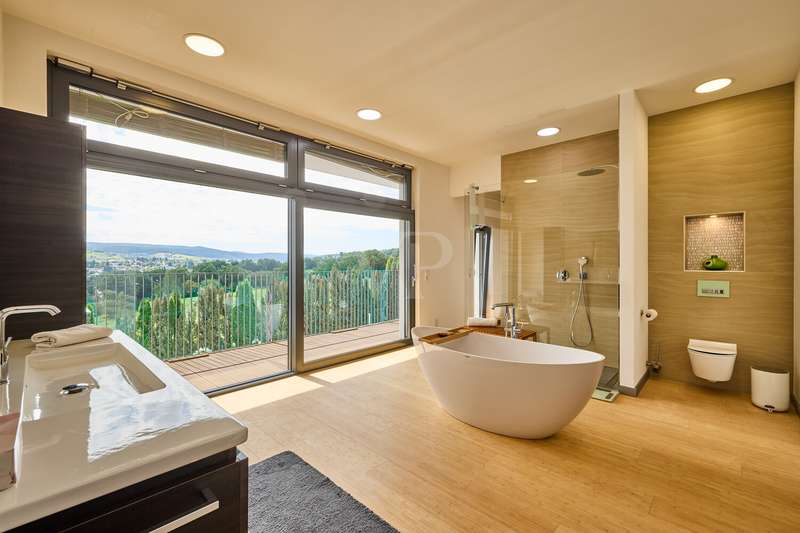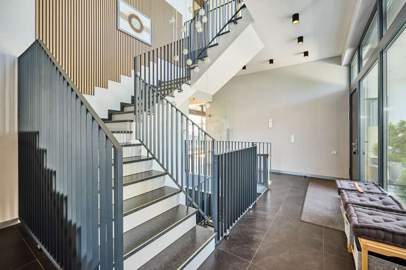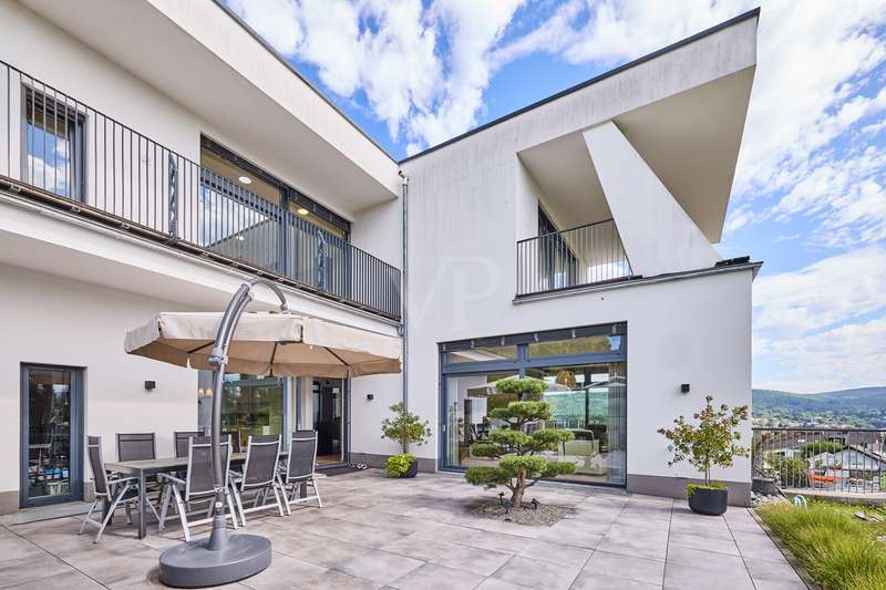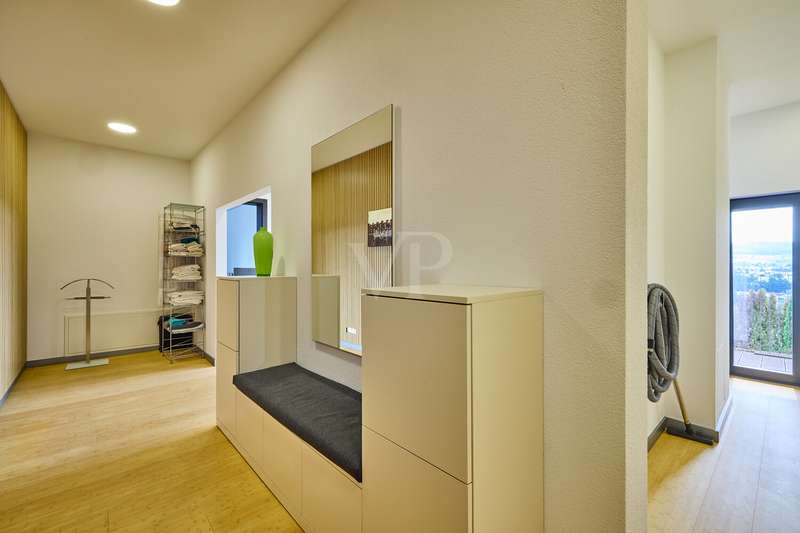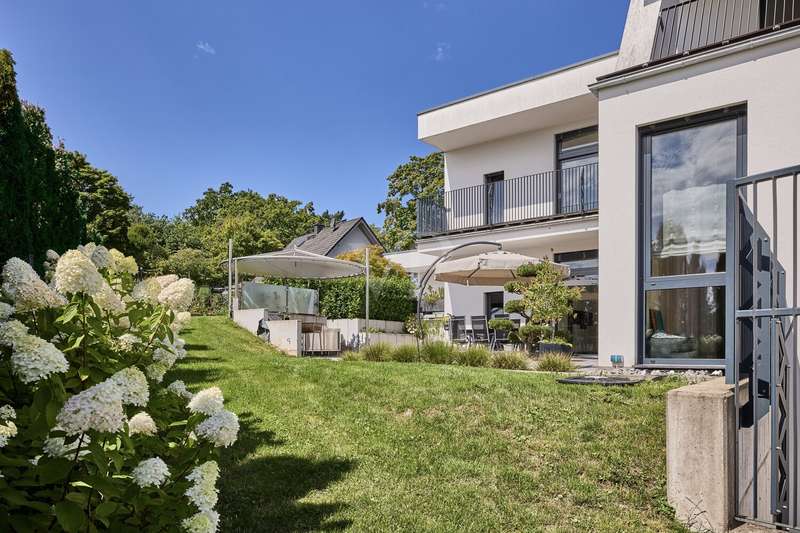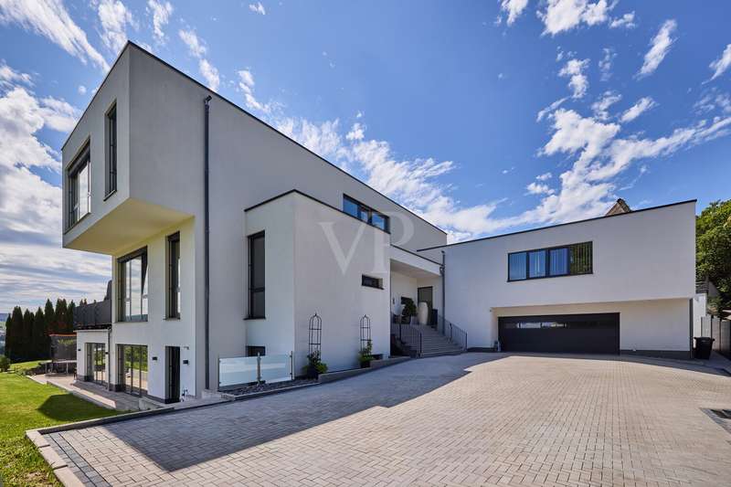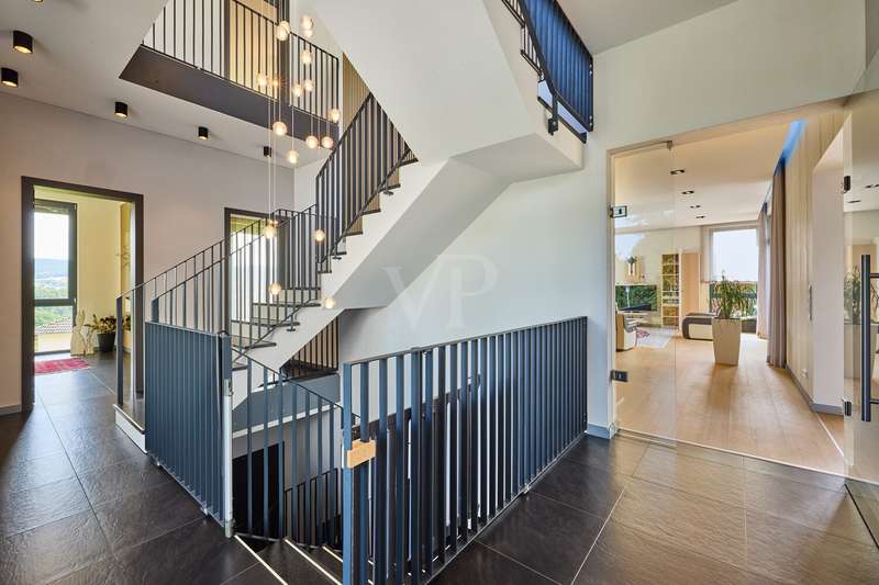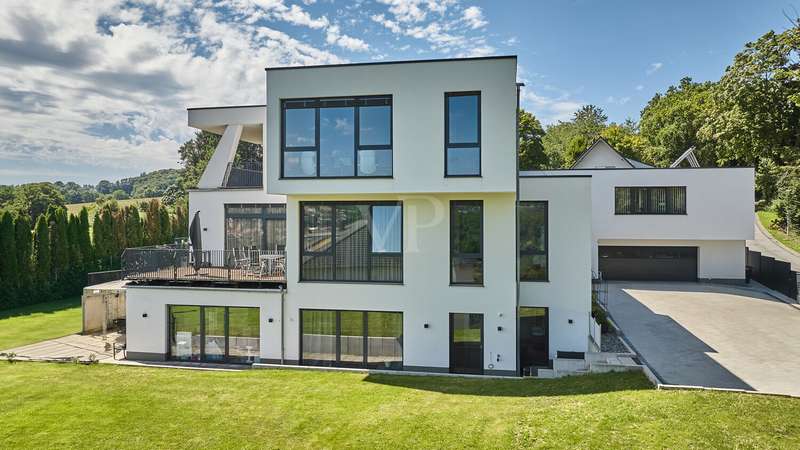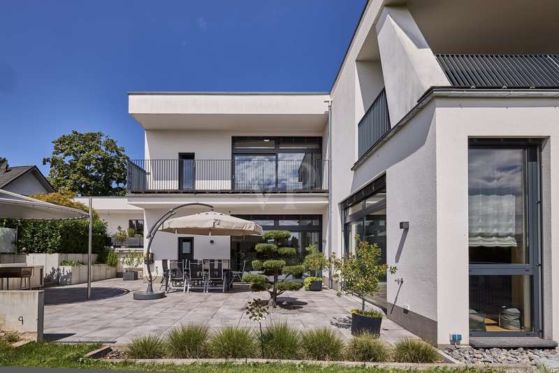 A refuge of tranquillity and sophistication. In an exposed residential area of Michelstadt, close to nature and in a quiet location with a panoramic view over the town, you will find this modern, high-quality architect-designed house in solid construction. The impressive entrance area of the property is reached via the staircase leading from the inner courtyard. A large checkroom offers plenty of space to store your clothes. On the first floor, there is a spacious living/dining room with seamless access to a balcony at the side. The entire living area is fitted with real wood parquet and high-quality tiled flooring. The open and bright living space concept with floor-to-ceiling windows and sliding glass door elements ensures a special feel-good ambience in the interior. The elegant, large designer kitchen impresses with high-quality kitchen appliances from Gaggenau, a separate wine refrigerator and a teppanyaki grill, to name just a few of the highlights in this area. This room is complemented by a concealed pantry. The floor-to-ceiling patio door in the kitchen area guarantees direct access to the sun-drenched terrace. In this area there is a high-quality outdoor kitchen and access to the upper part of the garden. The first floor level also houses a separate guest bedroom and a daylight bathroom with a walk-in shower. All rooms have an impressive ceiling height of approx. 3.50m. The staircase to the upper floor is discreetly clad with acoustic panels, in this area you will find two offices, the spacious master bedroom with seamless access to the covered balcony and a breathtaking and unobstructed view over the city. Another highlight of this living level is the master bathroom with a free-standing bathtub and a dressing room integrated into the room, which was custom-made by a carpenter especially for this purpose. Like the master bedroom, the master bathroom is connected to a balcony and offers a wonderful view of the greenery thanks to the floor-to-ceiling windows and sliding door elements. The property also offers two granny apartments in the basement area, consisting of a bedroom, kitchen, bathroom and terrace, as well as a further granny apartment with a separate entrance, consisting of a bedroom, kitchen, living/dining room, bathroom, office and terrace. Simple cleaning of the large rooms is ensured by the vacuum cleaner system built into the wall on each living level. There is further space for expansion above the garage in the recreation area, which extends over the entire area of approx. 90 sqm, including a further bathroom and a sauna area as well as a separate terrace. The spacious garage offers storage space for up to 4 vehicles and direct access to the living area of the property. The garage also houses the building's utility room and server room. The spacious outdoor area offers plenty of space to relax in the sun on various levels. There is also an optional building plot of approx. 400 sqm at the front of the property.