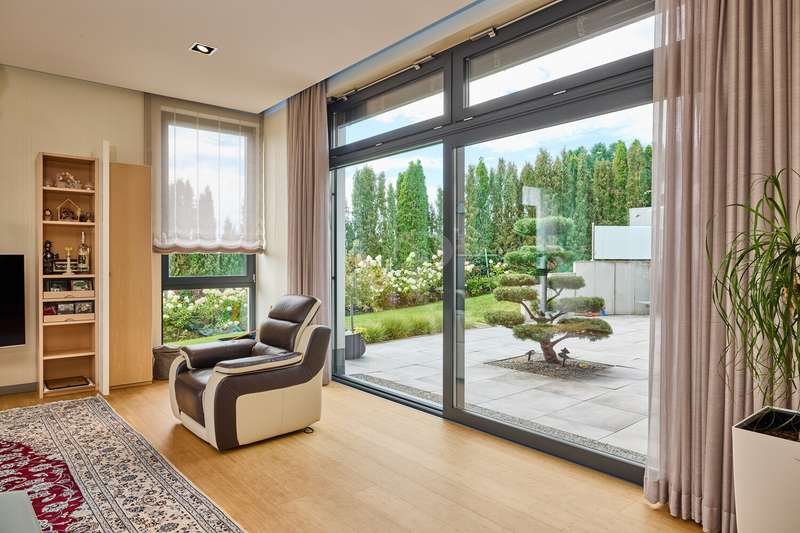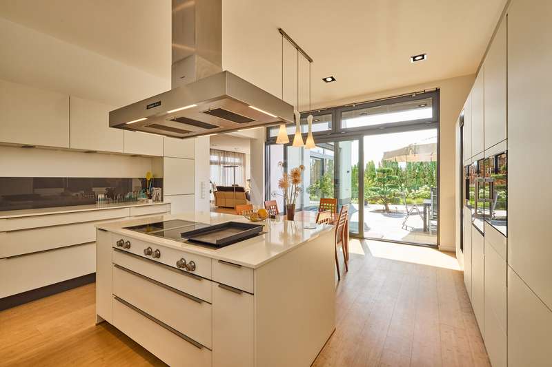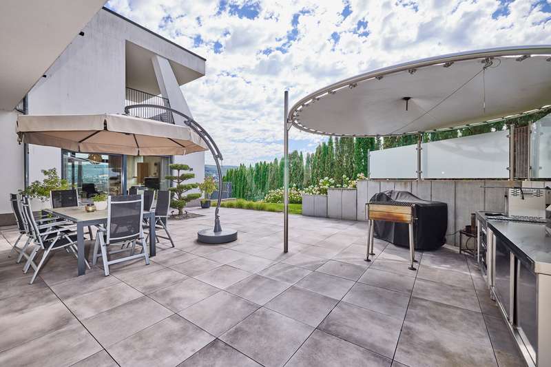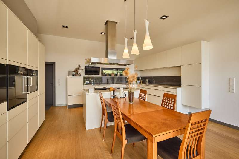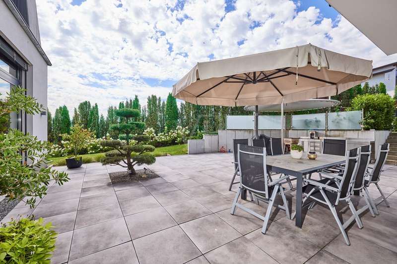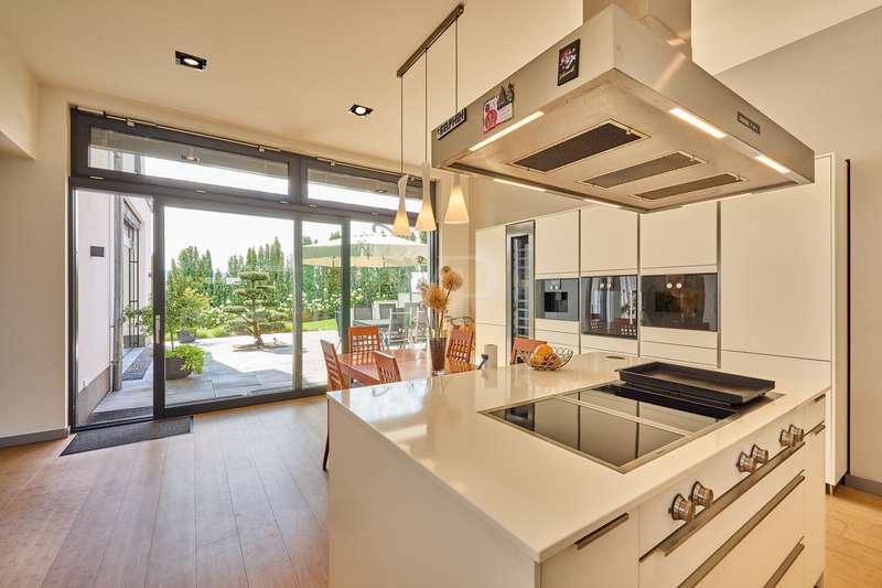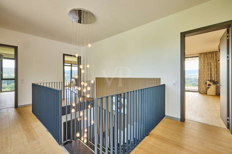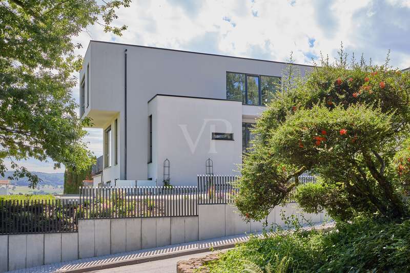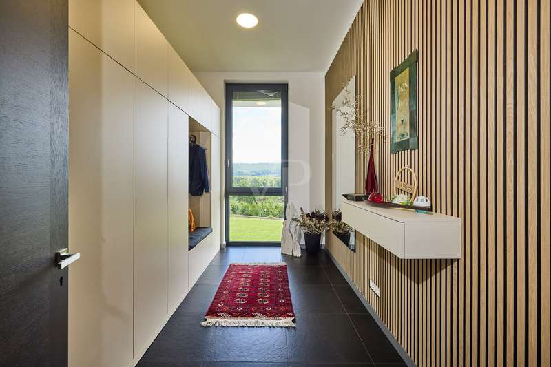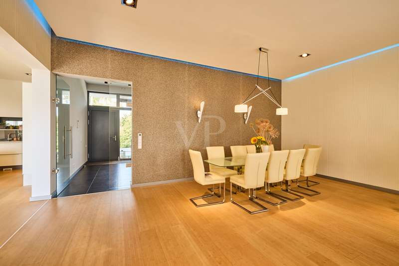 A refuge of tranquillity and sophistication. In an exposed residential area of Michelstadt, close to nature and in a quiet location with a panoramic view over the town, you will find this modern, high-quality architect-designed house in solid construction. The impressive entrance area of the property is reached via the staircase leading from the inner courtyard. A large checkroom offers plenty of space to store your clothes. On the first floor, there is a spacious living/dining room with seamless access to a balcony at the side. The entire living area is fitted with real wood parquet and high-quality tiled flooring. The open and bright living space concept with floor-to-ceiling windows and sliding glass door elements ensures a special feel-good ambience in the interior. The elegant, large designer kitchen impresses with high-quality kitchen appliances from Gaggenau, a separate wine refrigerator and a teppanyaki grill, to name just a few of the highlights in this area. This room is complemented by a concealed pantry. The floor-to-ceiling patio door in the kitchen area guarantees direct access to the sun-drenched terrace. In this area there is a high-quality outdoor kitchen and access to the upper part of the garden. The first floor level also houses a separate guest bedroom and a daylight bathroom with a walk-in shower. All rooms have an impressive ceiling height of approx. 3.50m. The staircase to the upper floor is discreetly clad with acoustic panels, in this area you will find two offices, the spacious master bedroom with seamless access to the covered balcony and a breathtaking and unobstructed view over the city. Another highlight of this living level is the master bathroom with a free-standing bathtub and a dressing room integrated into the room, which was custom-made by a carpenter especially for this purpose. Like the master bedroom, the master bathroom is connected to a balcony and offers a wonderful view of the greenery thanks to the floor-to-ceiling windows and sliding door elements. The property also offers two granny apartments in the basement area, consisting of a bedroom, kitchen, bathroom and terrace, as well as a further granny apartment with a separate entrance, consisting of a bedroom, kitchen, living/dining room, bathroom, office and terrace. Simple cleaning of the large rooms is ensured by the vacuum cleaner system built into the wall on each living level. There is further space for expansion above the garage in the recreation area, which extends over the entire area of approx. 90 sqm, including a further bathroom and a sauna area as well as a separate terrace. The spacious garage offers storage space for up to 4 vehicles and direct access to the living area of the property. The garage also houses the building's utility room and server room. The spacious outdoor area offers plenty of space to relax in the sun on various levels. There is also an optional building plot of approx. 400 sqm at the front of the property.