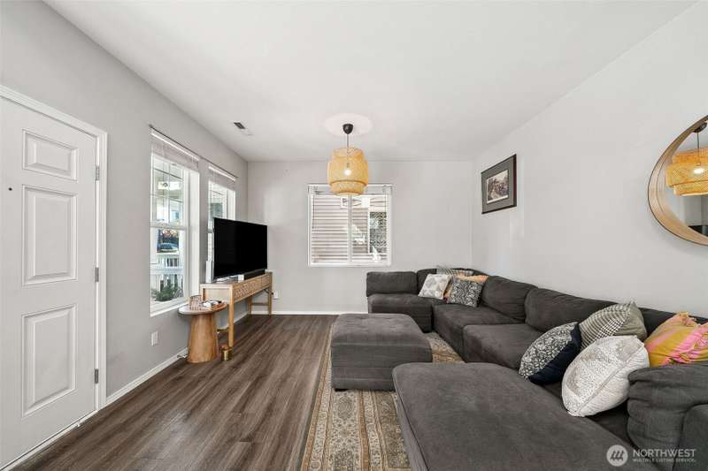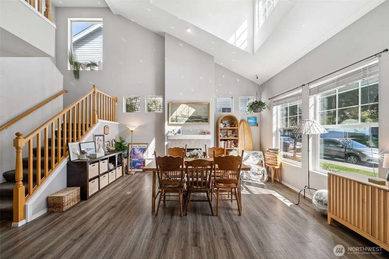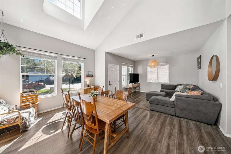 Welcome to Verona South, a gated community in desirable Lakeland Hills! This charming 3-bedroom, 2.25-bath home is filled with natural light and features an open-concept main level with stunning 20+ ft vaulted ceilings in the living and dining areas. The dream kitchen boasts a large island, plentiful cabinets, ample counter space, and stainless steel appliances—ideal for entertaining! Upstairs, you'll discover two spacious bedrooms, generous walk-in closet space, laundry, and an expansive primary suite. Enjoy a low-maintenance yard with a roomy private yard + patio. The Lakeland community offers a wealth of amenities, including parks, trails, dining, and convenient access to HWY 167 & 18, as well as the Sounder Train! Up to 1% buyer CREDIT!