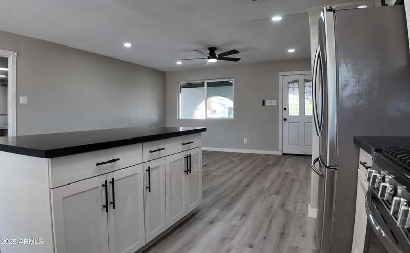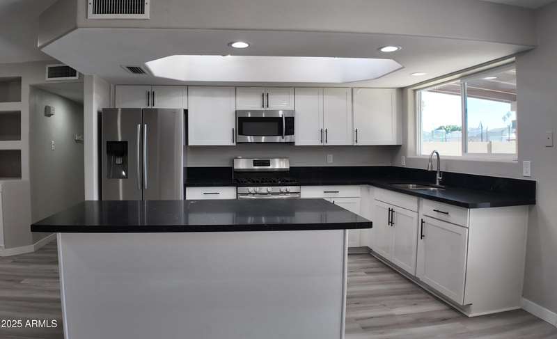 Welcome to this beautifully updated North Phoenix starter home featuring a large workshop, new energy efficient dual pane windows, wood-like vinyl flooring, and modern fans and light fixtures. The remodeled kitchen offers new cabinets, sleek black quartz countertops, and a spacious breakfast bar. Enjoy a 3-car tandem garage, a storage shed, covered patio, and a generous 7,720 sq ft lot with planters ready for your next veggie project —perfect to customize to your liking. Conveniently located near schools, parks, shopping, and I-17 access.
