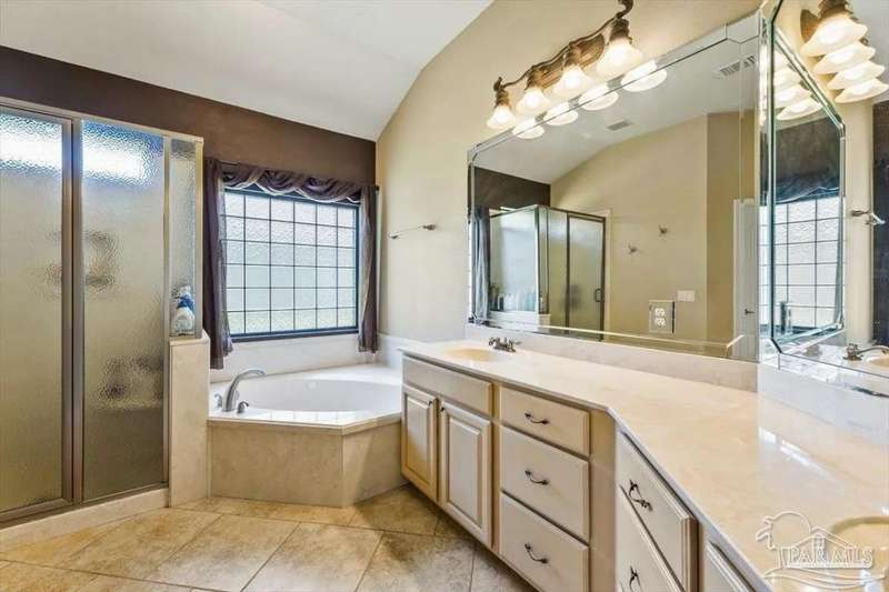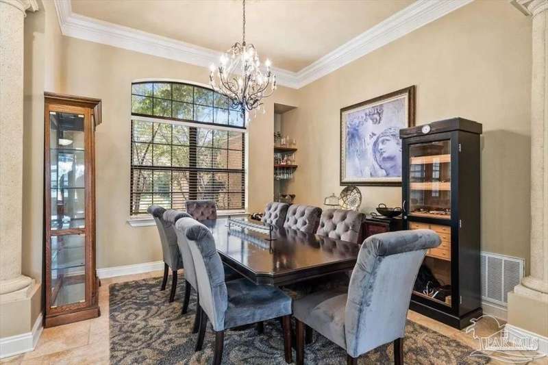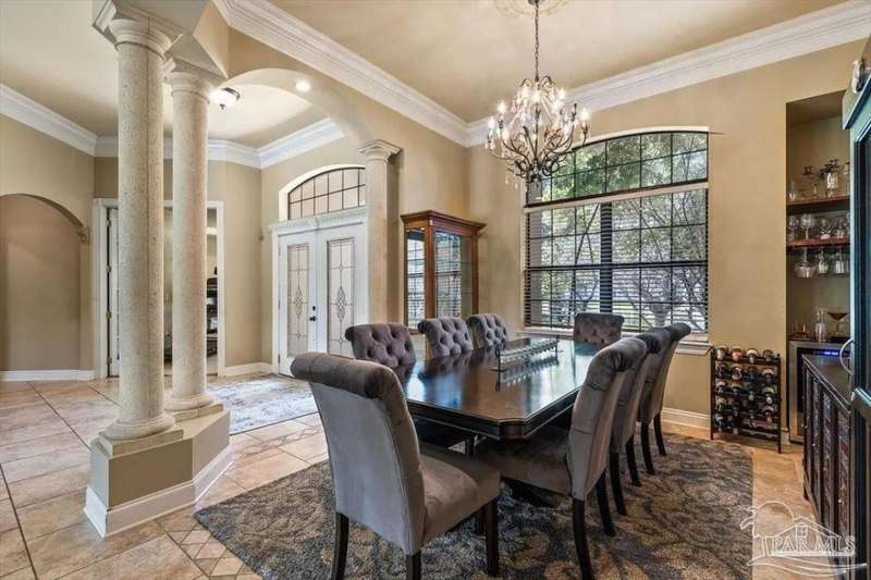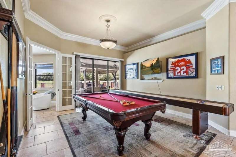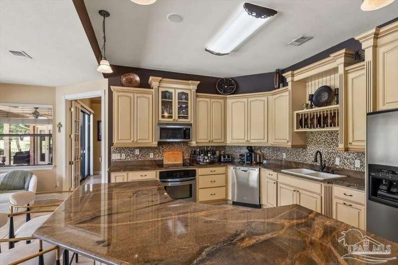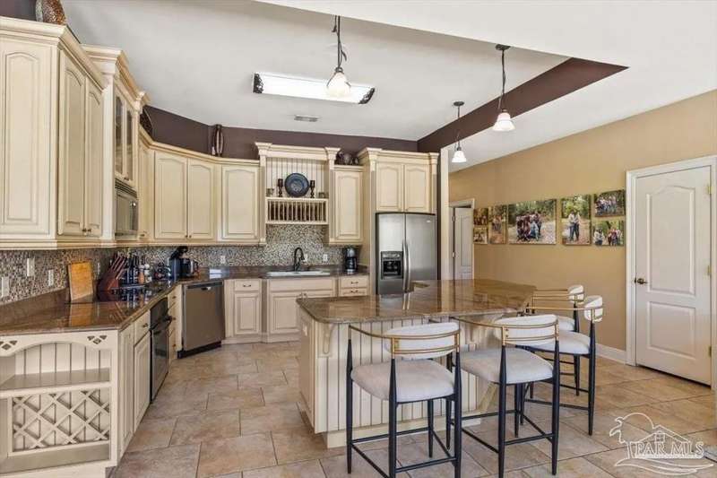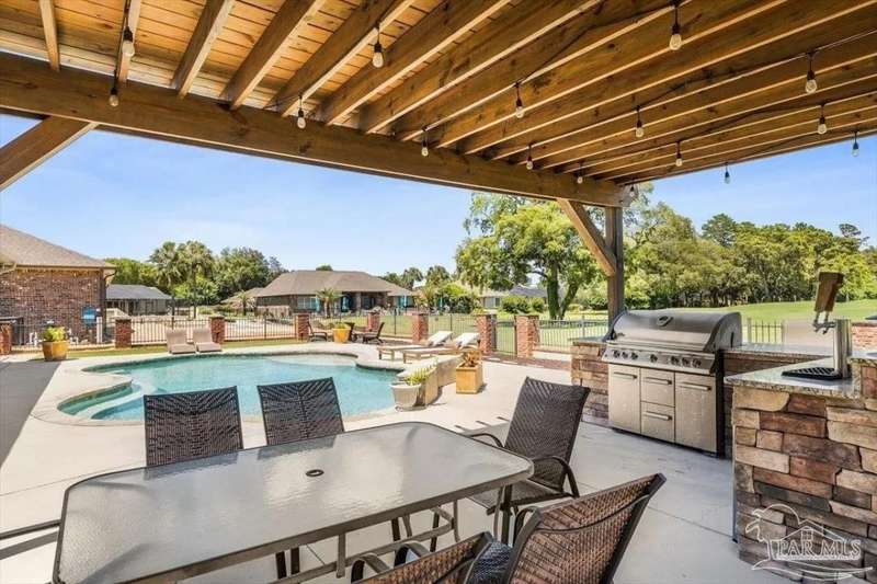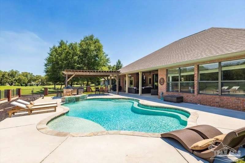 Luxury Golf-Course Living in Hidden Creek Estates! Welcome to 2858 PGA Boulevard - an immaculate 4-bedroom, 3-bath home perfectly positioned on the 11th fairway of the Hidden Creek Golf Course in the desirable Holley by the Sea community. This 3,096 sq ft custom-built brick residence showcases elegant architectural details, a resort-style pool, and exceptional indoor-outdoor living designed for comfort and entertaining. Step inside the grand double-door entry to soaring ceilings, decorative columns, crown molding, and an abundance of natural light. The open, split-bedroom floor plan features formal living and dining rooms, a spacious family room overlooking the golf course, and a private office or flex space with French doors. The chef's kitchen is the heart of the home, complete with granite countertops, stainless-steel appliances, a large center island, breakfast bar, and custom cabinetry. The adjoining breakfast nook and leisure room open to the screened lanai for effortless entertaining. The luxurious primary suite offers serene golf-course views, direct pool access, a spa-inspired bathroom with dual vanities, a jetted garden tub, a tiled walk-in shower, and a large walk-in closet. Three additional bedrooms and two full baths provide ample space for family or guests. Enjoy Florida living at its finest in the backyard oasis - complete with a sparkling in-ground pool, sun deck, outdoor kitchen, and panoramic fairway views. The beautifully landscaped .34-acre lot also includes an irrigation system, privacy fencing, and a side-entry 2-car garage. Residents of Hidden Creek enjoy exclusive access to the Holley by the Sea Recreation Center featuring tennis, pickleball, fitness facilities, multiple pools, a private beach house with boat launch, and year-round community events. Conveniently located near top-rated schools, shopping, and the white-sand beaches of Navarre Beach, this home delivers a rare combination of elegance, lifestyle, and location.