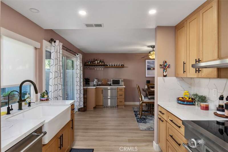 The interior is filled with natural light streaming through dual-pane windows, enhanced by soaring ceilings and automatic shades in the living room. The open layout is complemented by luxury vinyl plank flooring, recessed lighting, and a fresh modern color palette. The expanded kitchen is the true heart of the home, showcasing quartz countertops, a ceramic farmhouse sink, premium Thermador appliances, and a reverse osmosis system. Every detail has been considered, from the new electrical panel and copper plumbing to the tankless water heater and water softener, ensuring both comfort and peace of mind.