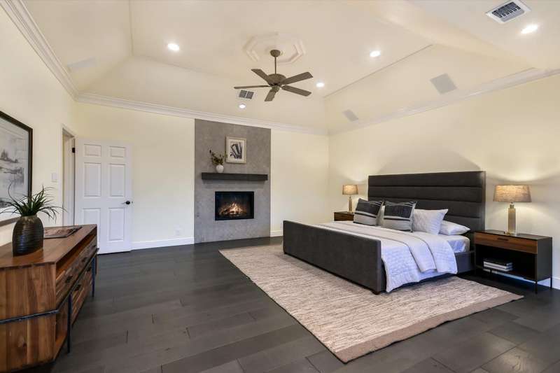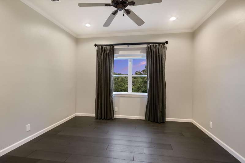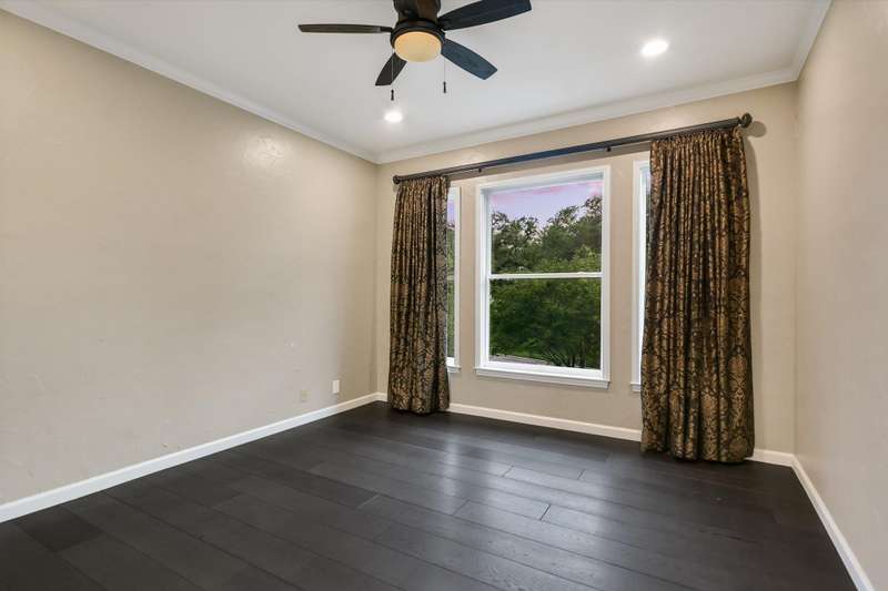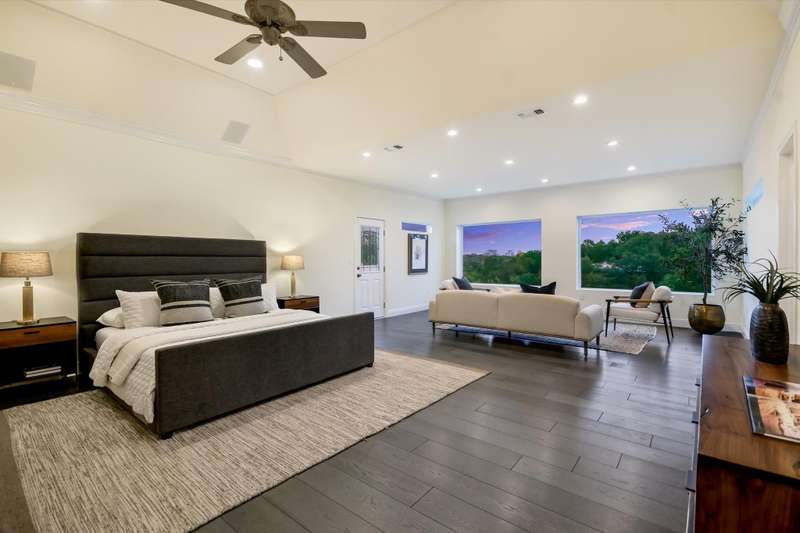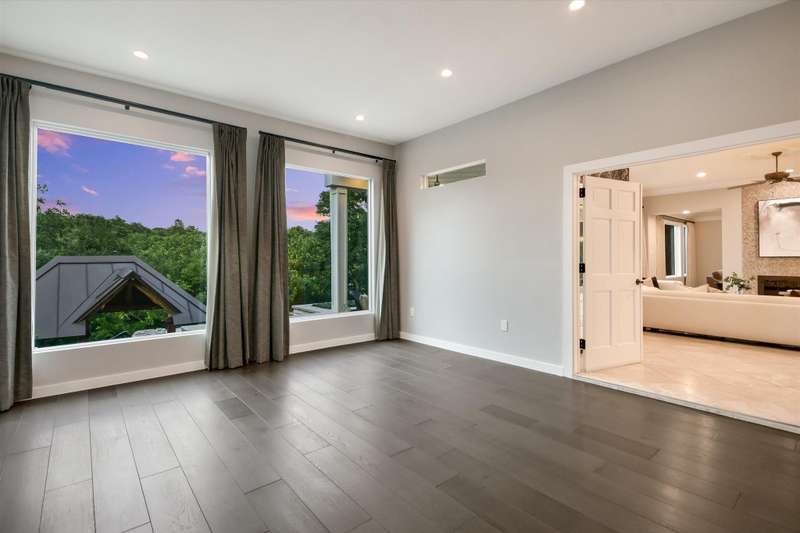 A dramatic curved staircase rises to the upper level, where two bedrooms share a Jack-and-Jill bath. The striking primary suite has been doubled from its original proportions, adding a large, windowed sitting area overlooking the valley. An equally large deck is accessible off the primary bedroom and offers an incredible view of the UT tower and a glimpse of downtown. The updated bath features a custom-tile steam shower, soaking tub & walk-in closet.