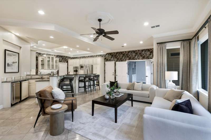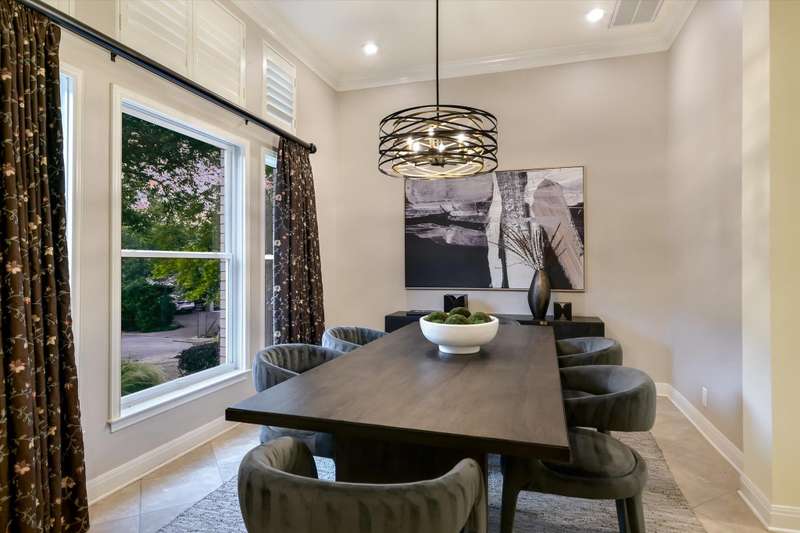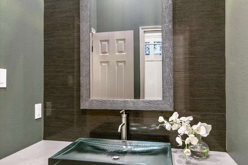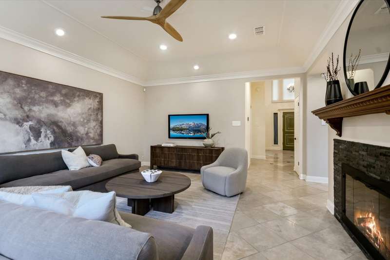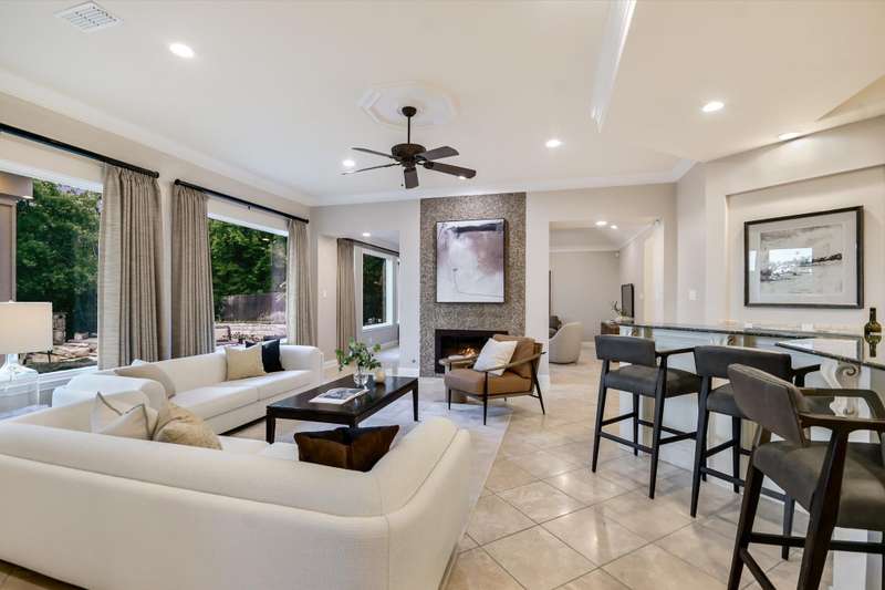 The interior offers plenty of space to start the party, with two large, window-lined living areas overlooking the terrace, pool and lush valley below; a double-sided fireplace warms both rooms. Guests can stop for a drink at the convenient step-in bar on their way outside. The large skylit kitchen is outfitted with Viking appliances and plenty of storage. Adjacent to the kitchen, a large hobby or playroom provides additional space for life's messier pursuits and can be shut off for privacy. The main floor also includes a formal dining room and an office/bedroom with a closet and full bath.