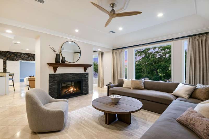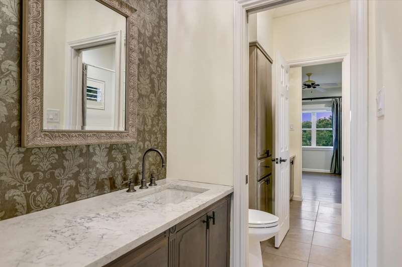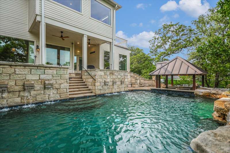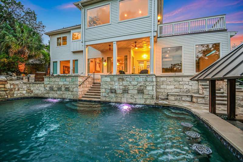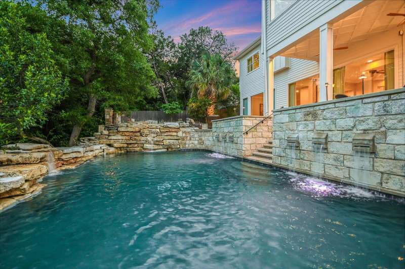 Stunning, resort-style outdoor living in desirable Barton Hills. Perched high above Barton Creek, the back yard has been transformed into a terraced wonderland for swimming, lounging and entertaining. Floating in the stone-surrounded pool which overlooks the lush creek valley feels like bathing in nature. Outfitted with all the amenities, the pool has a volleyball setup, waterfall, hot tub and even a swim-up bar. Serve drinks in the outdoor kitchen pavilion where you can also grill up dinner for your guests. Surrounding the water, a stone patio features a seating area and fire pit.