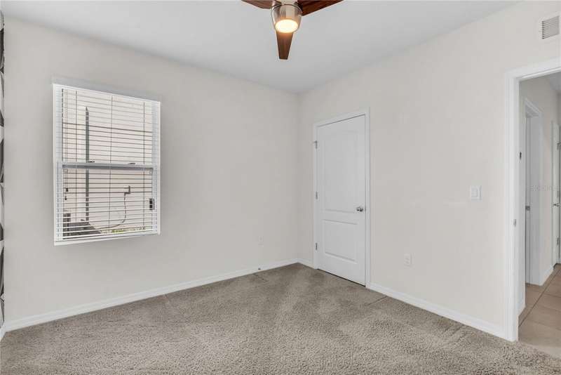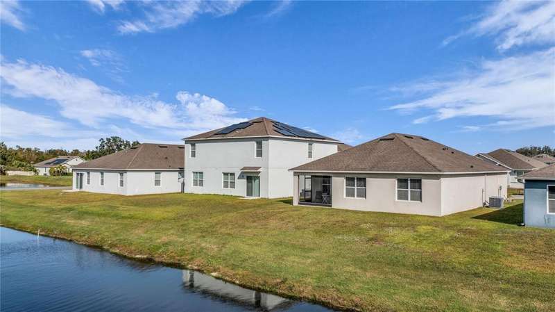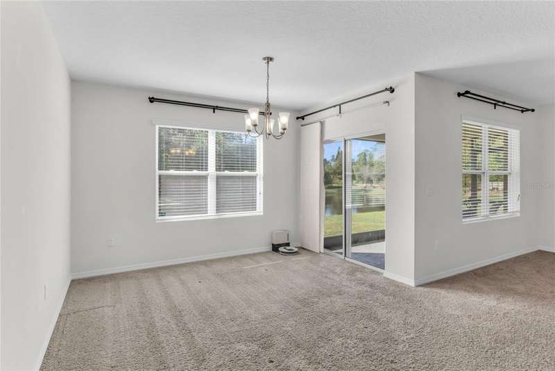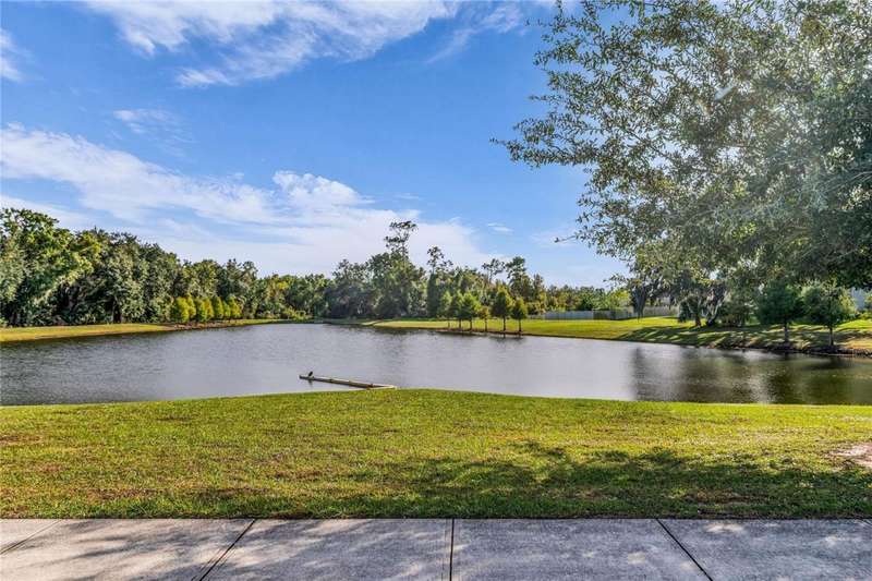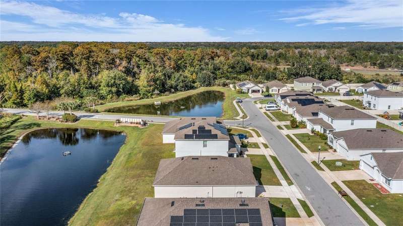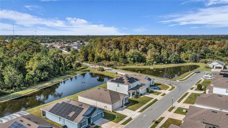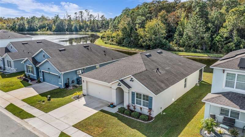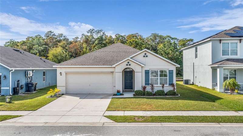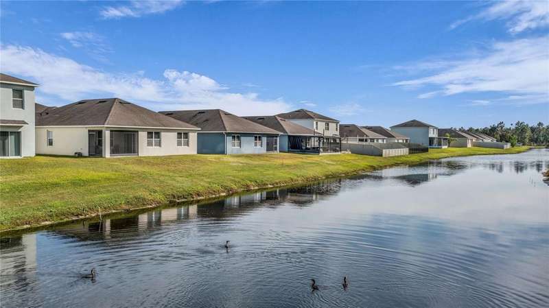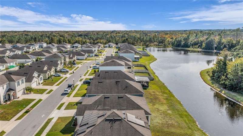MOVE-IN READY home in the gated Sereno community of Davenport offering 3 bedrooms, 2 bathrooms, a 2-car garage, and a tranquil pond and wooded view with no rear neighbors. This DR Horton 'Aria smart home features a bright open floor plan with neutral paint, ceramic tile in the foyer, kitchen and bathrooms and a split-bedroom layout for privacy. The kitchen opens to the dining and family rooms and includes 36 shaker cabinets, laminate countertops, breakfast bar, stainless steel appliances, a walk-in pantry, and an upgraded backsplash. The spacious family room overlooks the screened-in patio and backyard, providing a peaceful place to enjoy morning coffee or unwind in the evening. The owner's suite offers a large walk-in closet with built-in shelving and an en-suite bath featuring dual 'adult-height vanities, a glass-enclosed shower, water closet, and linen closet. Two guest bedrooms are located near the front of the home and share a full bath with a tub/shower combo and matching vanity height. The indoor laundry room includes the washer, dryer, drying racks, and extra cabinetry for storage. Updates include ceiling fans in all bedrooms, family room, and patio; new kitchen and guest bath backsplashes; new faucets in the owner's bath; interior paint; new microwave; and a new motor and opener for the garage door. The screened patio extends the living space and highlights the beautiful pond and wooded backdrop. Sereno is a completed, gated community featuring two resort-style pools, cabanas, playgrounds, walking trails, and conservation areas, with easy access to Hwy 17/92, I-4, ChampionsGate, Celebration, and Central Florida's theme parks. This well-maintained home by its original owners is move-in ready-offering comfort, privacy, and convenience in one of Davenport's most desirable communities.