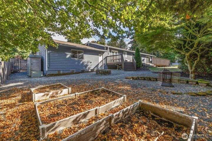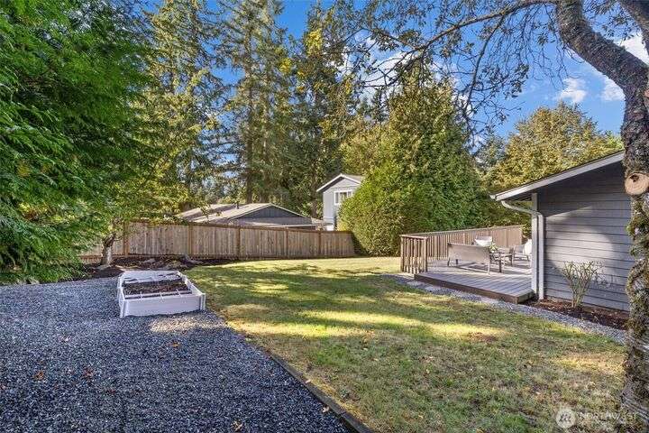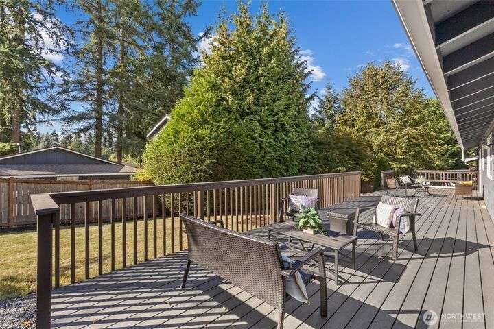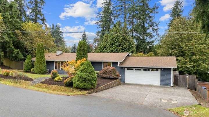 Tastefully updated rambler sits comfortably on a large corner lot in the coveted Northshore School District. New floors & paint throughout this turn-key home. Natural light floods through over-sized skylights & windows creating a light & bright great-room. Granite countertops & SS appliances compliment shaker cabinets in this open-concept, galley kitchen. Living room w/ cozy, gas fireplace & additional family room offer versatile gathering space for all. Down the hall leads to primary bedroom with en-suite bath & a full bath serving the additional bedrooms. An extra room offers space for work from home, guest room, or additional bedroom. Huge, newly refinished deck leads to meticulous landscape w/ mature trees for private outdoor living.
