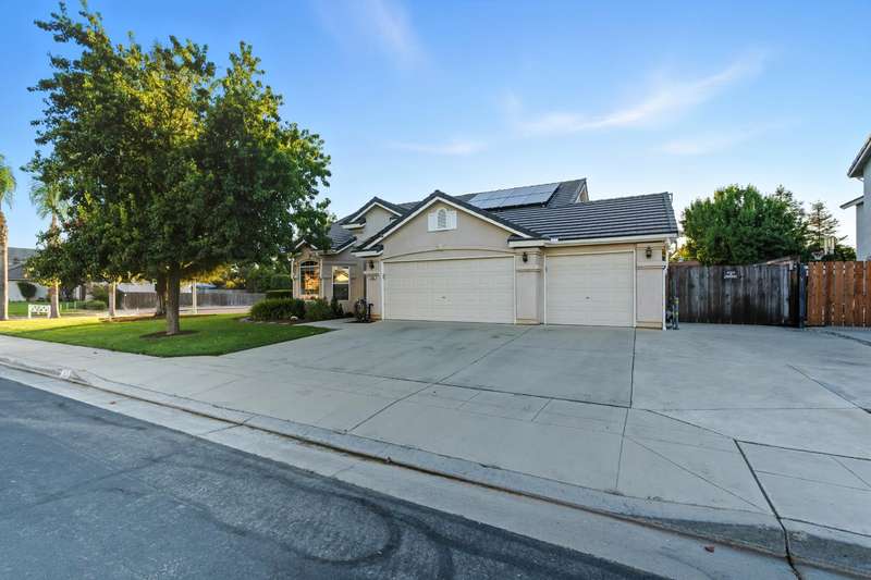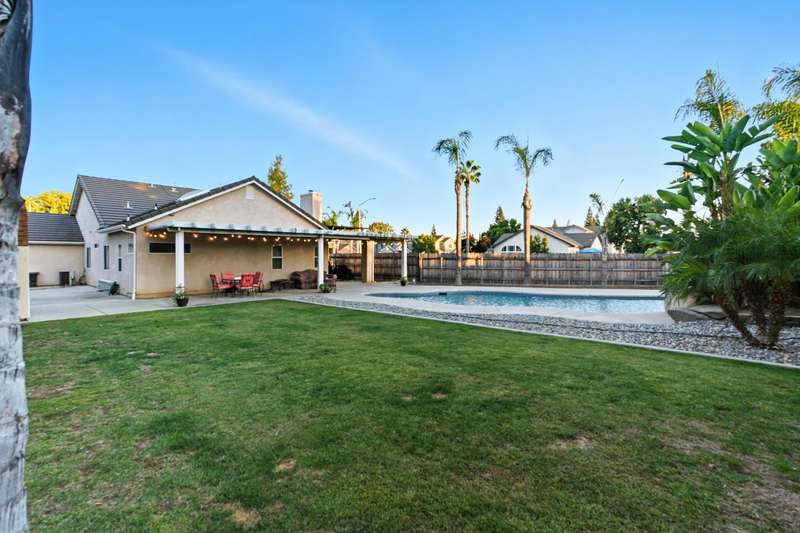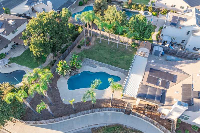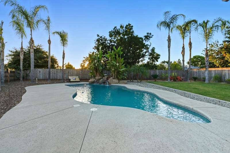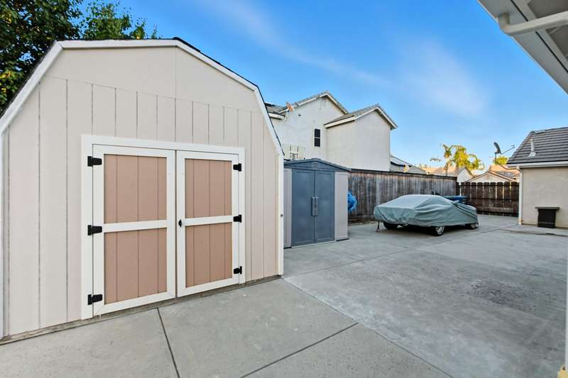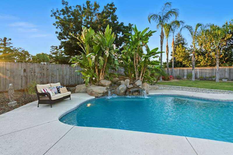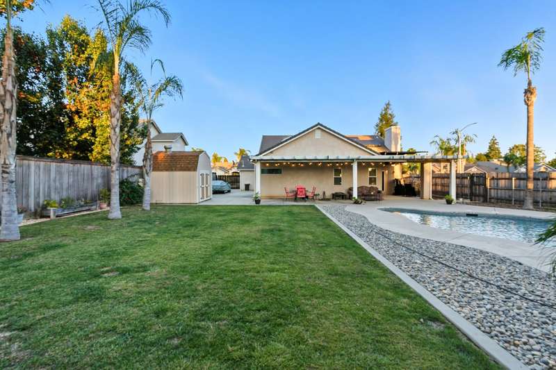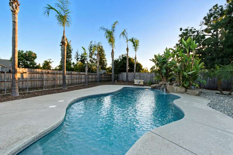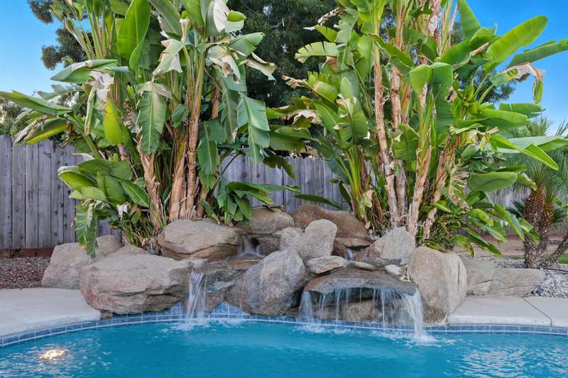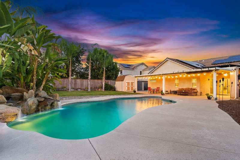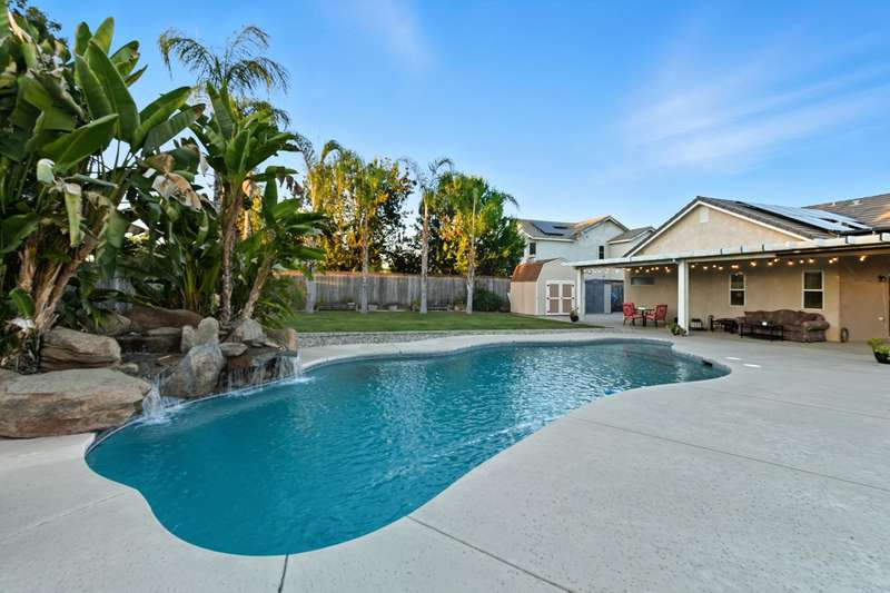 Beautiful home with the perfect backyard for you and your guests. An absolutely flawless property for entertaining, hosting, and storage. This lot is a must see! Huge corner area, with a big pool and waterfall, grassy space including many palm trees, two sheds, RV Parking and a covered patio. Everything you might desire in the ideal outdoor set up. So many features outside, let's not overlook the interior. Wood-look tile flooring, modern open kitchen, nice open floorplan with a great layout & flow. What an awesome place to call your own. Other amenities to note: the three car garage, extended driveway, a convenient backyard gate that leads to a secluded cul-du-sac right next to the property that also provides abundant street parking. Powerful and stylish ceiling fans, farmhouse sink in the kitchen, epoxy flooring in garage. Come see it for yourself! Call your Realtor and set up a private showing today.
