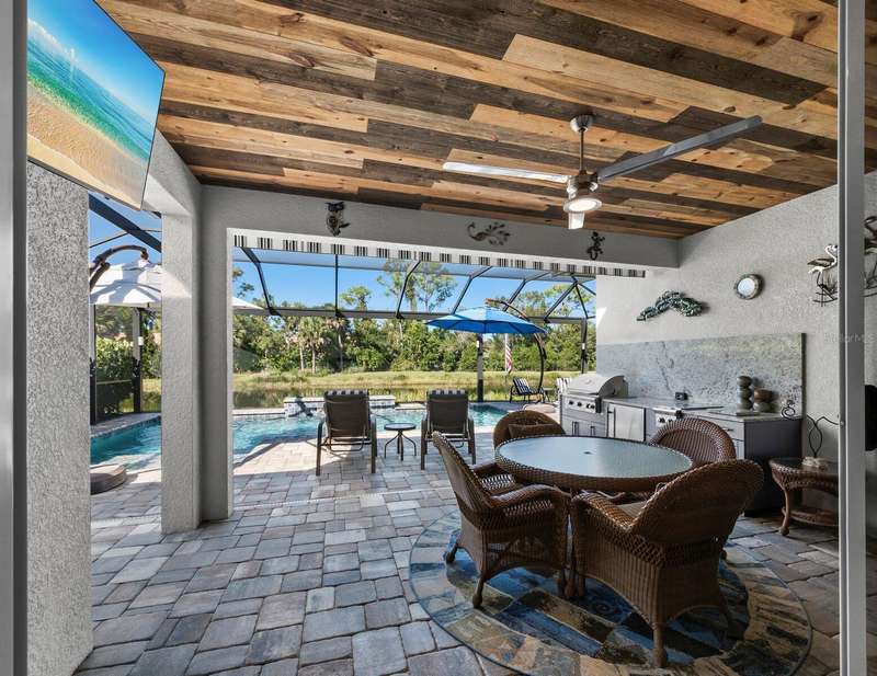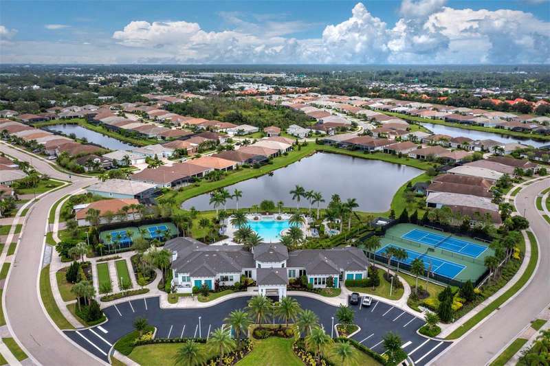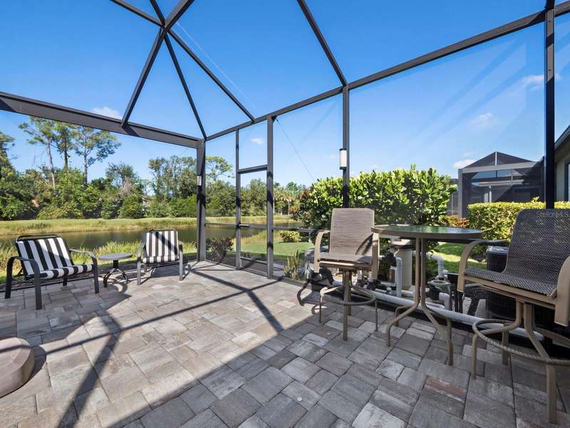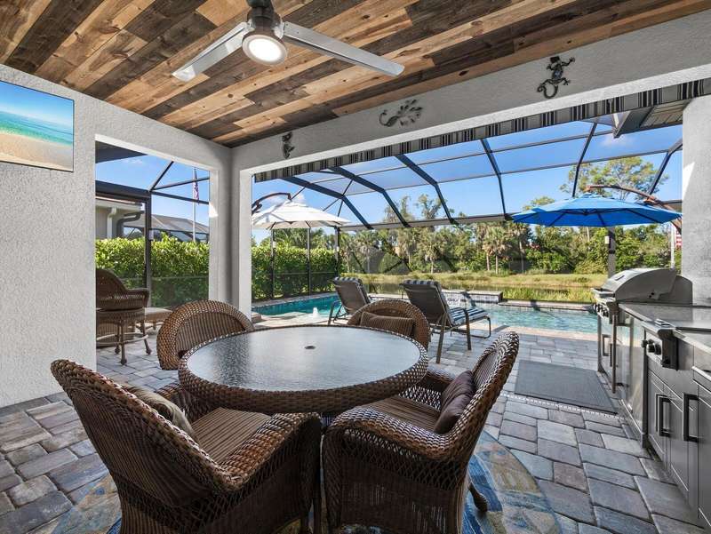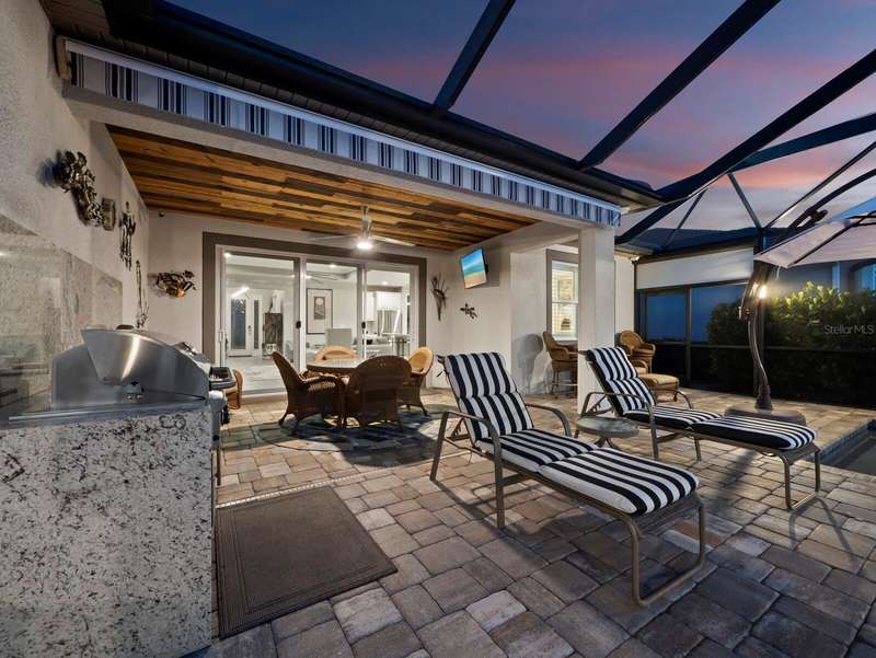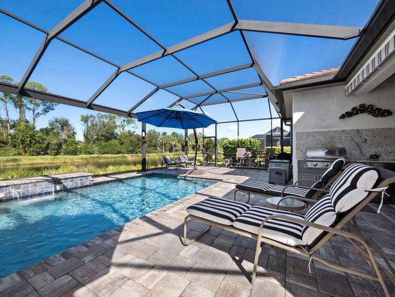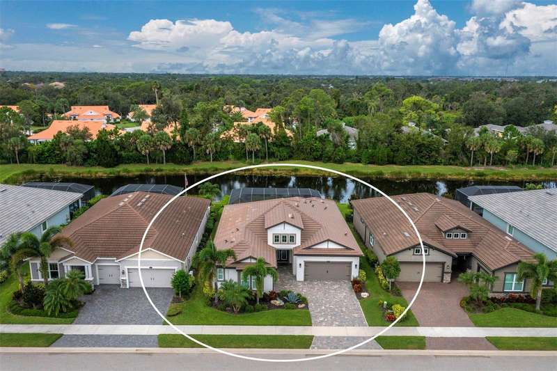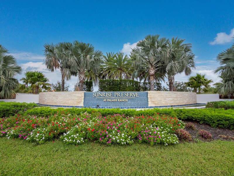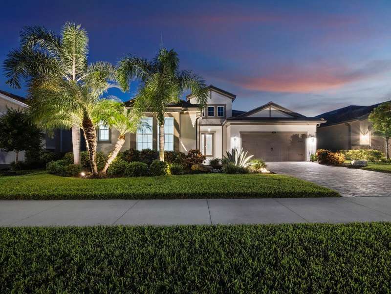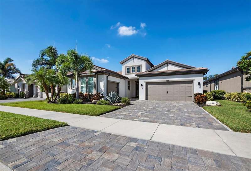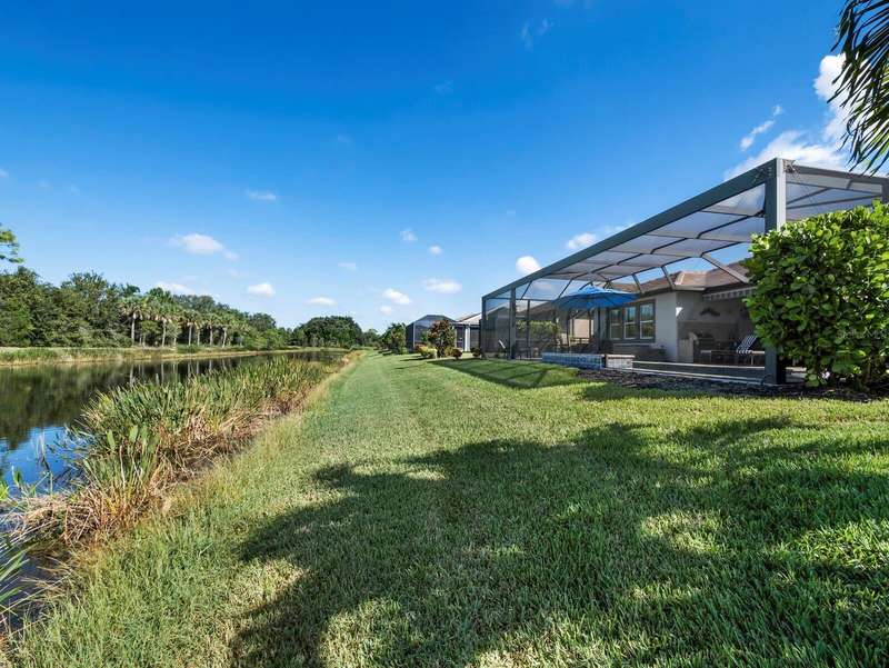 Under contract-accepting backup offers. Built in 2020, this West Indies-style home exudes sophistication with extensive upgrades and stunning natural light. Ideally situated on a lakefront home site, the property offers picturesque preserve and water views. Every high-end detail, meticulously completed in this gated Sunrise Preserve gem, offers immediate luxury upon arrival. The immaculate floor plan includes 2,261 sq. ft. of thoughtfully designed living space, featuring 3 bedrooms, 3 bathrooms, a pool, and 3-car split garage with epoxy floors and upgraded paver driveway. Lush, tropical landscaping accented by hard wired LED lights provide impressive curb appeal. The welcoming front entrance sets the stage leading into the home with commanding views. Upon entering through the striking glass front door, the tone is set for the entire space. The large interior open layout features 9-10 ft ceilings paired with tray ceilings and crown molding, adding to the sense of spacious elegance. Plank tile floors flow throughout the home, complemented by tasteful designer touches such as upgraded light fixtures, plantation shutters, custom storage closets, and ceiling fans. Adjacent to the great room, a gourmet kitchen includes sleek cabinets, upgraded stainless steel appliances, and a generous walk-in pantry with a frosted glass door. Premium quartz countertops extend to a spacious island featuring an upgraded kitchen sink for both style and practicality. The dining room seamlessly blends entertaining with amazing outdoor views. The screened-in lanai enhanced with additional lighting, creates an appealing transition from the great room through the hurricane impact sliding door. Step outside to the custom saltwater pool complete with colored lights, fountain bubbler, motorize sunshade, and a one-sided automatic privacy screen. A pool lounge area atop pavers and a summer outdoor kitchen completes this idyllic space for relaxing while enjoying tranquil lake views. The spacious primary suite features a well-appointed bathroom, with a large walk-in custom closet. Highlights of this luxurious en-suite bath include split dual vanities, premium granite countertops, and large walk-in shower with a bench. The split floor plan provides two additional bedrooms with custom closets and spa-like baths. The third bedroom can easily transform into an office with the custom desk, adding versatility to the home. The spacious laundry room designed for convenience, offering a barn door with frosted glass, lower cabinets with a utility sink, and two storage closets. Further upgrades include impact windows, hard-wired security package with two cameras, split AC systems, whole house natural gas generator, house surge protector, a 5.1 surround sound system, and a freshly painted interior (2023). The HOA fee includes complete landscape maintenance. Situated in the Gated Sunrise Preserve at Palmer Ranch, residents enjoy an affluence of amenities that exemplify resort-style living. These include a large clubhouse with a fitness center, yoga room, a spectacular heated pool and spa, bar lounge area, bocce ball, tennis courts, and more. This community is conveniently located near fabulous Gulf beaches, shopping, fine dining, medical facilities, and top-rated schools, providing a truly upscale living experience.