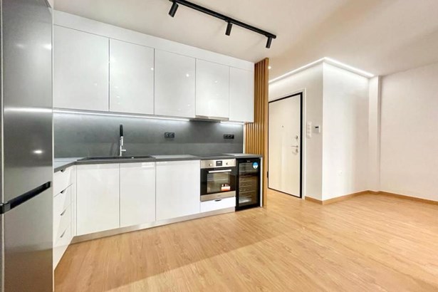Upon entering, you are greeted by a spacious and inviting living room that serves as the heart of the home. The open concept seamlessly integrates the living area with a fully equipped kitchen, complete with modern electric appliances. This setup is ideal for both everyday living and entertaining guests, as it promotes a sense of togetherness and effortless flow.