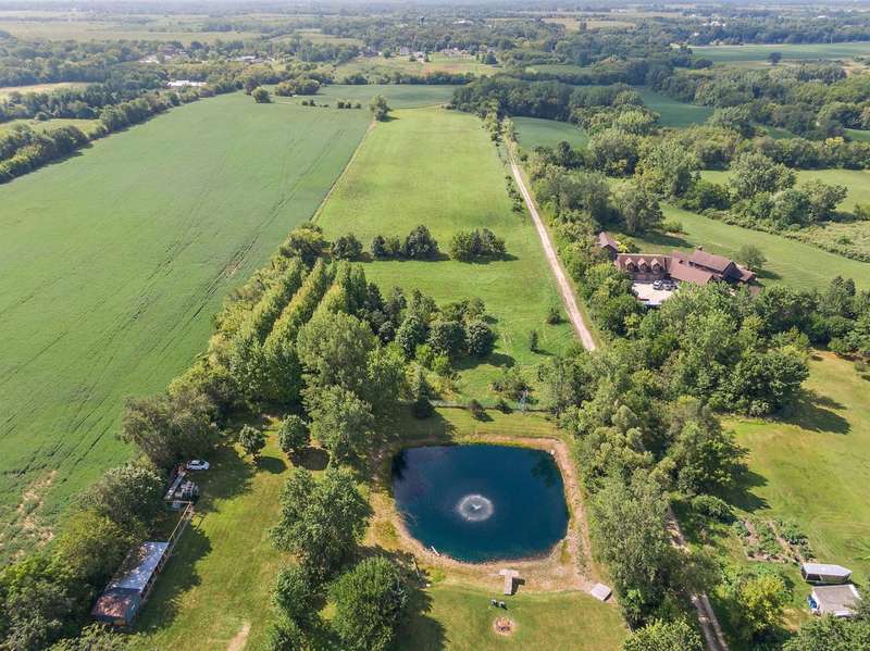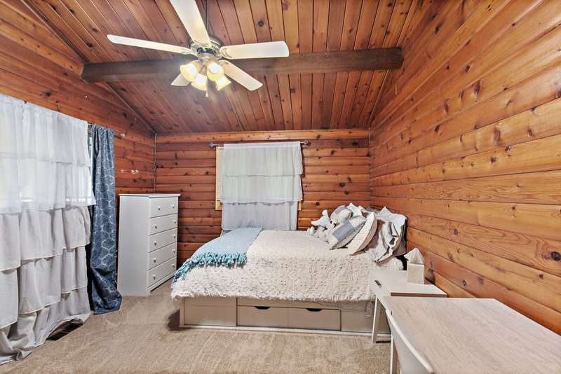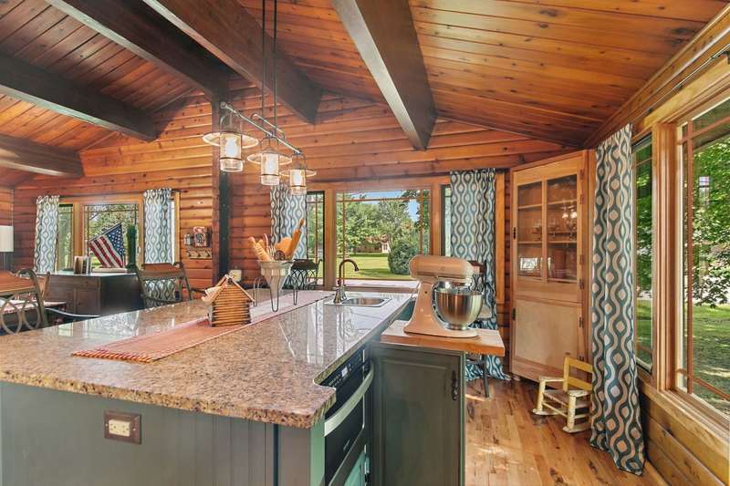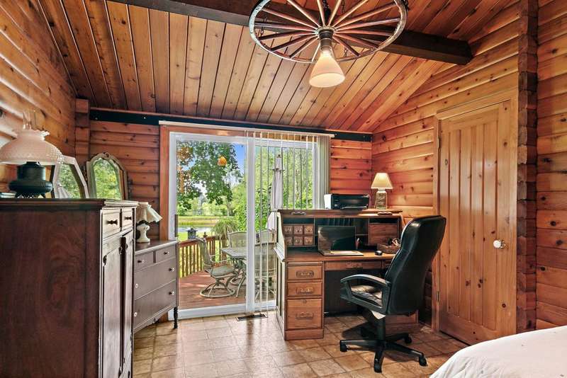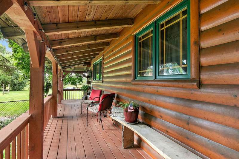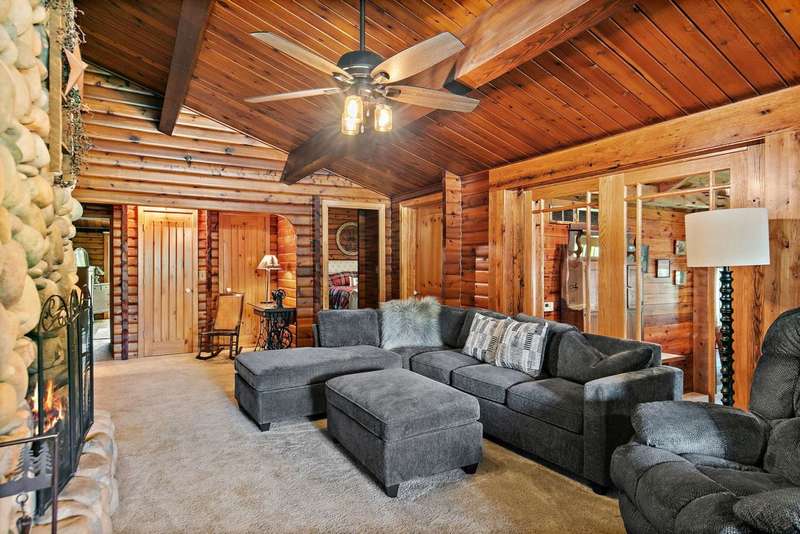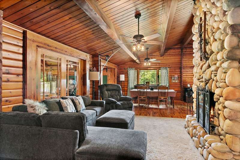 Rustic and authentic yet modern ranch home, this 3-bedroom, 2.1-bath log cabin offers the perfect blend of charm and comfort. The living and dining area features a stunning floor-to-ceiling stone fireplace, creating a warm and inviting atmosphere. The updated kitchen boasts a spacious island and custom cabinetry. Set on 4 acres with a stocked pond and mature trees, the property offers serene privacy. A partially fenced area adds functionality, while the 2-car detached garage includes an attached 2-stall barn with a tack room-perfect for equestrian enthusiasts or hobby farmers.