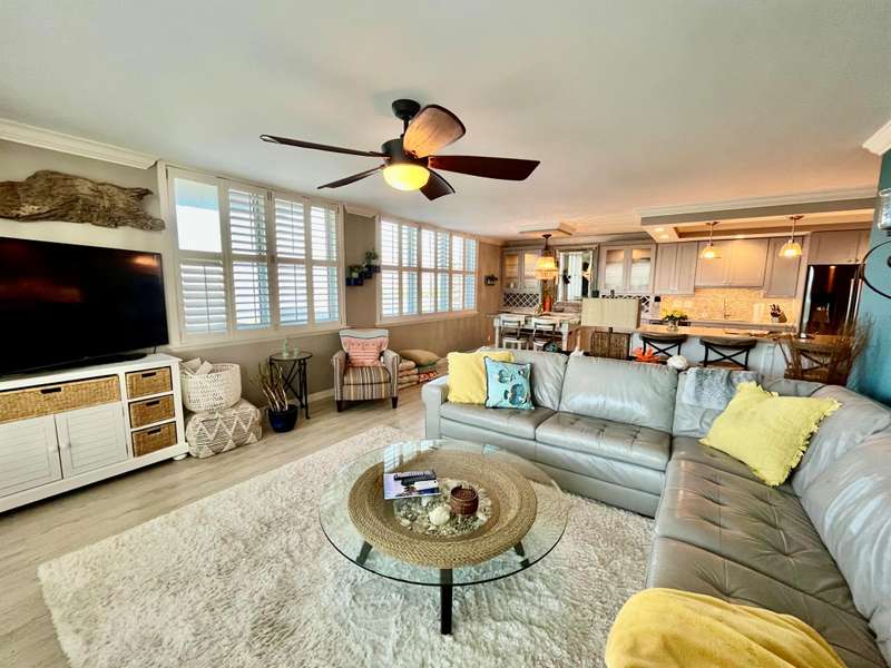 Pristine updated 2/2 Southwest Corner Unit available for annual rent. Unit is turnkey and has all the bells and whistles. Updated open kitchen concept overlooking the ICW and into the living/dining room. Impact glass sliding doors and windows throughout. Cozy but large bedrooms with King size bed in the master and Queen size pullout in the guest room. Crib if needed. TV's in all bedrooms. Builtin closets for easy storage of personal items. Renovated bathrooms featuring rain showers and jacuzzi tub. Stackable washer/dryer in unit. Covered parking space right by the front door. The bldg features a circular pool overlooking the oceans edge. Beautiful private beachfront access on Singer Islands private beaches. Bldg features a large fitness room, billiards, community room and kitchen...