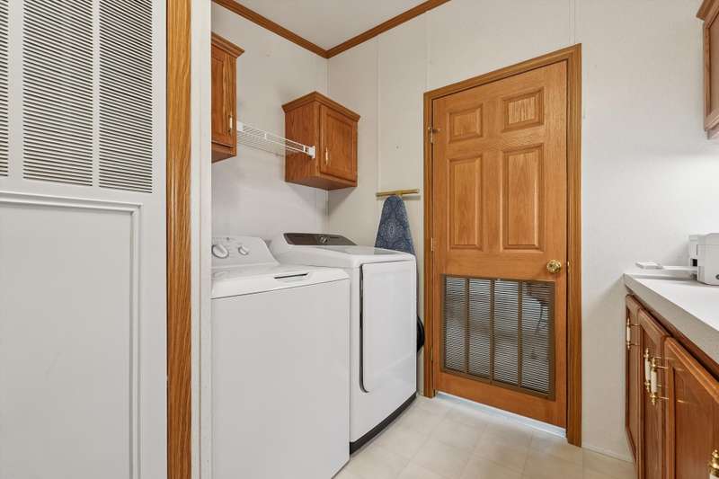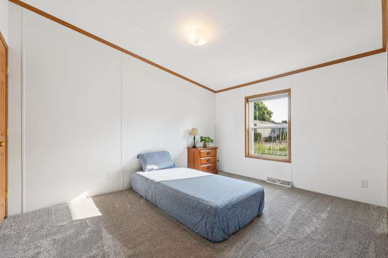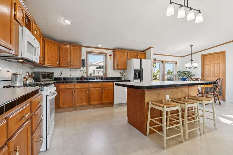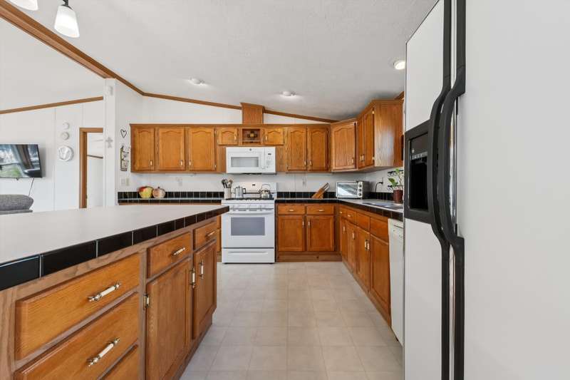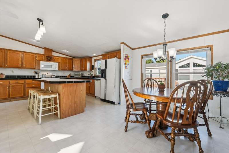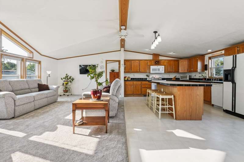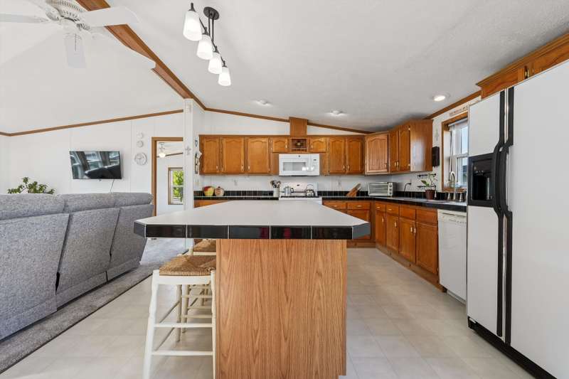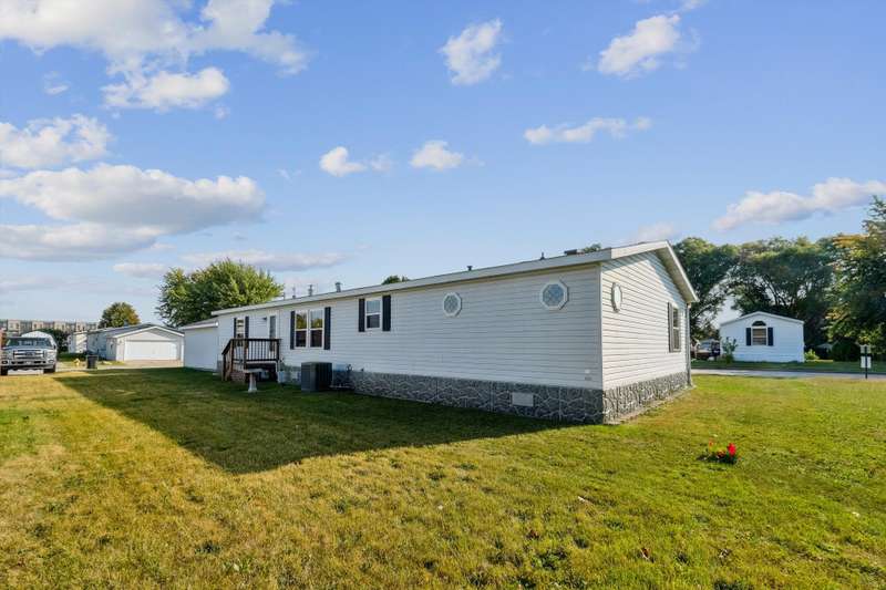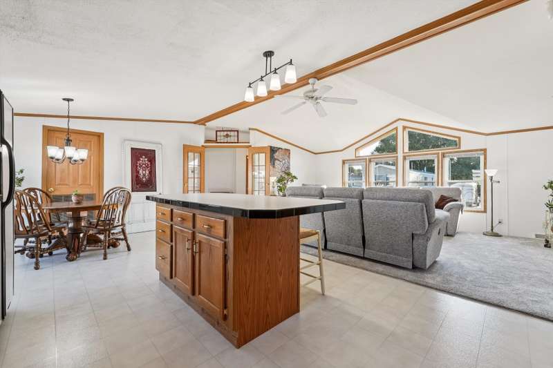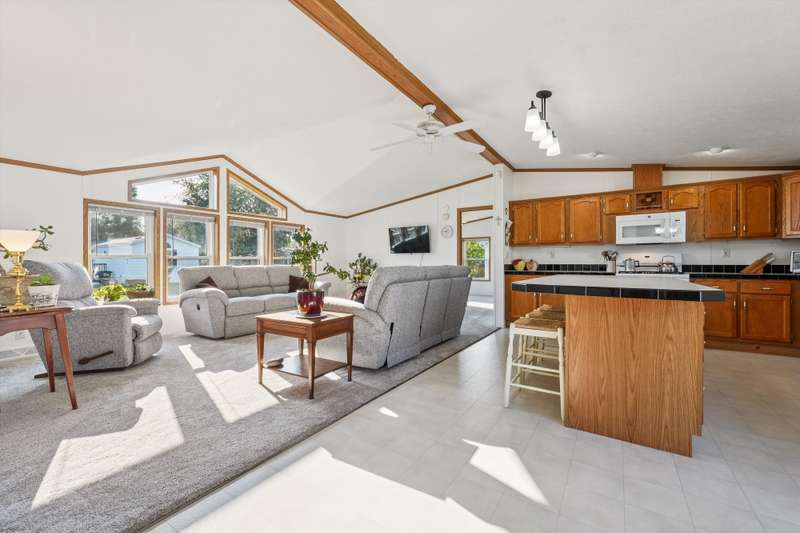 Wonderfully maintained home with an oversized garage. Enjoy the deck with ramp access & a charming gazebo with curtains. The spacious entryway welcomes you & around the corner is the bright & cheery living area with vaulted ceilings & open layout. The spacious kitchen features a large center island, eat-in dining area with a lot of cabinet space. Almost everything about this house has been replaced or upgraded & is move-in ready. The monthly lot rent is $772/ month.