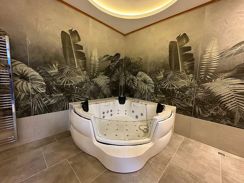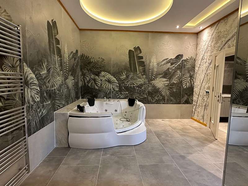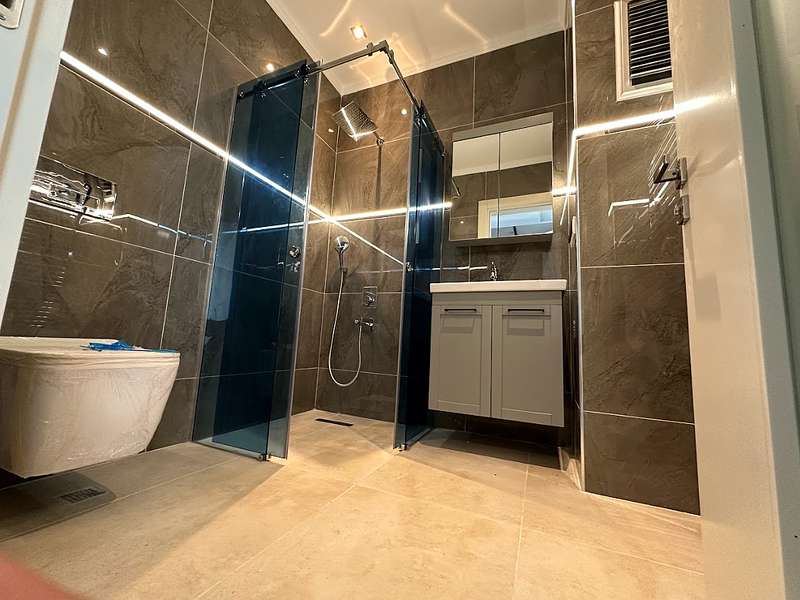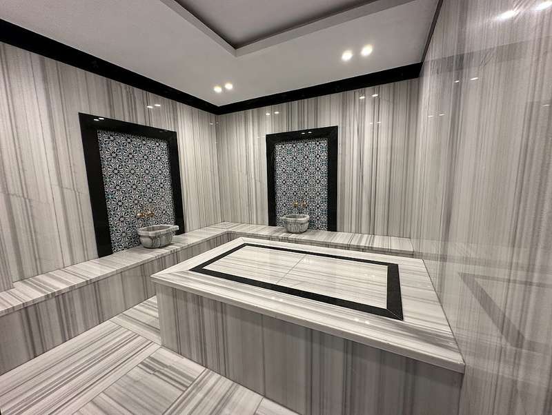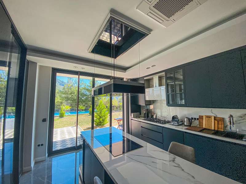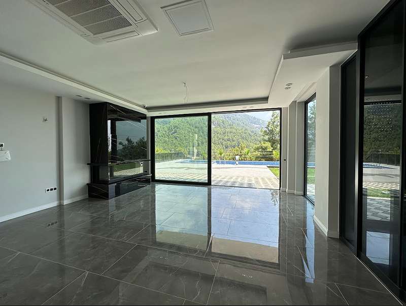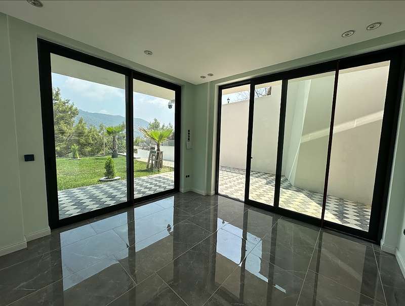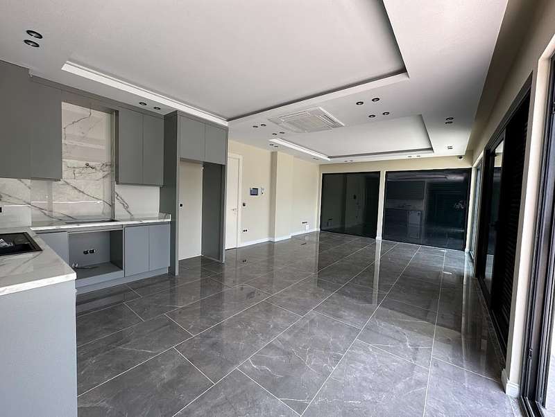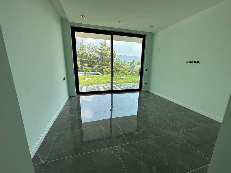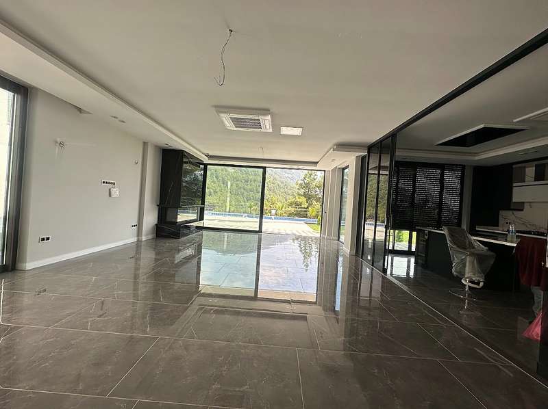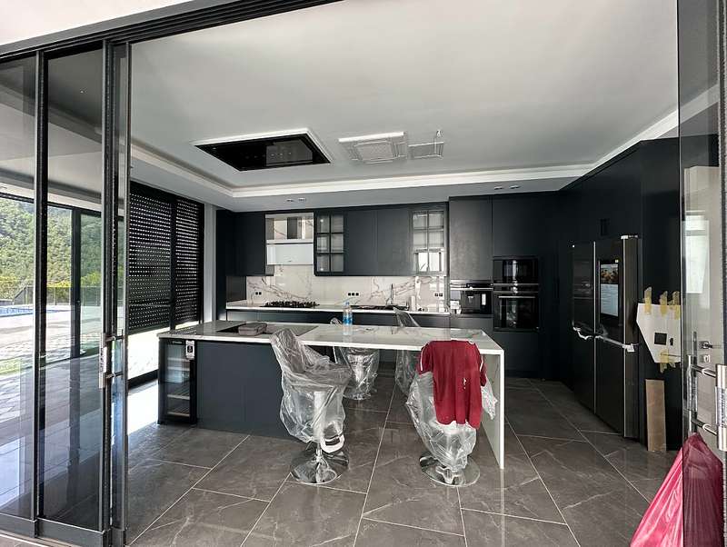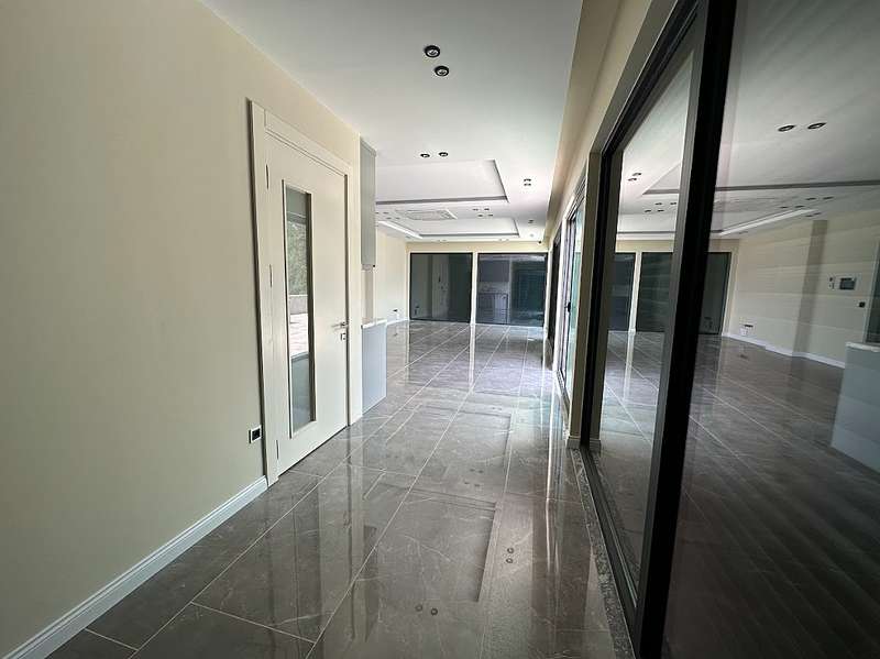 The detached villa is designed as 2 living rooms, 2 kitchens, 5 bedrooms, and 9 bathrooms and will be delivered with flooring, lighting, bathroom and kitchen cabinets, bathroom and kitchen countertops, electricity, water, heat, and internet installations, interior and exterior doors, windows, stairs, and balcony railings.