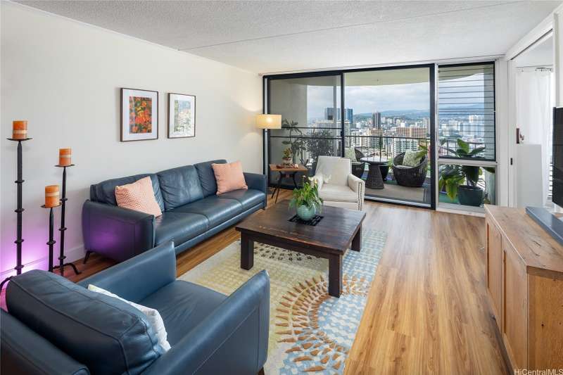 Elevated island living awaits from this high-floor residence at 1717 Ala Wai! Beautifully maintained and move-in ready, this spacious 2-bed/2-bath home features upgraded jalousie windows throughout and new bedroom carpeting. The kitchen shines with expansive granite counters, hardwood cabinetry offering exceptional storage, and a brand-new stainless refrigerator and dishwasher. Step inside and immediately feel at home-bright, breezy, and inviting. Relax on your lanai and enjoy sweeping views from the ocean and the Ala Wai Canal to the sparkling city skyline and Koolau Mountains, with spectacular sunset to end your day. 1717 Ala Wai is known for its warm, neighborly atmosphere and unbeatable location near Waikiki's beaches, shops, dining, and Ala Moana Shopping Center. A proactive, well-managed building with major plumbing, elevator, spalling, and painting projects already completed-special assessment runs through 2028. Discover comfort, convenience, and classic Honolulu charm in one of Waikiki's most desirable communities.