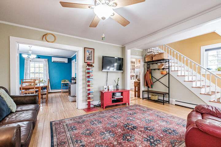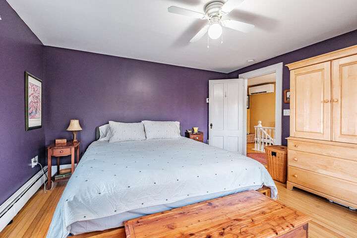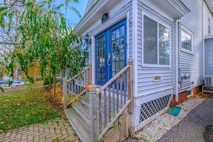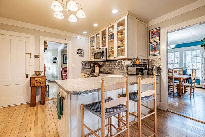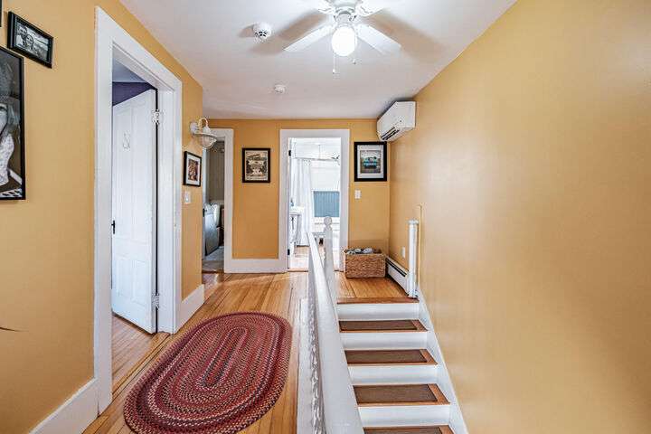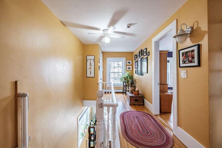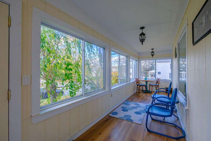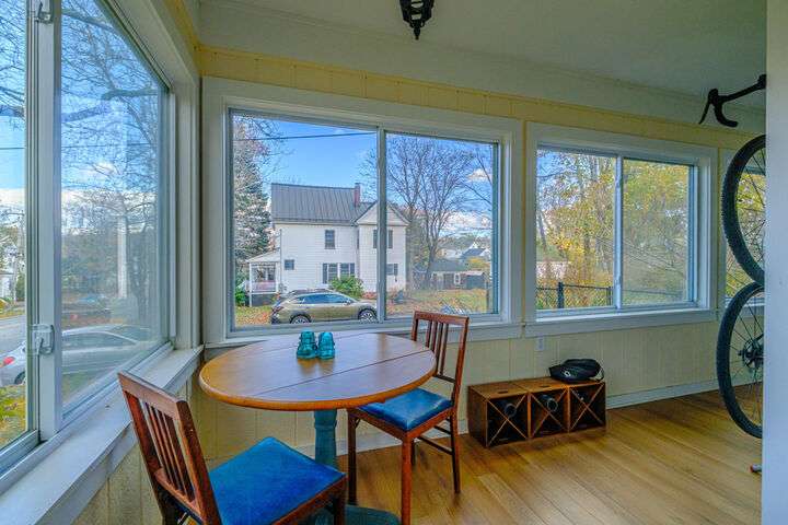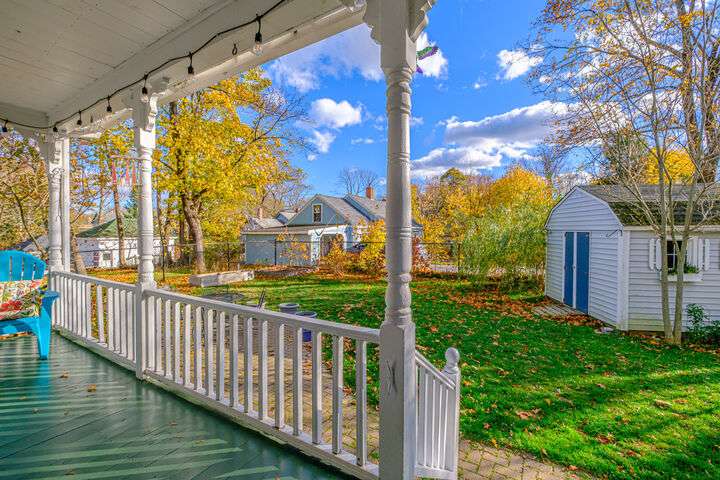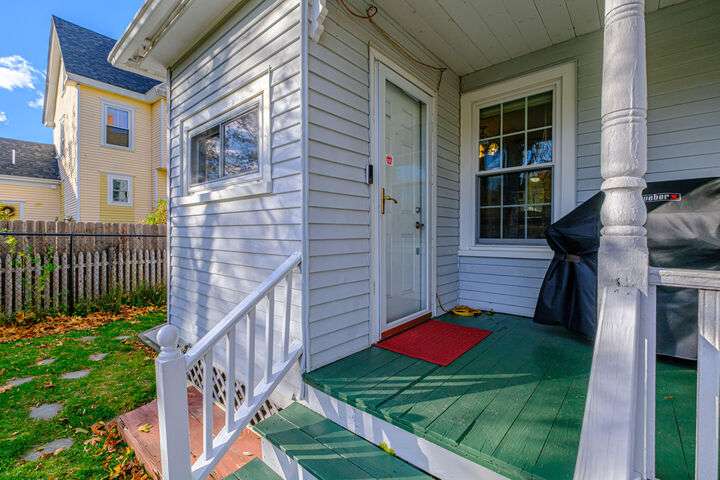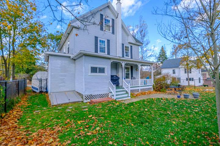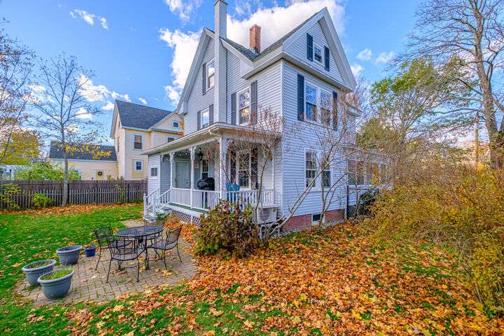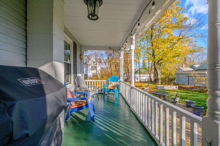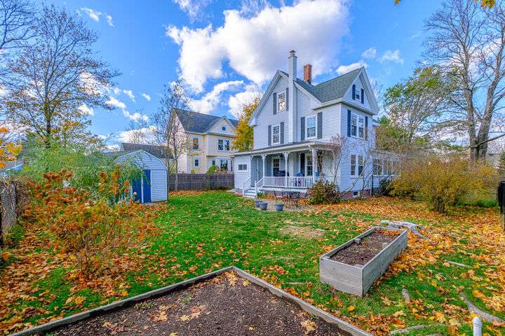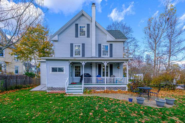 Updated historic New Englander features a front glassed-in L-shaped porch, formal living and dining room with wood floors, and a lovely updated kitchen with pantry and convenient half bath. A rear entry with open porch overlooks the fenced backyard with shed, providing space for gardening and outdoor enjoyment. The second floor features 2 bedrooms, full bath and balcony with closet. The bonus third-floor level offers a 3rd bedroom with attached bathroom and office area, options for a primary suite, guest space, or home office. Recent additions include new heat pumps, hot water heater and roof. Located in a fantastic Bath neighborhood, this home offers easy walkability to downtown, shops, restaurants, perfectly combining historic character with modern convenience.