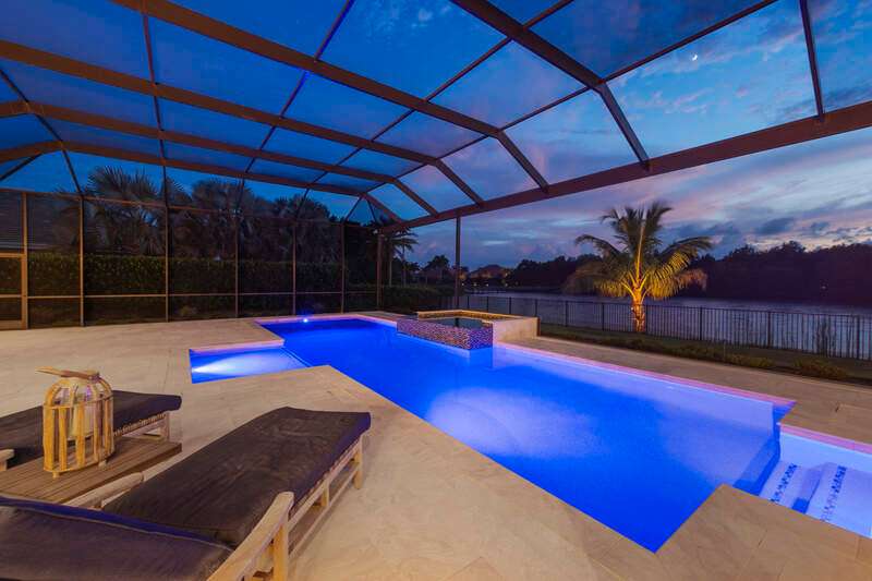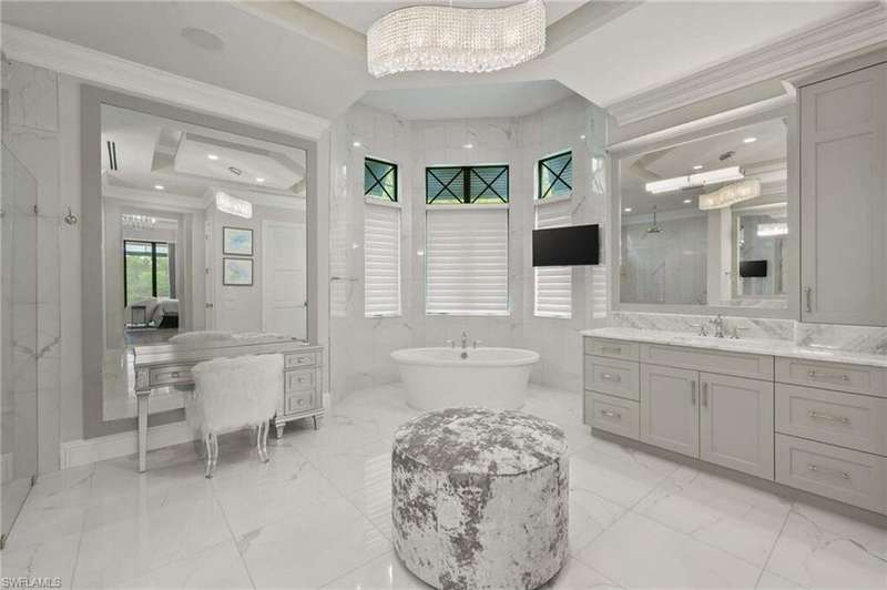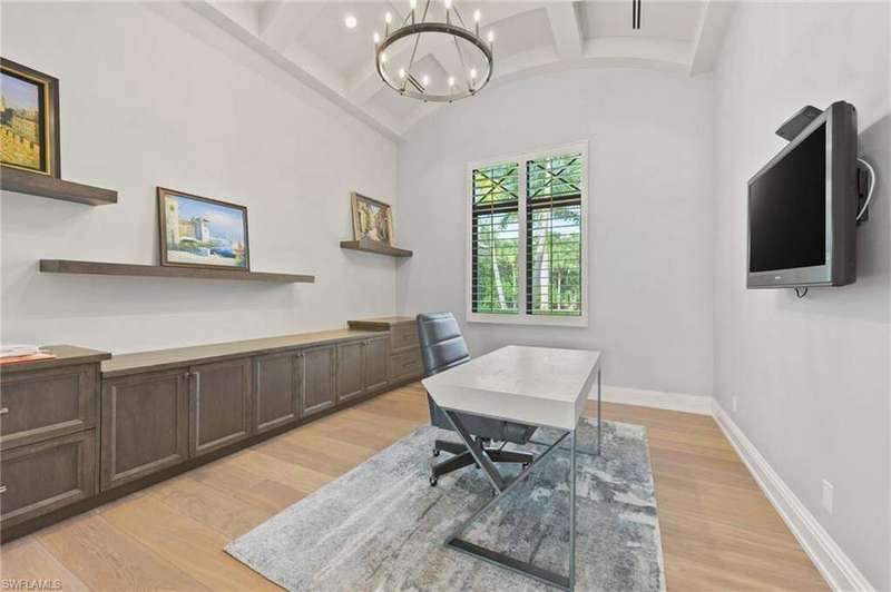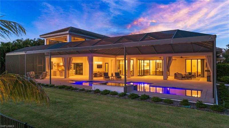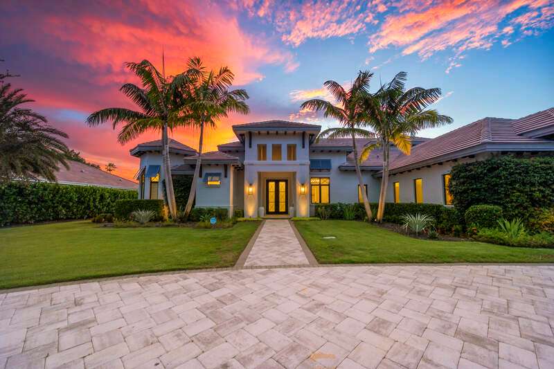 IMMEDIATE GOLF MEMBERSHIP AVAILABLE with this stunning custom home built by Florida Lifestyle. Elevated 16'1 feet above sea level and equipped with impact-resistant glass and a full-house generator, this home was meticulously designed for peace of mind and modern comfort. Every detail has been thoughtfully curated-from wide-plank Legno Bastone flooring to a 1,000-gallon propane tank, water filtration system, elevator, full security setup, and Sonos sound throughout. Beautifully furnished by Clive Daniel and Norris, this home is move-in ready for effortless Florida living. The chef's kitchen is an entertainer's dream, featuring dual porcelain islands, Thermador appliances, a wine refrigerator, and a spacious auto-lit walk-in pantry. A nearby bar area includes an additional wine fridge and seamlessly connects to the dining space for relaxed hosting.The luxurious primary suite offers a tranquil retreat with a custom ceiling accent, blackout shades, dual walk-in closets, and a spa-like bath with new shower heads and dual water closets. Two additional en-suite guest rooms are located on the main level in a split-bedroom layout, providing ultimate privacy.Take the elevator upstairs to a spacious fourth bedroom with double vanities and ample closet storage. This upper-level guest suite also features a lounge area, TV space, kitchenette, bar, and Sub-Zero wine cooler. The upstairs private screened lanai offers gorgeous golf views. On the main level, enjoy a generously sized laundry room with pull-out bins, extra cabinetry, a storage closet, and an additional refrigerator. The oversized four-car garage includes built-in storage, a refurbished four-seat "Hole In One" golf cart, and yet another refrigerator. For even more storage, a built-in mudroom with cubbies keeps everything organized. Entertain in style on the expansive lanai, featuring a beautiful wood ceiling, gas fireplace, covered lounging and dining areas, an air-conditioned pool bath, and a two-story panoramic cage. The fully equipped outdoor kitchen includes three TVs and custom drapes, creating an intimate yet chic setting for outdoor living. With western exposure and breathtaking water and golf course views, you'll enjoy glorious sunsets from the gas-heated saltwater pool and spa.This home truly has it all-style, functionality, and luxury-ready for you to enjoy the ultimate Florida lifestyle.