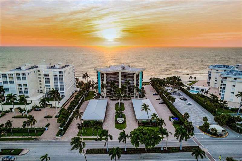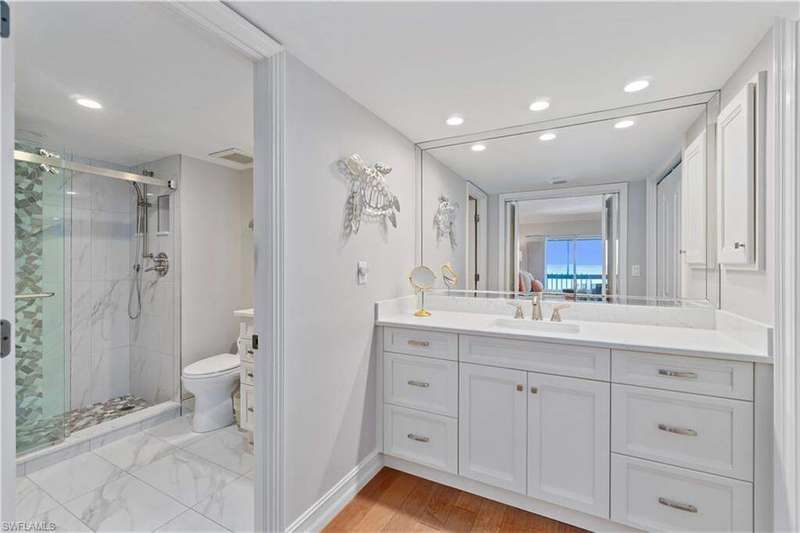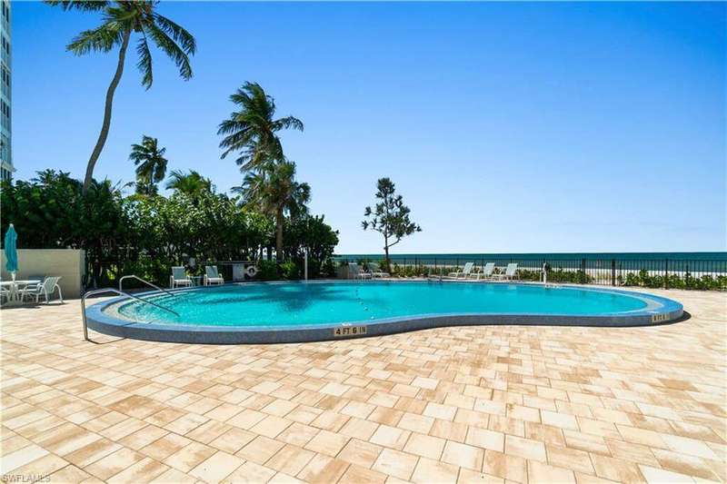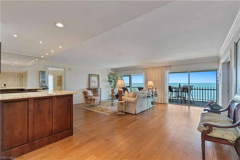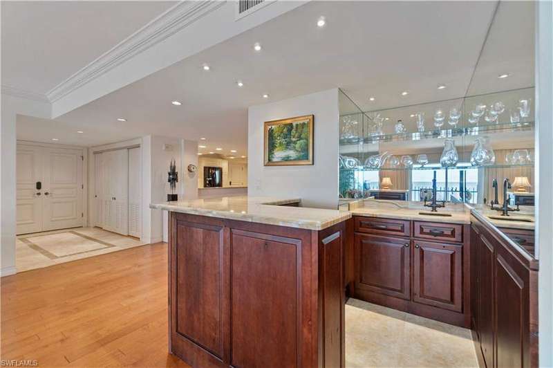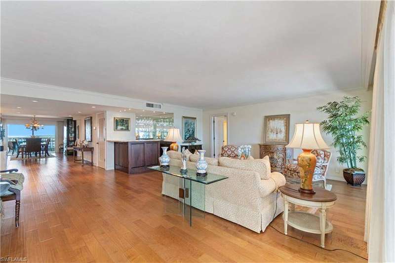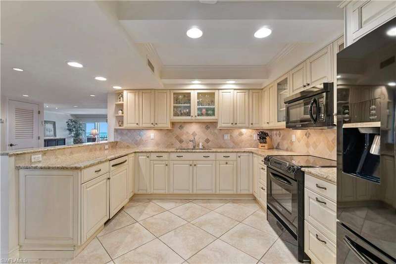 Enjoy sweeping SW Gulf and East Bay views from this rare three-bedroom plus den penthouse in the highly sought-after Moorings community of Imperial Club. Perfectly perched on Moorings Beach, this residence delivers the best of coastal living-sunset skies over the Gulf to the west, sparkling Moorings Bay and city lights to the east. A generous 38-foot west-facing lanai invites you to take in the sand, sea and sunset, while a second 38-foot east facing lanai showcases bayfront and city views. Inside, the thoughtful floor plan offers two equal-sized primary suites with large walk-in closets, plus a third guest bedroom, third full bath and a den that can easily serve as a fourth bedroom, TV room or home office. The kitchen features granite countertops and a separate dedicated bar area, ideal for entertaining. There is also a dedicated dining room, separate wet bar and a large laundry/utility room. Hardwood floors, electric roll-down hurricane shutters, and abundant storage throughout add both comfort and peace of mind. Additional highlights include TWO covered parking spaces and newly renovated amenities: a beachfront pool, stylish social room with catering kitchen, fitness center, and guest suite. No land lease, an unbeatable Moorings location, and move-in ready-this penthouse truly offers it all. Easy to show.