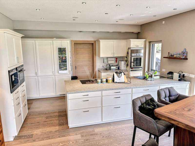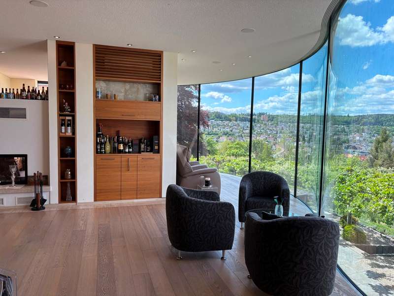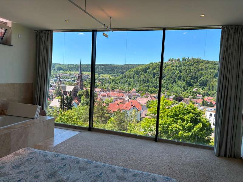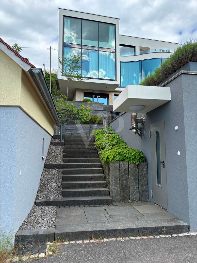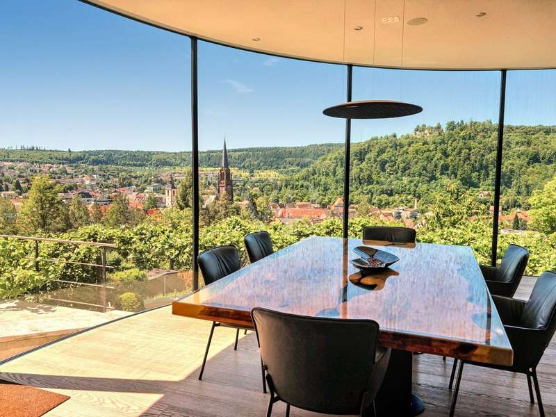 Welcome to your new home, an impressive property in Nagold that offers a combination of modern design and upscale amenities in a fantastic location. This well-kept property, built in 2011, offers a generous living space of approx. 464 m² on a spacious plot of approx. 1,390 m² in the middle of Nagold. With a total of 12 rooms, including 5 bedrooms and 4 bathrooms, this detached house offers enough space for sophisticated living requirements. An outstanding feature of this property is the exclusive architecture, which impresses with floor-to-ceiling and curved glazing in the living area, among other things. This design not only allows an excellent incidence of light, but also an impressive view over Nagold. The outdoor facilities are designed to a high standard and include three garages and an extraordinary carport with space for two vehicles. There is also an integrated waste room and a bicycle room with a water connection. The outdoor area is enhanced by impressive water features and sophisticated garden lighting. A covered terrace with an outdoor kitchen is available for moments of outdoor enjoyment. A glass roof with shading option and an additional awning offer flexibility depending on the weather. An outdoor seating area with a canopy and a playing field with a basketball hoop complete the outdoor area. The garden has a separate wine cellar and a garden workroom with a water connection. A modern irrigation system is supported by a cistern with domestic waterworks, which ensures sustainable water management. The property's heating system includes a geothermal heat pump, supplemented by central heating. A photovoltaic system with a capacity of 9.2 kWp and 44 modules contributes to the energy efficiency of the house. Inside, the high-quality fitted kitchen from SieMatic, equipped with large electrical appliances from Siemens, is impressive. An extensive air conditioning system and high-quality built-in furniture create a comfortable living ambience. The exclusive floor design in wood and travertine runs through the entire house. The master suite has a dressing room and a spacious en-suite bathroom. There are also three further rooms on the upper floor as well as a roof terrace with glass railings. Further amenities include a three-sided glazed fireplace that separates the living and dining areas. Sliding glass doors and an open, curved staircase with skylight further emphasize the high-quality interior design. This house offers maximum living comfort and meets the highest standards of design and functionality. A viewing is highly recommended to experience the many amenities on offer in person.