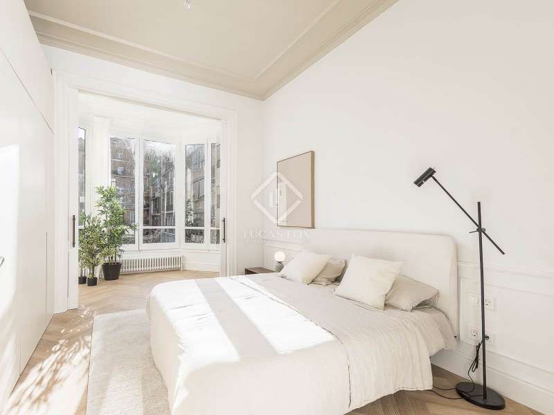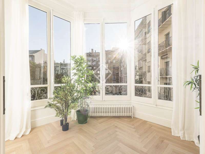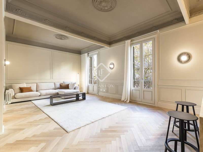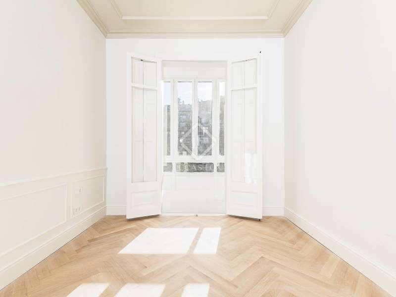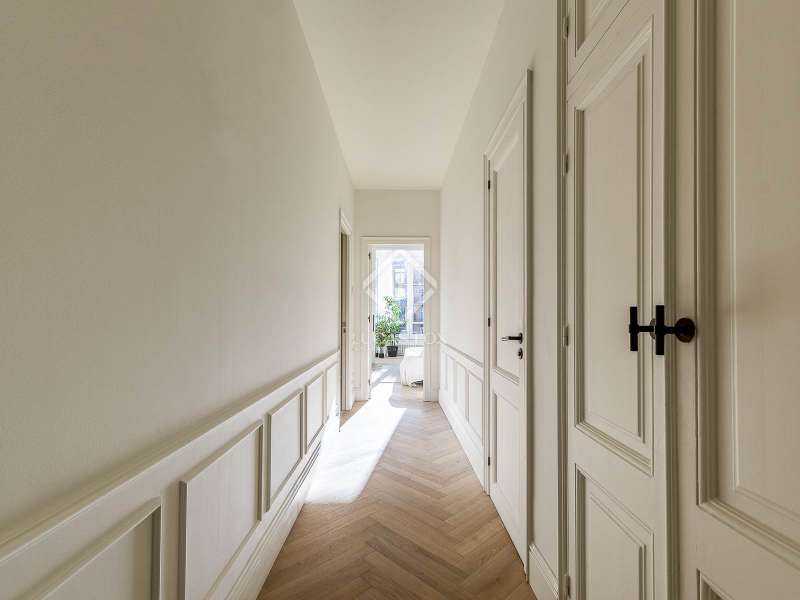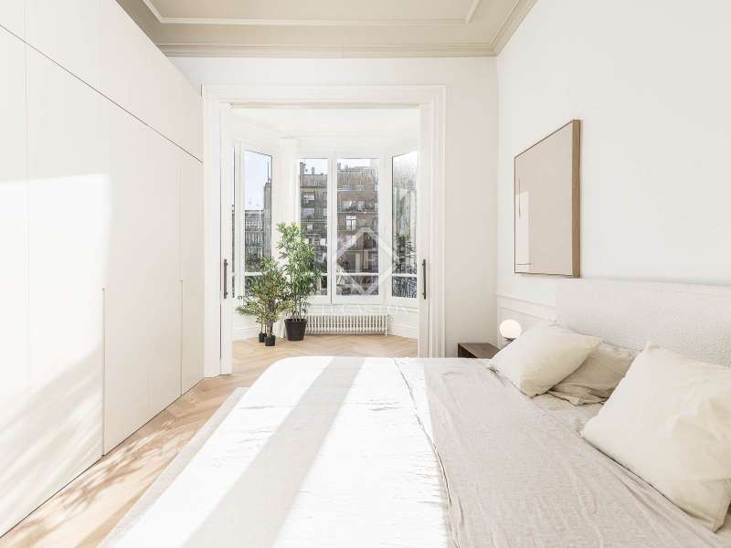 This impressive property is located in a very well-preserved period building on the prestigious Mallorca street, between Rambla Cataluña and Balmes. Its 175 m2 offer an elegant and contemporary design, combining the best of traditional architecture with modern comforts. Upon entering, a large entrance hall distributes the space into the two main areas of the house. To the left, we find a day area that houses a bright living room and a spacious dining room, both connected by an elegant arched wall that gives character to the environment. Thanks to its three balconies facing Mallorca Street, the property enjoys abundant natural light. The open kitchen is equipped with high-end appliances , in conjunction with the other rooms in the day area, which creates a harmonious atmosphere. It is completed with high-capacity tall cabinets and a large island with a cooking area and space for stools, ideal for day-to-day use and for entertaining guests. The entire day space occupies an area of more than 65 m2 . The night area consists of three suites, each with private bathrooms. The large bedrooms are designed to create an elegant and relaxed atmosphere, with restored original ceilings that add character and a touch of colour that gives personality to each of the spaces. The bathrooms feature a contemporary and minimalist layout , with a focus on functionality without sacrificing elegance. The selection of high-quality materials, such as natural oak herringbone parquet, provides a warm and sophisticated atmosphere throughout the property. As for the qualities, the property has a ducted air conditioning system and a radiator heating system that guarantees a pleasant temperature throughout the year. In addition, it has a facilities and laundry room area and a guest toilet for greater comfort. The building, in a classic style, is in a perfect condition, with a concierge service and two elevators for easy access to the property . Its privileged location in l'Eixample offers easy access to the city's main arteries, luxury shops, restaurants, and all the amenities that this emblematic area of Barcelona includes. Without a doubt, this is a unique opportunity to acquire a luxury property in one of the best locations in the city.