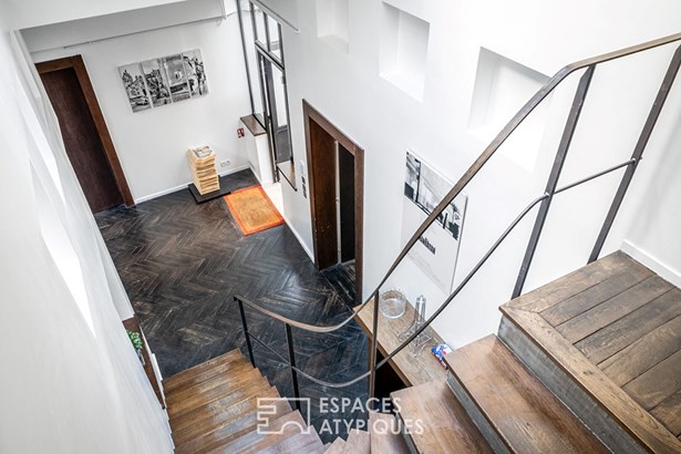 The entrance via the private courtyard reveals a pleasant luminosity, enhanced by large workshop-style glass windows.