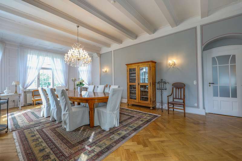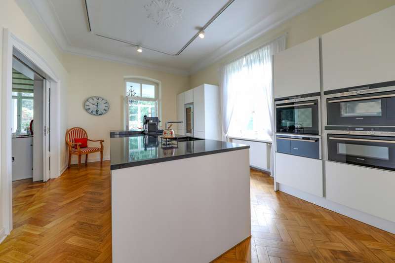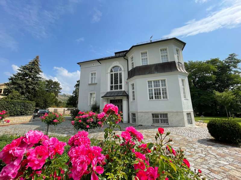 For sale is a well-known listed villa, built around 1870 by the Ziller brothers, with well-kept grounds and views of the vineyards. The property has been renovated to a high standard and in an exemplary manner. From 2012, the roof, façade, windows and their frames were renovated true to the original. Inside, the owners have adhered to the design typical of the period and have been able to preserve the stately charm of the high, bright rooms as far as possible. The floor plan is individual and also offers the option of use as a residential and commercial building thanks to the commercial space in the basement and on the first floor. On the ground floor there are 4 large, bright rooms, including the "library" with fireplace, a huge living room and the modern kitchen with access to the large conservatory. Particularly impressive on this floor is the dining room, bright and flooded with light. The spacious floor plan offers the possibility of running a law firm, practice or office on the ground floor and accessing the private rooms via the staircase. The upper floor is reached via a sophisticated staircase with original Art Nouveau glazing in the large windows. The spacious floor plan offers the possibility of running a law firm, practice or office on the ground floor and accessing the private rooms via the staircase. The upper floor, with 3 large living rooms and a beautiful bathroom, has also been renovated to a high standard and with great attention to detail. A large bathroom, a guest bathroom, a sauna preparation room and a balcony can also be found on this floor. The top floor offers an additional 140 m² of expansion space. The rooms are generously proportioned and flooded with light. The furnishings are of a high standard and the bathrooms have been exclusively renovated. Other special features include the fireplace on the first floor, the high-quality fitted kitchen, an alarm system and the sophisticated color scheme. A staircase leads to the top floor, a large room was formerly used as a master bedroom and offers plenty of space, followed by 2 further rooms. In this dreamlike villa, with a magnificent view of the vineyards, you can enjoy the peace and quiet you deserve while still being very close to urban life. We would therefore be delighted to show you your new home at a viewing appointment.