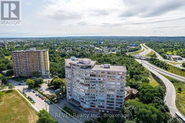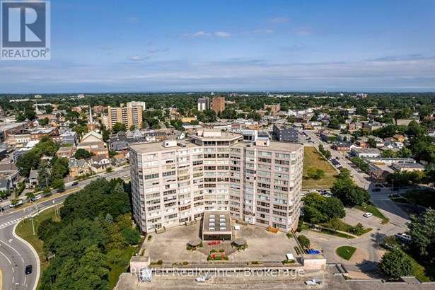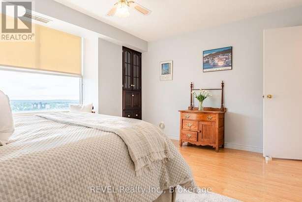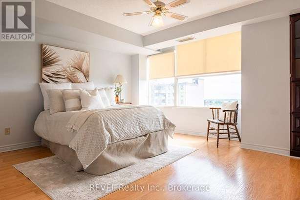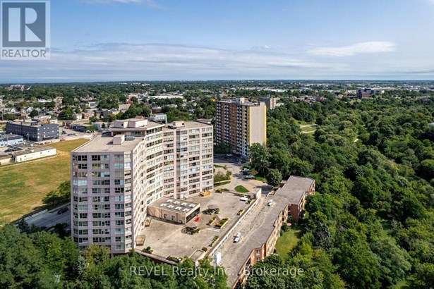 Perched high above with breathtaking views of the St. Catharines Golf and Country Club, this stunning 1,349 sq. ft. corner penthouse suite offers convenience and sophistication. Featuring 2 spacious bedrooms, 2 full bathrooms, and a large kitchen with ample storage, the home is bathed in natural light from the east and south-facing windows. The open layout creates a warm and inviting atmosphere, a second living space is ideal for an office or additional sitting area. The primary suite offers two double closets and a private ensuite bathroom. With in-suite laundry, foyer with storage, extra storage room, and two underground parking spots, convenience is at your fingertips. The building offers resort-style amenities, including a year-round indoor pool and sauna, Exercise Room, Party Room, BBQ area, outdoor patio, and a workshop. Located in a prime area with a walk score of 94/100, you're steps away from shops, restaurants, the Performing Arts Centre, and the Meridian Centre. TWO underground parking spaces #52 and 20A. VACANT and easy to show.