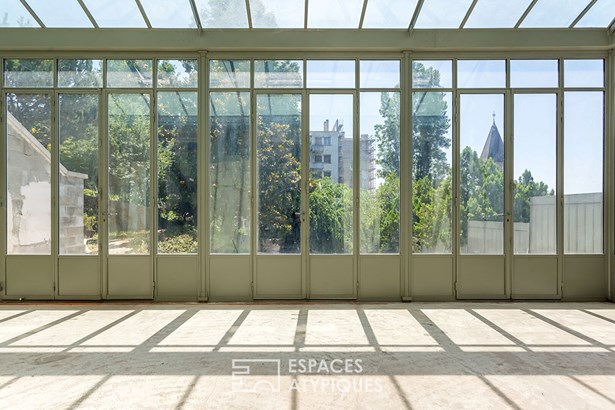 The interior design can thus be freely carried out. Opening onto a vast and high steel veranda across the entire facade, the spaces on the ground floor, spacious and bright, are divided into a large living room and a long adjacent kitchen. Adjoining the living room, a room under a glass roof can be converted into a bedroom-office with a shower room. Upstairs, the distribution can accommodate two or three bedrooms, a bathroom, a dressing room, and an additional shower room. The mezzanine offers the possibility of creating an office, a TV lounge, or a spare bedroom. A former dovecote, full of character, completes the ensemble and could become a separate room, ideal for an office or a guest bedroom.
