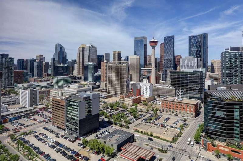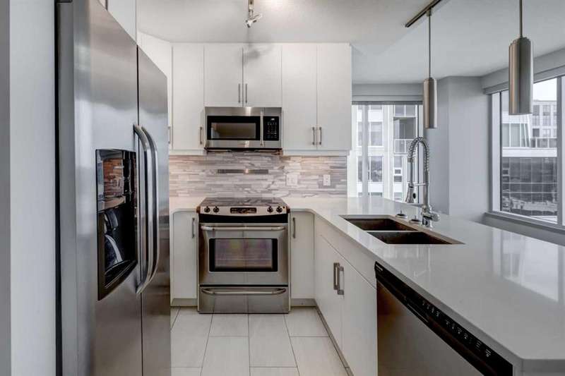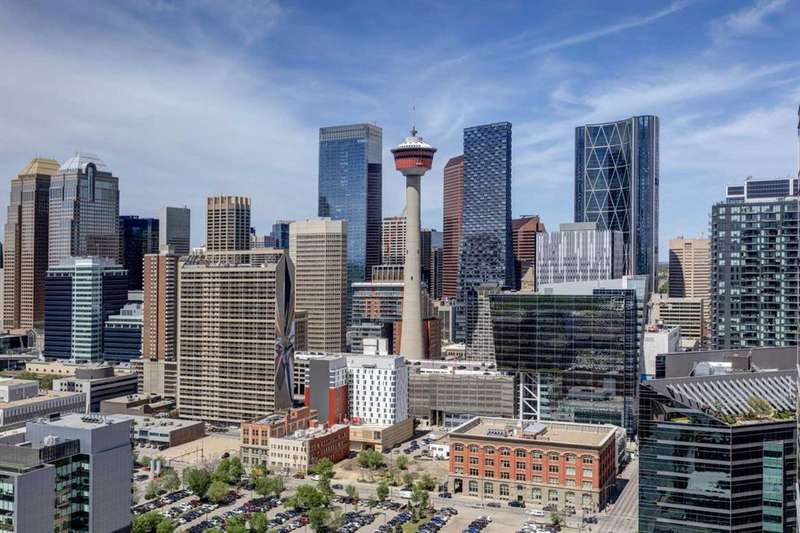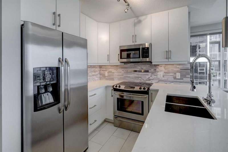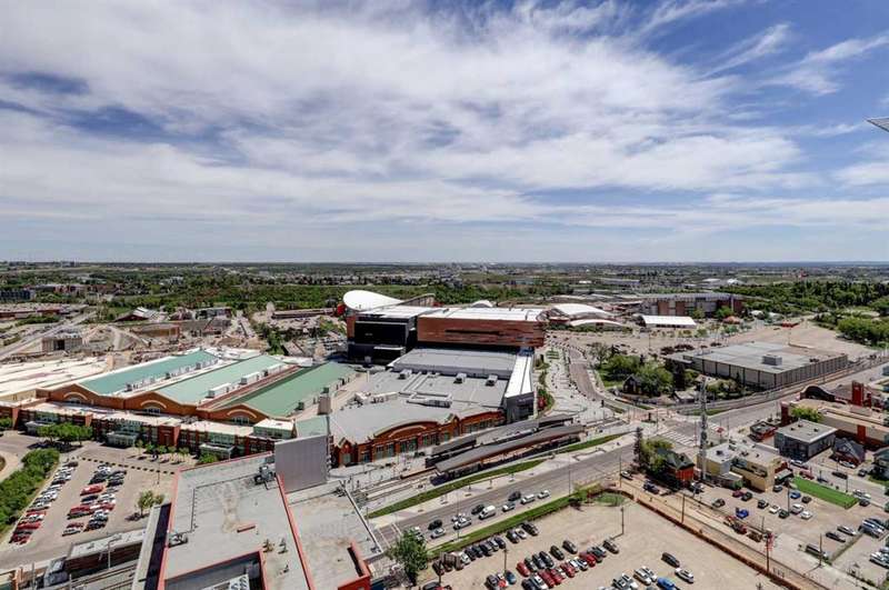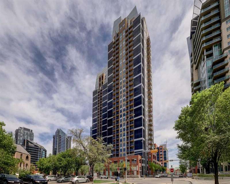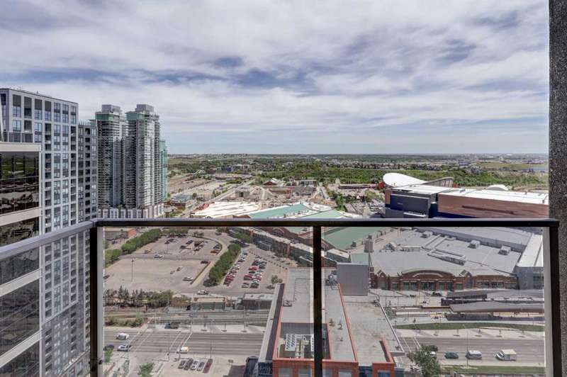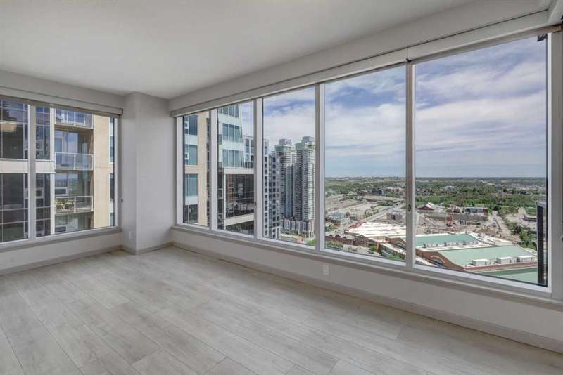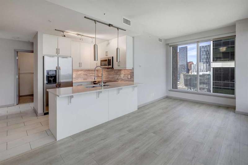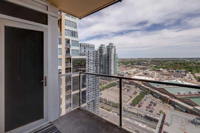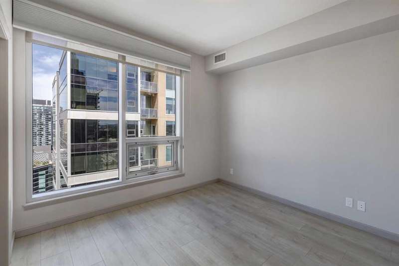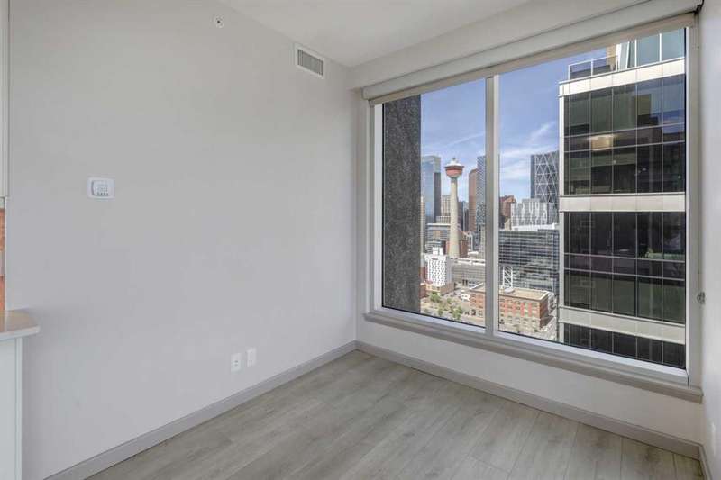 Experience Elevated Urban Living. 27 Floors Above the Heart of Downtown Calgary. Welcome to your sky-high sanctuary in one of Calgary’s most sought-after downtown addresses. Perched on the 27th floor, this 2-bedroom, 2-bathroom condo offers breathtaking panoramic views of the city skyline through floor-to-ceiling windows—an ever-changing backdrop of urban energy and stunning sunsets. Designed for comfort and sophistication, the windows are professionally tinted for added privacy and temperature control, while custom blackout blinds ensure restful nights whenever you need them. The sleek, modern interior features wide plank vinyl flooring, a spacious comfortable layout, and refined finishes throughout, creating a stylish canvas to suit your lifestyle. The kitchen flows effortlessly into the living area, perfect for entertaining or relaxing with a view. Each bedroom offers its own retreat, with the primary suite including a private ensuite and walk in closet. The second full bathroom is equally well-appointed and ideal for guests or roommates. Enjoy the convenience of in-suite laundry, secure building access, and everything you need just steps from your front door. Live where the city comes alive—restaurants, nightlife, cafes, the river path, and office towers are all within walking distance. Whether you're a young professional seeking the ultimate work-live-play location or simply craving an elevated urban lifestyle, this residence delivers luxury, convenience, and unmatched skyline views from sunrise to nightfall. This is more than a condo—it’s your window to the best of Calgary.