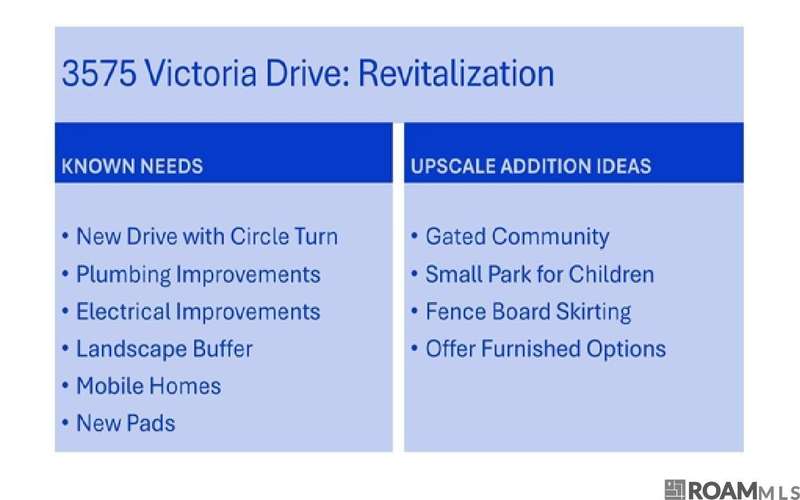 Welcome to 3575 Victoria Drive, a unique opportunity to revitalize a once-thriving mobile home community. Nestled on a spacious tract, this property holds incredible potential to become a fully operational and income-producing mobile home park once again. Priced with the infrastructure needs in mind. Whether you're an investor seeking cash flow or a developer with a vision for affordable housing, this property is ready to be transformed. Located in a convenient area with growth potential, 3575 Victoria Drive offers both long term or flip opportunity. Breathe new lift into this promising space. Owner Agent Investor Opportunity
