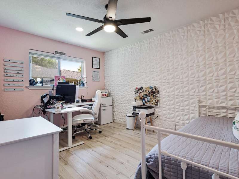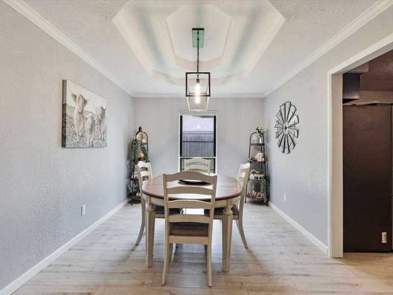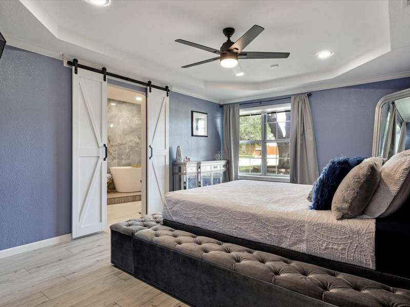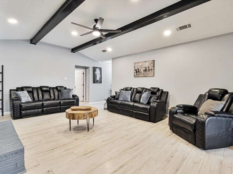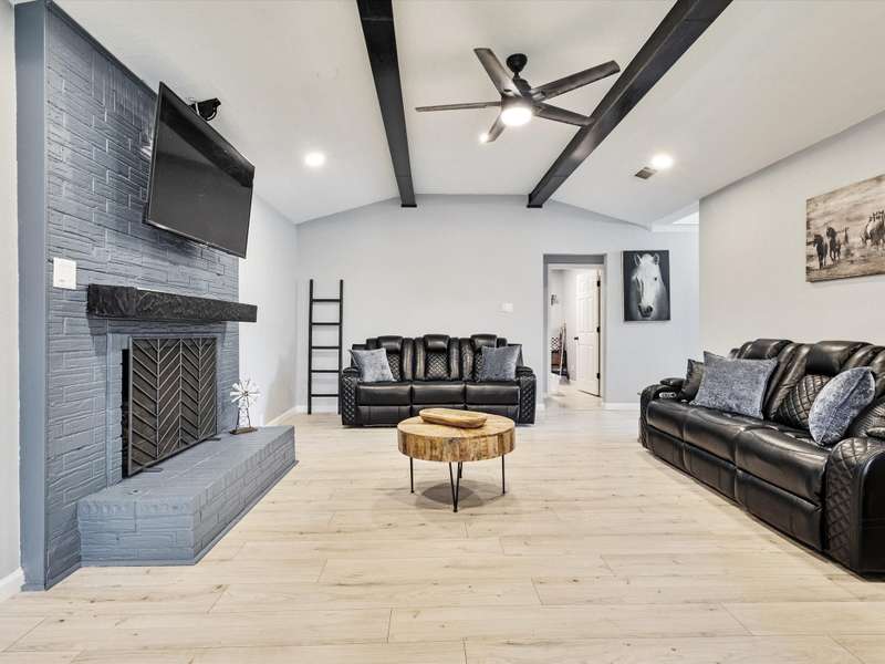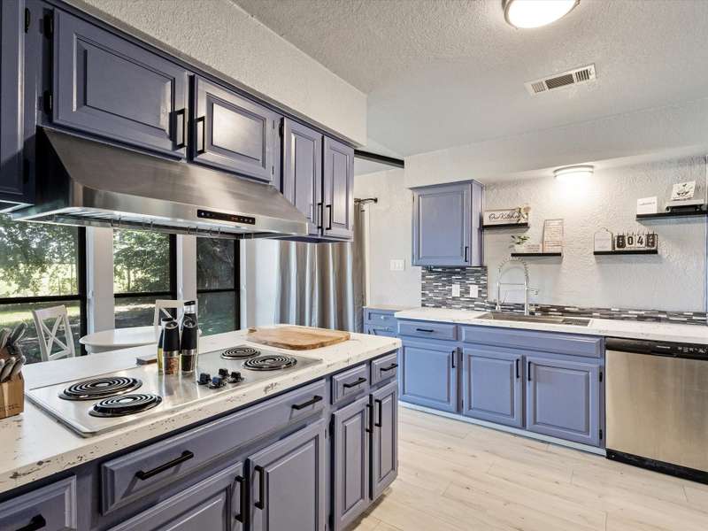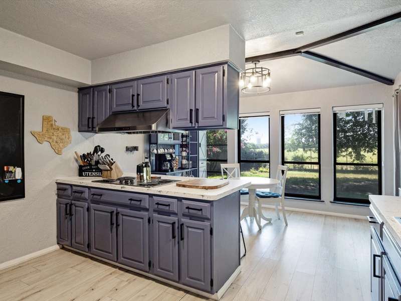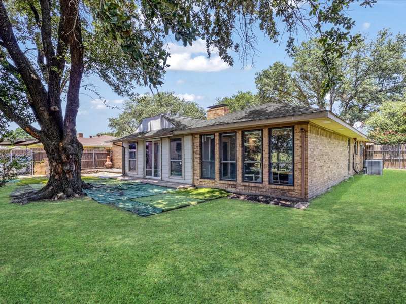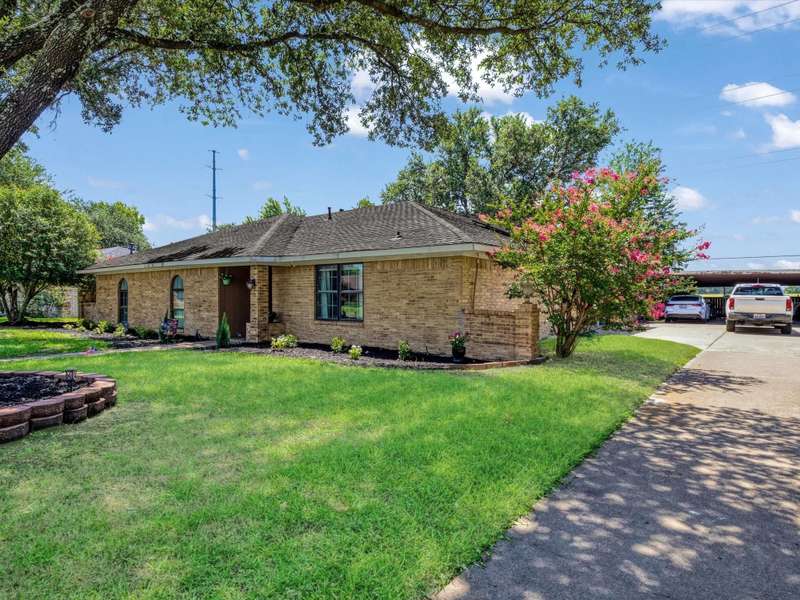 Brand new roof! Solar Panels will be paid off! Welcome to this beautifully updated one-story ranch-style home located in the highly sought-after Sunnyvale Independent School District. Set on a lush, manicured lot with vibrant St. Augustine grass, mature trees, and striking curb appeal, this home makes a memorable first impression with its custom front door featuring a glass inlay. Inside, youll find a warm and inviting interior with extensive luxury vinyl plank flooring, ceramic tile, black-framed windows, ceiling fans, and decorative lighting throughout. The spacious family room is the heart of the home, showcasing a painted brick gas fireplace and a stunning wood-beamed ceiling. The gourmet kitchen offers double ovens, a sleek single-bowl stainless steel sink, floating shelves, and a seamless flow into the breakfast area, which is bathed in natural light from walls of windows and enhanced by vaulted, beamed ceilings. Retreat to the luxurious primary suite featuring a trayed ceiling and a stylish rolling barn door leading to a spa-like bath. The ensuite includes a frameless walk-in shower, freestanding soaking tub, porcelain accent walls, framed mirrors, and a spacious walk-in closet. Step outside to a backyard built for entertaining and play, with ample space to roam. Additional features include a large unfinished bonus room offering endless possibilities, a storage shed, and a 28x28 carportperfect for extra vehicles, a boat, or an RV. This energy-efficient home is equipped with solar panels, a newer water heater, new HVAC system, and ceiling fans throughoutdesigned to keep utility costs low and comfort levels high. Don't miss this rare opportunity to own a thoughtfully updated home combining style, function, and sustainability in one of Sunnyvales most desirable neighborhoods.